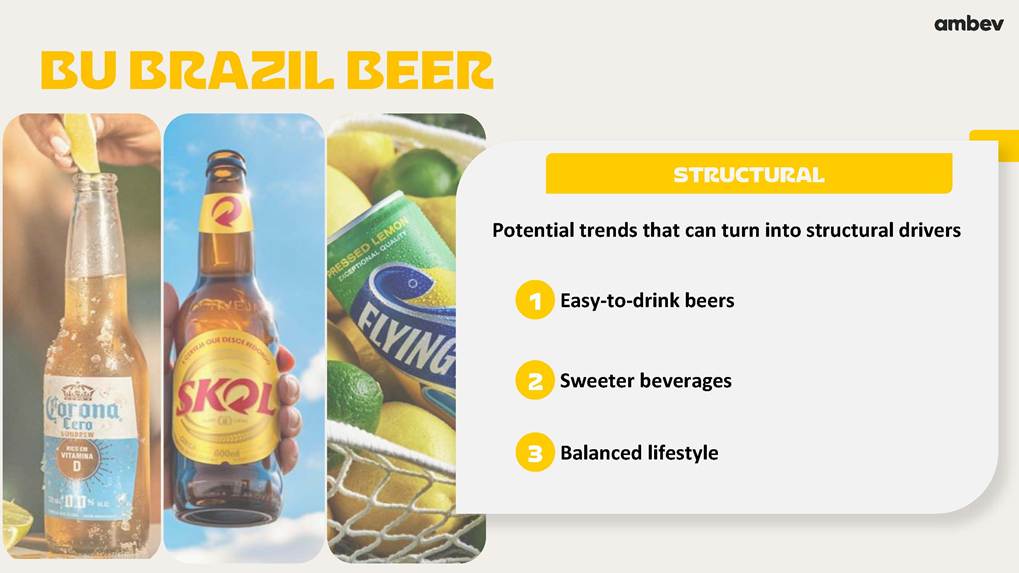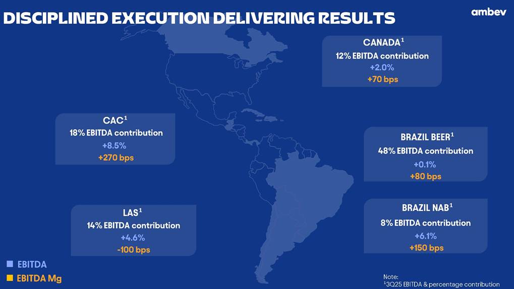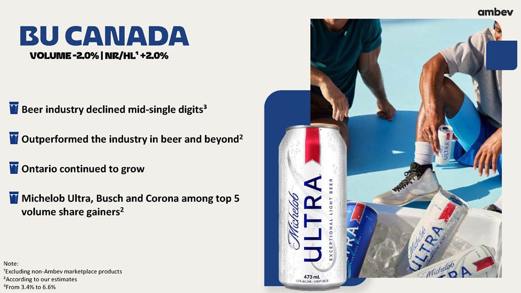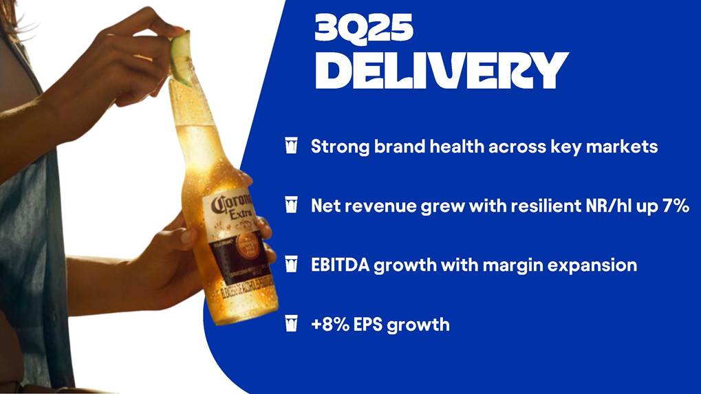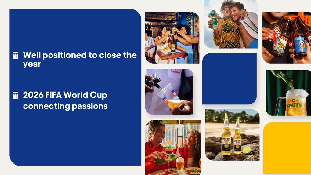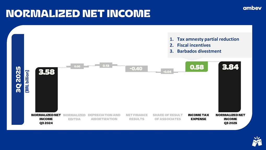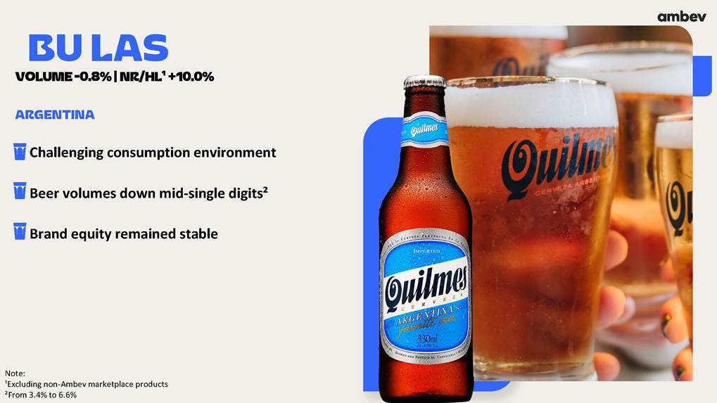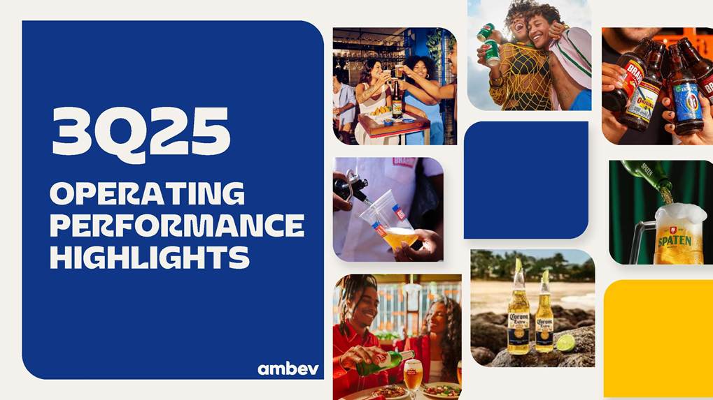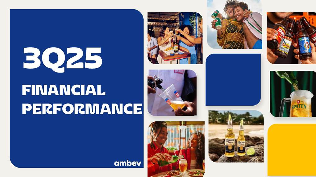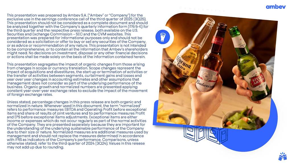 Earnings Call 3Q25 This presentation was prepared by Ambev S.A. (“Ambev” or “Company”) for the exclusive use in the earnings conference call of the third quarter of 2025 (3Q25). This presentation should not be considered as a complete document and should be analyzed together with the Company’s quarterly information form (ITR/6-K) for the third quarter and the respective press release, both available on the U.S. Securities and Exchange Commission –SEC and the CVM websites. This presentation was prepared for informational purposes only and should not be considered as a solicitation or offer to buy or sell any securities of the Company, or as advice or recommendation of any nature. This presentation is not intended to be comprehensive, or to contain all the information that Ambev’s shareholders might need. No decisions on investment, disposal or any other financial decisions or actions shall be made solely on the basis ofthe information contained herein. This presentation segregates the impact of organic changes from those arising from changes in scope or currency translation. Scope changes represent the impact of acquisitions and divestitures, the start up or termination of activities or the transfer of activities between segments, curtailment gains and losses and year over year changes in accounting estimates and other assumptions that management does not consider as part of the underlying performance of the business. Organic growth and normalized numbers are presented applying constant year-over-year exchange rates to exclude the impact of the movement of foreign exchange rates. Unless stated, percentage changes in this press release are both organic and normalized in nature. Whenever used in this document, the term “normalized” refers to performance measures EBITDA and Operating Profit before exceptional items and share of results of joint ventures and to performance measures Profit and EPS before exceptional items adjustments. Exceptional items are either income or expenses which do not occur regularly as part of the normal activities of the Company. They are presented separately because they are important for the understanding of the underlying sustainable performance of the Company due to their size or nature. Normalized measures are additional measures used by management and should not replace the measures determined in accordance with IFRS as indicators of the Company’s performance. Comparisons, unless otherwise stated, refer to the third quarter of 2024 (3Q24). Values in this release may not add up due to rounding. 3Q25 Operating Performance highlights 3Q25 Delivery +8% EPS growth EBITDA growth with margin expansion Net revenue grew with resilient NR/hl up 7% Strong brand health across key markets 2025 Year-to-date perspective +7% EPS growth Cash COGS/hl grew below NR/hl EBITDA growth with margin expansion Topline growth with resilient NR/hl +Share buyback program of R$2.5 billion Growth strategy Growth strategy Lead the beer category Growth strategy Shape new avenues of growth Balanced choices ahead of total volume Core brands resilient with higher industry sensitivity Premium & Super Premium volumes up more than 9% Growth strategy Growth strategy bees Ze delivery • ZéDelivery GMV +7% • +9% AOV • BEESMarketplace strong momentum • BRL 8.0 billion annualized GMV Digital ecosystem powering insights and growth More assertive and data-driven decisions Elasticity insights by brand, pack and customer Improved distribution and production efficiency Growth strategy Growth strategy Cost discipline continues to be essential Efficiency efforts offset expected cost pressure Resources freed up to invest in our business CAC¹ +8.5% +270 bps 18% EBITDA contribution LAS¹ +4.6% -100 bps 14% EBITDA contribution CANADA¹ +2.0% +70 bps 12% EBITDA contribution BRAZIL BEER¹ +0.1% +80 bps 48% EBITDA contribution BRAZIL NAB¹ +6.1% +150 bps 8% EBITDA contribution Disciplined execution delivering results EBITDA EBITDA Mg Note: ¹3Q25 EBITDA & percentage contribution • Industry softness continued • Situational and structural factors • Category equity improved BU Brazil Beer CATEGORY INSIGHTS situational • Consumer purchasing power remained under pressure 2 1• Weather: colder-than-normal winter BU Brazil Beer Fewer occasions, particularly in the on-trade structural 1• Easy-to-drink beers 2• Sweeter beverages 3• Balanced lifestyle BU Brazil Beer Potential trends that can turn into structural drivers • Volume decline 100% explained by industry • Improved brand equity • Gained market share across all relevant segments • Core down low-teens³ & price relativity improved • Premium & Super Premium highest share levels since 2015² • Balanced choices maintainedmomentum Note: ¹Excluding non-Ambev marketplace products ²According to our estimates ³From 10.1% to 13.3% BU Brazil Beer Volume -7.7% | NR/hl¹ +5.7% Volume -8.6% | NR/hl +10.0% BU Brazil NAB • CSD industry decelerated • Market share stable to slightly down¹ • NR/hl above inflation • No-sugar portfolio up double digits² Note: ¹ According to our estimates ² From 10.0% to 19.9% BU LAS ARGENTINA Volume -0.8% | NR/hl¹+10.0% • Challenging consumption environment • Beer volumes down mid-single digits² • Brand equity remained stable Note: ¹Excluding non-Ambev marketplace products ²From 3.4% to 6.6% Dominican Republic BU CAC Volume +1.3% | NR/hl¹+1.4% • Operating environment improved sequentially • Beer share of throat increased2 • Healthier price relativity across categories • Presidente strengthened equity and reinforced leadership Note: ¹Excluding non-Ambev marketplace products ²According to our estimates Bu canada Volume -2.0% | NR/hl¹+2.0% • Beer industry declined mid-single digits³ • Outperformed the industry in beer and beyond2 • Ontario continued to grow • Michelob Ultra, Busch and Corona among top 5 volume share gainers2 Note: ¹Excluding non-Ambev marke