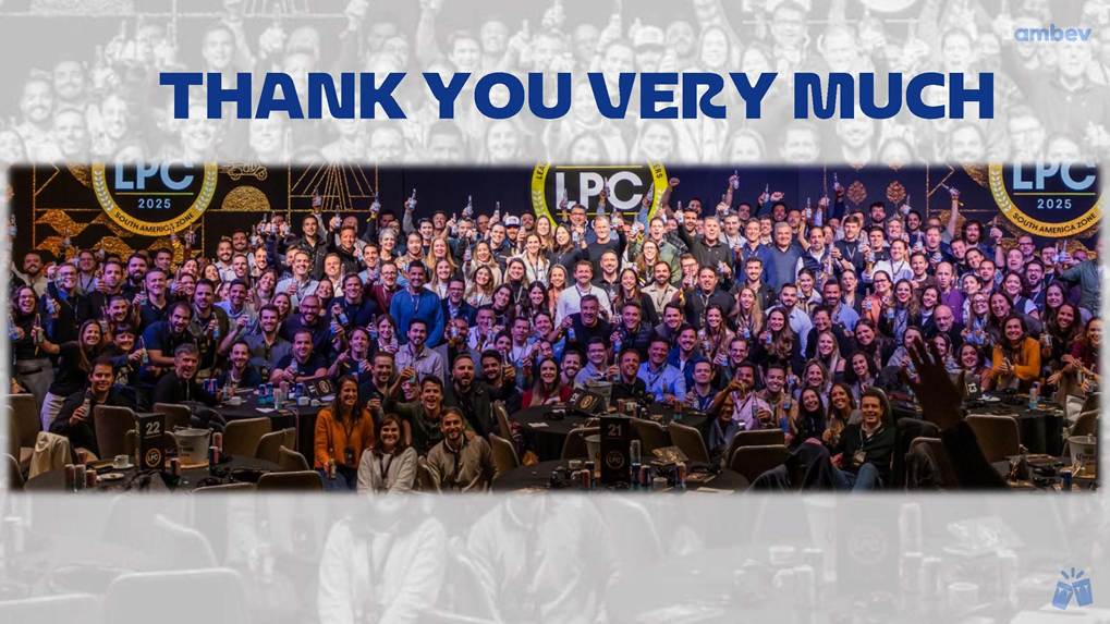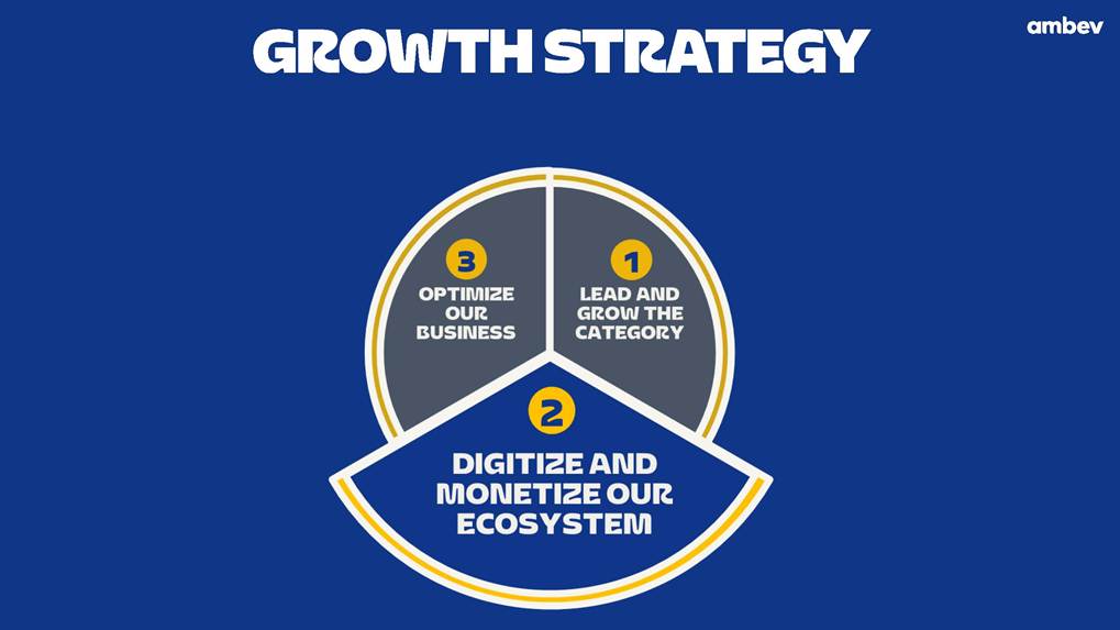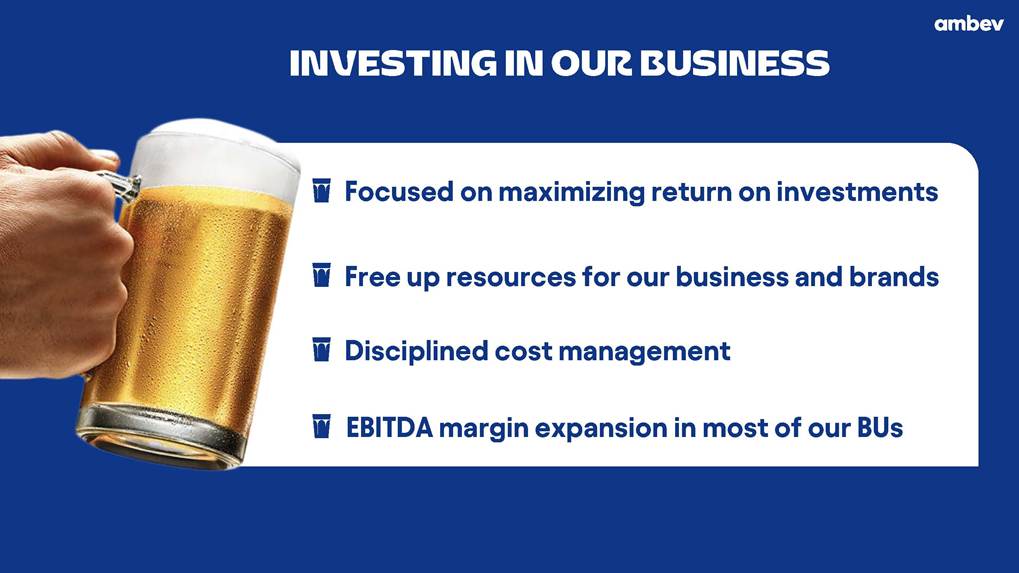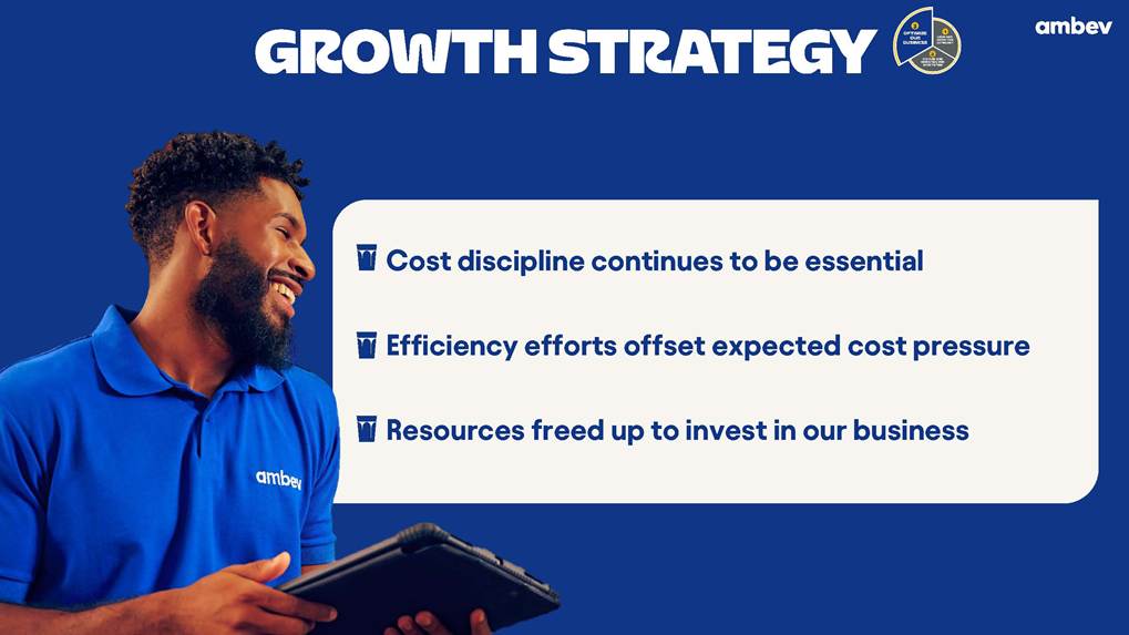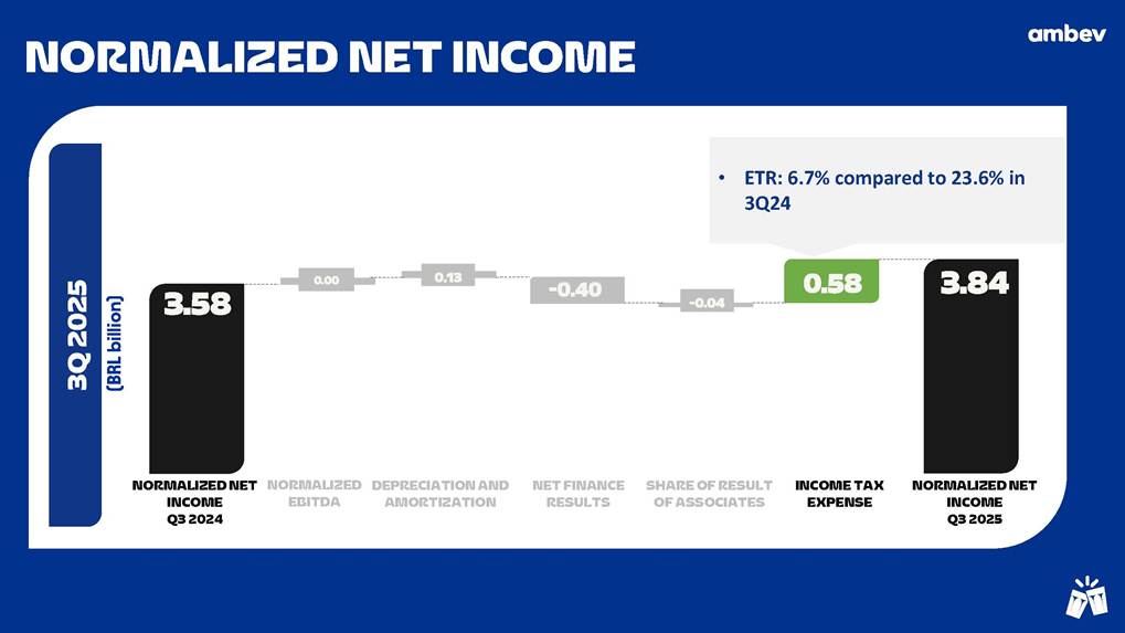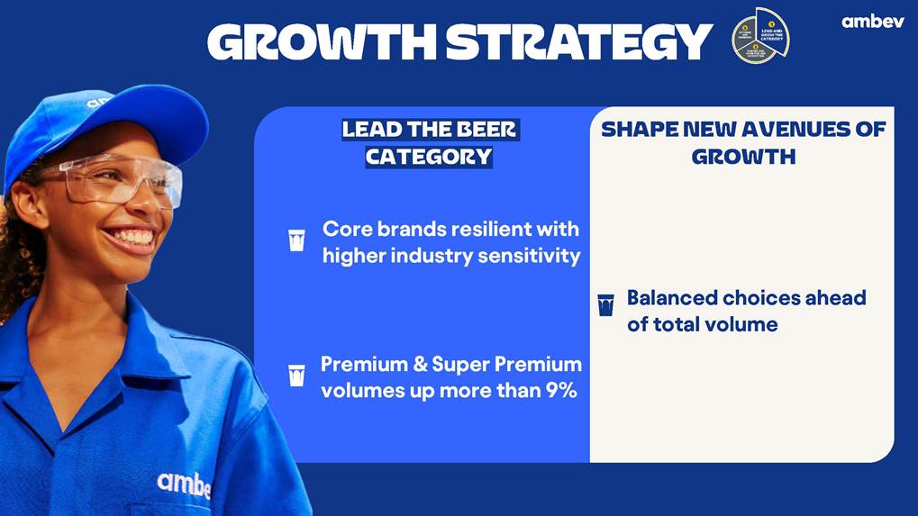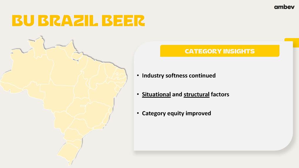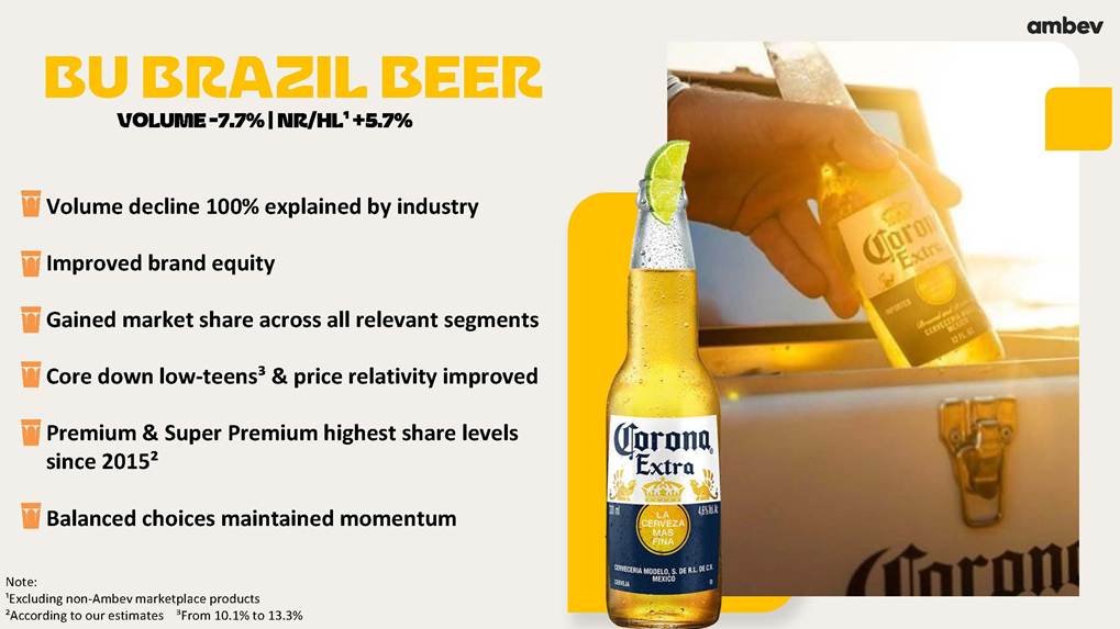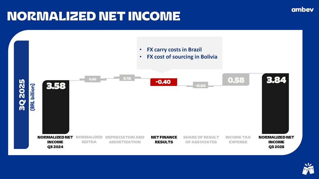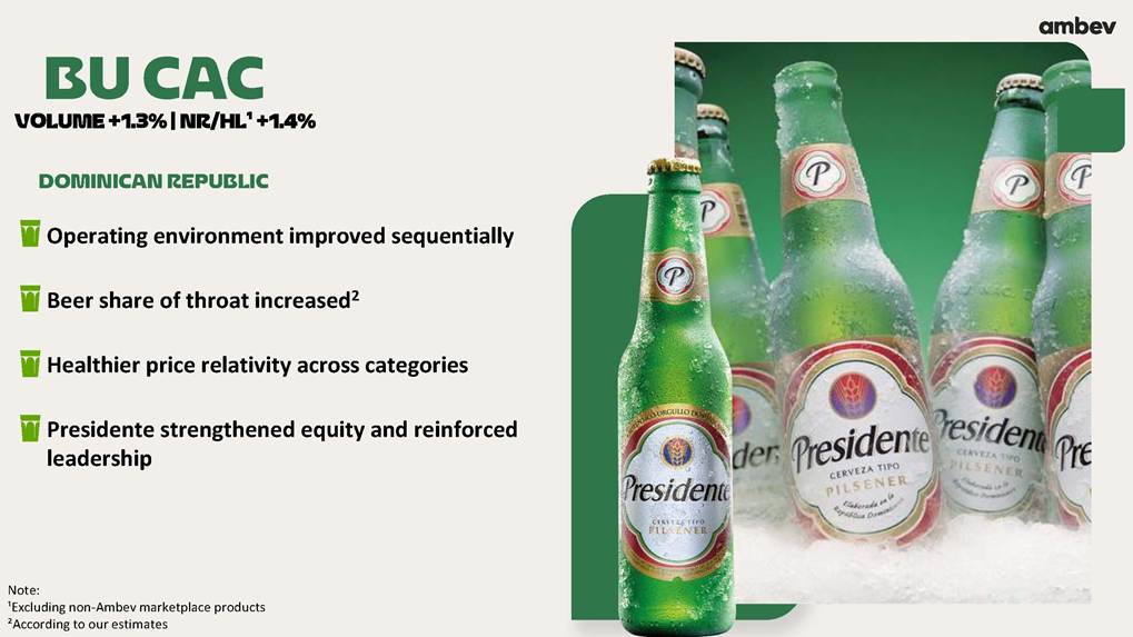 Earnings Call 3Q25 This presentation was prepared by Ambev S.A. (“Ambev” or “Company”) for the exclusive use in the earnings conference call of the third quarter of 2025 (3Q25). This presentation should not be considered as a complete document and should be analyzed together with the Company’s quarterly information form (ITR/6-K) for the third quarter and the respective press release, both available on the U.S. Securities and Exchange Commission –SEC and the CVM websites. This presentation was prepared for informational purposes only and should not be considered as a solicitation or offer to buy or sell any securities of the Company, or as advice or recommendation of any nature. This presentation is not intended to be comprehensive, or to contain all the information that Ambev’s shareholders might need. No decisions on investment, disposal or any other financial decisions or actions shall be made solely on the basis ofthe information contained herein. This presentation segregates the impact of organic changes from those arising from changes in scope or currency translation. Scope changes represent the impact of acquisitions and divestitures, the start up or termination of activities or the transfer of activities between segments, curtailment gains and losses and year over year changes in accounting estimates and other assumptions that management does not consider as part of the underlying performance of the business. Organic growth and normalized numbers are presented applying constant year-over-year exchange rates to exclude the impact of the movement of foreign exchange rates. Unless stated, percentage changes in this press release are both organic and normalized in nature. Whenever used in this document, the term “normalized” refers to performance measures EBITDA and Operating Profit before exceptional items and share of results of joint ventures and to performance measures Profit and EPS before exceptional items adjustments. Exceptional items are either income or expenses which do not occur regularly as part of the normal activities of the Company. They are presented separately because they are important for the understanding of the underlying sustainable performance of the Company due to their size or nature. Normalized measures are additional measures used by management and should not replace the measures determined in accordance with IFRS as indicators of the Company’s performance. Comparisons, unless otherwise stated, refer to the third quarter of 2024 (3Q24). Values in this release may not add up due to rounding. 3Q25 Operating Performance highlights 3Q25 Delivery +8% EPS growth EBITDA growth with margin expansion Net revenue grew with resilient NR/hl up 7% Strong brand health across key markets 2025 Year-to-date perspective +7% EPS growth Cash COGS/hl grew below NR/hl EBITDA growth with margin expansion Topline growth with resilient NR/hl +Share buyback program of R$2.5 billion Growth strategy Growth strategy Lead the beer category Growth strategy Shape new avenues of growth Balanced choices ahead of total volume Core brands resilient with higher industry sensitivity Premium & Super Premium volumes up more than 9% Growth strategy Growth strategy bees Ze delivery • ZéDelivery GMV +7% • +9% AOV • BEESMarketplace strong momentum • BRL 8.0 billion annualized GMV Digital ecosystem powering insights and growth More assertive and data-driven decisions Elasticity insights by brand, pack and customer Improved distribution and production efficiency Growth strategy Growth strategy Cost discipline continues to be essential Efficiency efforts offset expected cost pressure Resources freed up to invest in our business CAC¹ +8.5% +270 bps 18% EBITDA contribution LAS¹ +4.6% -100 bps 14% EBITDA contribution CANADA¹ +2.0% +70 bps 12% EBITDA contribution BRAZIL BEER¹ +0.1% +80 bps 48% EBITDA contribution BRAZIL NAB¹ +6.1% +150 bps 8% EBITDA contribution Disciplined execution delivering results EBITDA EBITDA Mg Note: ¹3Q25 EBITDA & percentage contribution • Industry softness continued • Situational and structural factors • Category equity improved BU Brazil Beer CATEGORY INSIGHTS situational • Consumer purchasing power remained under pressure 2 1• Weather: colder-than-normal winter BU Brazil Beer Fewer occasions, particularly in the on-trade structural 1• Easy-to-drink beers 2• Sweeter beverages 3• Balanced lifestyle BU Brazil Beer Potential trends that can turn into structural drivers • Volume decline 100% explained by industry • Improved brand equity • Gained market share across all relevant segments • Core down low-teens³ & price relativity improved • Premium & Super Premium highest share levels since 2015² • Balanced choices maintainedmomentum Note: ¹Excluding non-Ambev marketplace products ²According to our estimates ³From 10.1% to 13.3% BU Brazil Beer Volume -7.7% | NR/hl¹ +5.7% Volume -8.6% | NR/hl +10.0% BU Brazil NAB • CSD industry decelerated • Market share stable to slightly down¹ • NR/hl above inflation • No-sugar portfolio up double digits² Note: ¹ According to our estimates ² From 10.0% to 19.9% BU LAS ARGENTINA Volume -0.8% | NR/hl¹+10.0% • Challenging consumption environment • Beer volumes down mid-single digits² • Brand equity remained stable Note: ¹Excluding non-Ambev marketplace products ²From 3.4% to 6.6% Dominican Republic BU CAC Volume +1.3% | NR/hl¹+1.4% • Operating environment improved sequentially • Beer share of throat increased2 • Healthier price relativity across categories • Presidente strengthened equity and reinforced leadership Note: ¹Excluding non-Ambev marketplace products ²According to our estimates Bu canada Volume -2.0% | NR/hl¹+2.0% • Beer industry declined mid-single digits³ • Outperformed the industry in beer and beyond2 • Ontario continued to grow • Michelob Ultra, Busch and Corona among top 5 volume share gainers2 Note: ¹Excluding non-Ambev marke