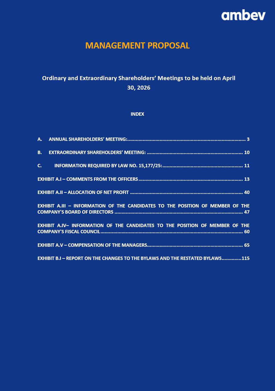 We hereby present the following Management Proposal regarding the matters set forth in the agenda for the Ordinary and Extraordinary Shareholders’ Meetings of Ambev S.A. (“Company” and “AGOE”, respectively) to be held, cumulatively, on April 30, 2026, at 2:00 p.m. (“Proposal”):