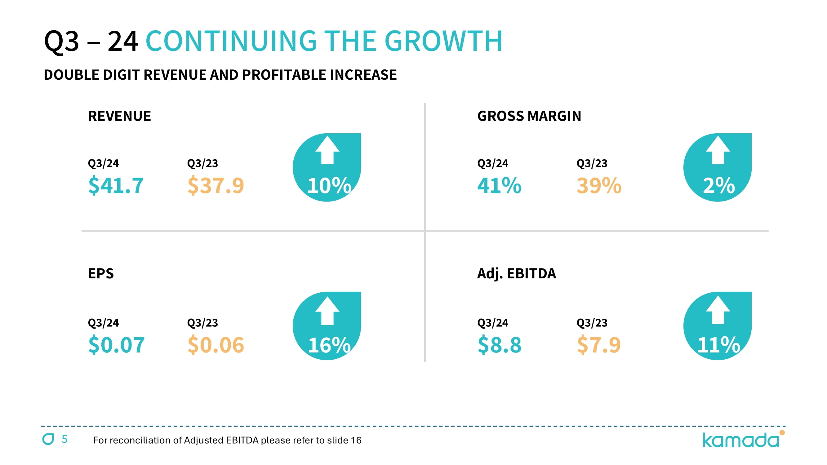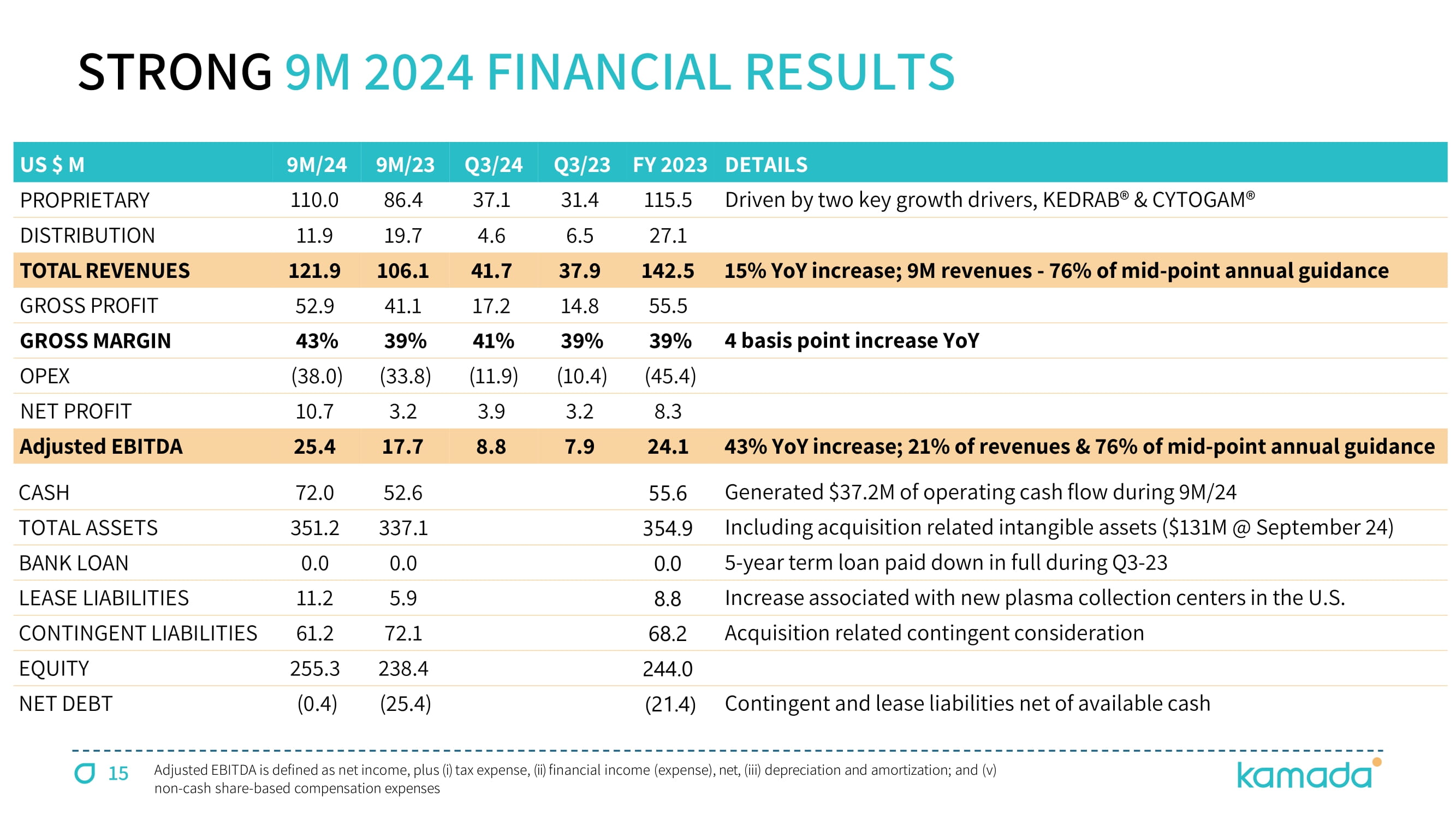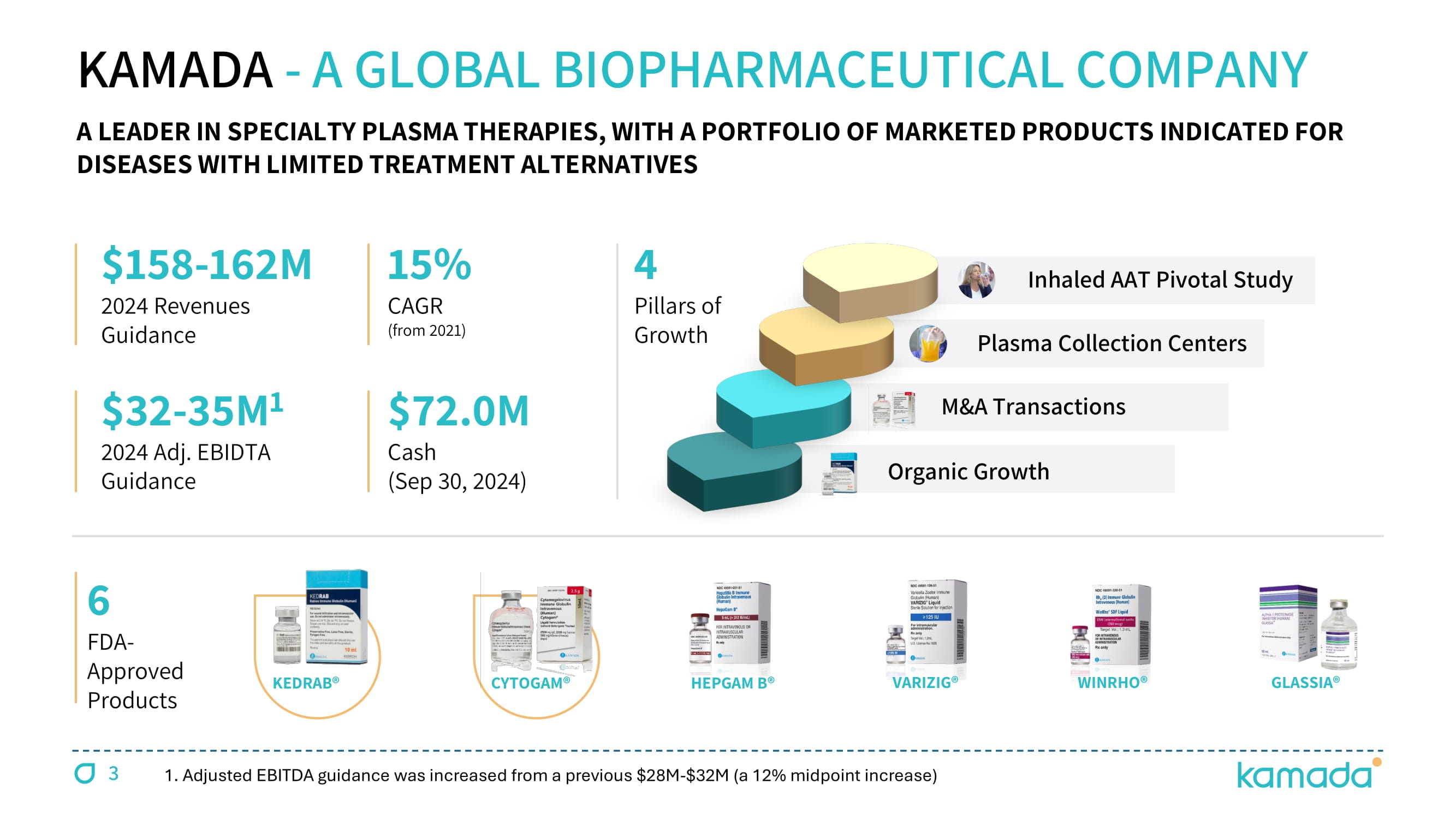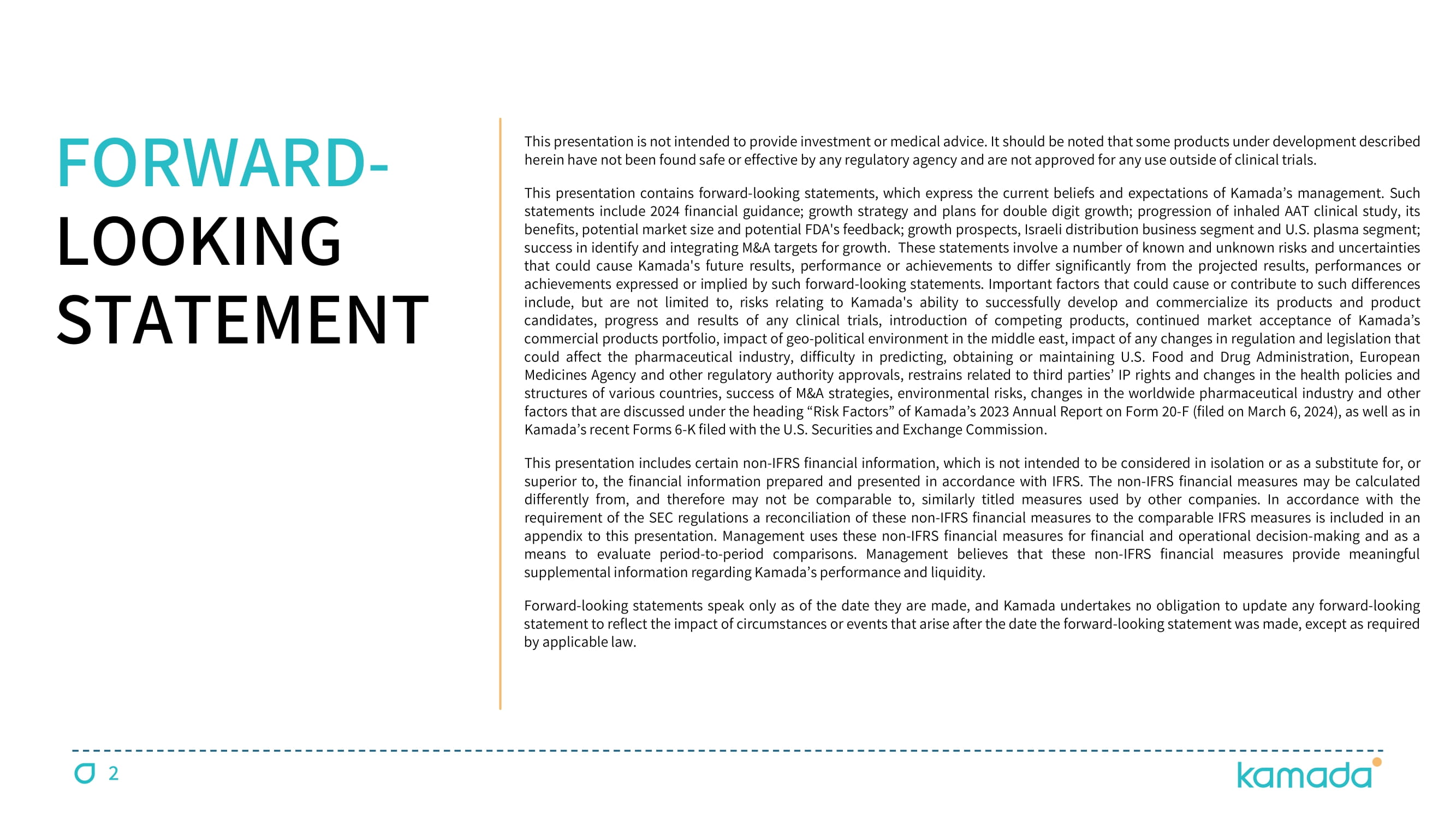 FORWARD - LOOKING STATEMENT This presentation is not intended to provide investment or medical advice . It should be noted that some products under development described herein have not been found safe or effective by any regulatory agency and are not approved for any use outside of clinical trials . This presentation contains forward - looking statements, which express the current beliefs and expectations of Kamada ’ s management . Such statements include 2024 financial guidance ; growth strategy and plans for double digit growth ; progression of inhaled AAT clinical study, its benefits, potential market size and potential FDA's feedback ; growth prospects, Israeli distribution business segment and U . S . plasma segment ; success in identify and integrating M&A targets for growth . These statements involve a number of known and unknown risks and uncertainties that could cause Kamada's future results, performance or achievements to differ significantly from the projected results, performances or achievements expressed or implied by such forward - looking statements . Important factors that could cause or contribute to such differences include, but are not limited to, risks relating to Kamada's ability to successfully develop and commercialize its products and product candidates, progress and results of any clinical trials, introduction of competing products, continued market acceptance of Kamada ’ s commercial products portfolio, impact of geo - political environment in the middle east, impact of any changes in regulation and legislation that could affect the pharmaceutical industry, difficulty in predicting, obtaining or maintaining U . S . Food and Drug Administration, European Medicines Agency and other regulatory authority approvals, restrains related to third parties ’ IP rights and changes in the health policies and structures of various countries, success of M&A strategies, environmental risks, changes in the worldwide pharmaceutical industry and other factors that are discussed under the heading “ Risk Factors ” of Kamada ’ s 2023 Annual Report on Form 20 - F (filed on March 6 , 2024 ), as well as in Kamada ’ s recent Forms 6 - K filed with the U . S . Securities and Exchange Commission . This presentation includes certain non - IFRS financial information, which is not intended to be considered in isolation or as a substitute for, or superior to, the financial information prepared and presented in accordance with IFRS . The non - IFRS financial measures may be calculated differently from, and therefore may not be comparable to, similarly titled measures used by other companies . In accordance with the requirement of the SEC regulations a reconciliation of these non - IFRS financial measures to the comparable IFRS measures is included in an appendix to this presentation . Management uses these non - IFRS financial measures for financial and operational decision - making and as a means to evaluate period - to - period comparisons . Management believes that these non - IFRS financial measures provide meaningful supplemental information regarding Kamada ’ s performance and liquidity . Forward - looking statements speak only as of the date they are made, and Kamada undertakes no obligation to update any forward - looking statement to reflect the impact of circumstances or events that arise after the date the forward - looking statement was made, except as required by applicable law . 2