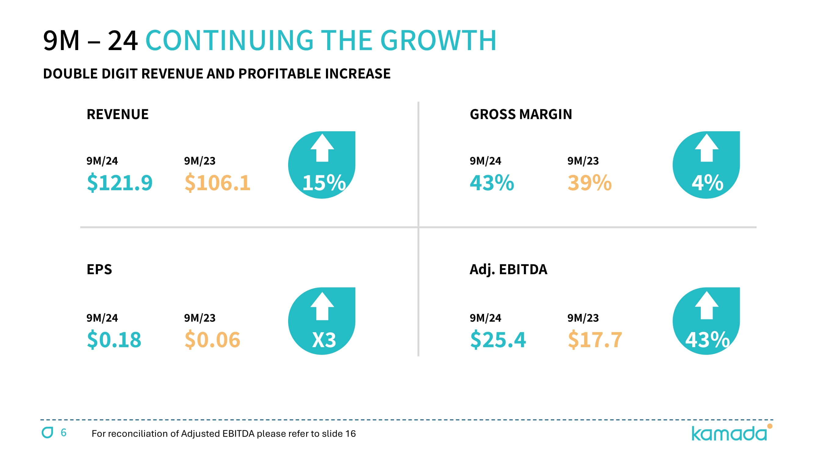 15 DETAILS FY 2023 Q3/23 Q3/24 9M/23 9M/24 US $ M Driven by two key growth drivers, KEDRAB® & CYTOGAM® 115.5 31.4 37.1 86.4 110.0 PROPRIETARY 27.1 6.5 4.6 19.7 11.9 DISTRIBUTION 15% YoY increase; 9M revenues - 76% of mid - point annual guidance 142.5 37.9 41.7 106.1 121.9 TOTAL REVENUES 55.5 14.8 17.2 41.1 52.9 GROSS PROFIT 4 basis point increase YoY 39 % 39 % 41 % 39 % 43 % GROSS MARGIN ( 45.4 ) ( 10.4 ) ( 11.9 ) ( 33.8 ) ( 38.0 ) OPEX 8.3 3.2 3.9 3.2 10.7 NET PROFIT 43% YoY increase; 21% of revenues & 76% of mid - point annual guidance 24.1 7.9 8.8 17.7 25.4 Adjusted EBITDA Generated $37.2M of operating cash flow during 9M/24 55.6 52.6 72.0 CASH Including acquisition related intangible assets ($131M @ September 24) 354.9 337.1 351.2 TOTAL ASSETS 5 - year term loan paid down in full during Q3 - 23 0.0 0.0 0.0 BANK LOAN Increase associated with new plasma collection centers in the U.S. 8.8 5.9 11.2 LEASE LIABILITIES Acquisition related contingent consideration 68.2 72.1 61.2 CONTINGENT LIABILITIES 244.0 238.4 255.3 EQUITY Contingent and lease liabilities net of available cash ( 21.4 ) ( 25.4 ) ( 0.4 ) NET DEBT Adjusted EBITDA is defined as net income, plus ( i ) tax expense, (ii) financial income (expense), net, (iii) depreciation and amortization ; and (v) non - cash share - based compensation expenses STRONG 9 M 2024 FINANCIAL RESULTS