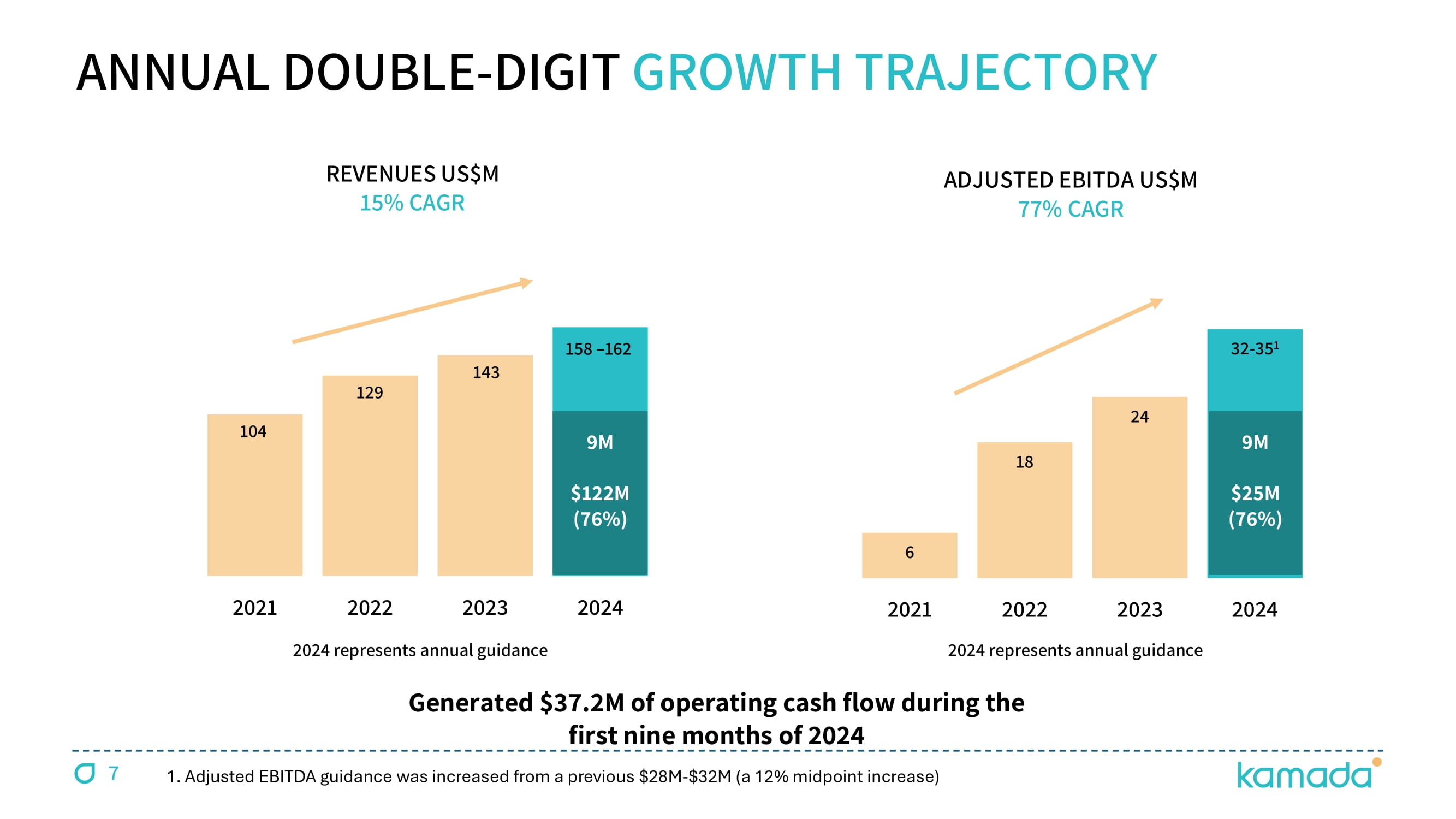 6 18 24 32 - 35 1 2021 2022 2023 2024 104 129 143 158 – 162 2021 2022 2023 2024 ADJUSTED EBITDA US$M 77% CAGR 2024 represents annual guidance 2024 represents annual guidance ANNUAL DOUBLE - DIGIT GROWTH TRAJECTORY REVENUES US$M 15% CAGR 9 M $ 122 M ( 76 %) 7 9 M $ 25 M ( 76 %) 1. Adjusted EBITDA guidance was increased from a previous $28M - $32M (a 12% midpoint increase) Generated $37.2M of operating cash flow during the first nine months of 2024