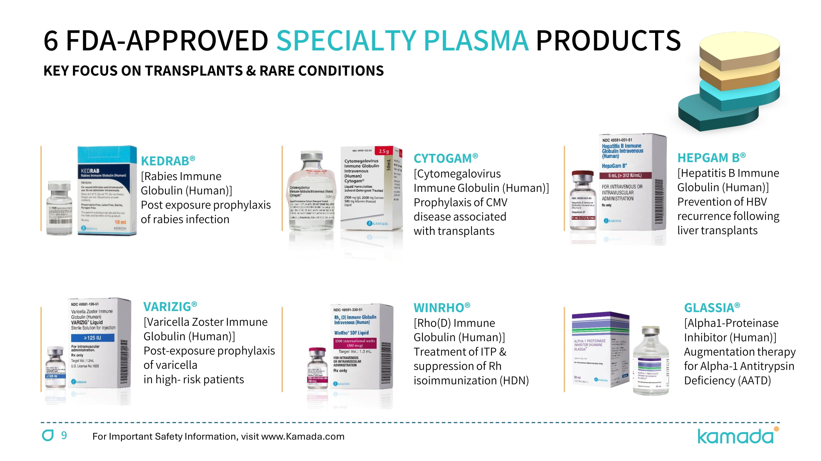 9 6 FDA - APPROVED SPECIALTY PLASMA PRODUCTS KEDRAB® [Rabies Immune Globulin (Human)] Post exposure prophylaxis of rabies infection CYTOGAM® [Cytomegalovirus Immune Globulin (Human)] Prophylaxis of CMV disease associated with transplants HEPGAM B® [Hepatitis B Immune Globulin (Human)] Prevention of HBV recurrence following liver transplants VARIZIG® [Varicella Zoster Immune Globulin (Human)] Post - exposure prophylaxis of varicella in high - risk patients WINRHO® [Rho(D) Immune Globulin (Human)] Treatment of ITP & suppression of Rh isoimmunization (HDN) KEY FOCUS ON TRANSPLANTS & RARE CONDITIONS For Important Safety Information, visit www.Kamada.com GLASSIA® [Alpha 1 - Proteinase Inhibitor (Human)] Augmentation therapy for Alpha - 1 Antitrypsin Deficiency (AATD)