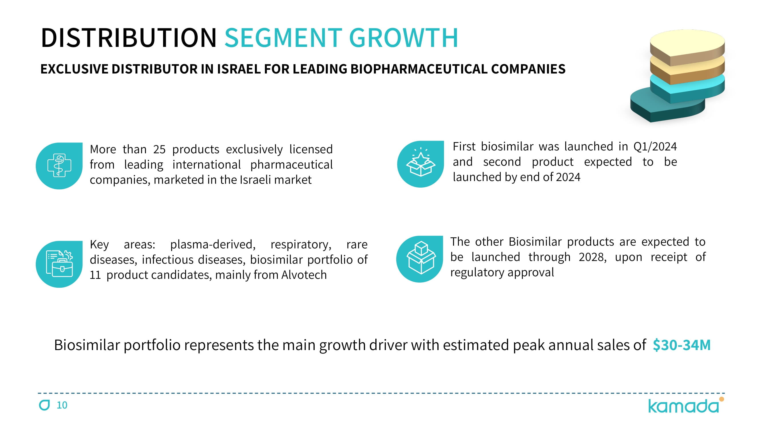 DISTRIBUTION SEGMENT GROWTH More than 25 products exclusively licensed from leading international pharmaceutical companies, marketed in the Israeli market EXCLUSIVE DISTRIBUTOR IN ISRAEL FOR LEADING BIOPHARMACEUTICAL COMPANIES Key areas : plasma - derived, respiratory, rare diseases, infectious diseases, biosimilar portfolio of 11 product candidates, mainly from Alvotech First biosimilar was launched in Q 1 / 2024 and second product expected to be launched by end of 2024 The other Biosimilar products are expected to be launched through 2028 , upon receipt of regulatory approval Biosimilar portfolio represents the main growth driver with estimated peak annual sales of $30 - 34M 10