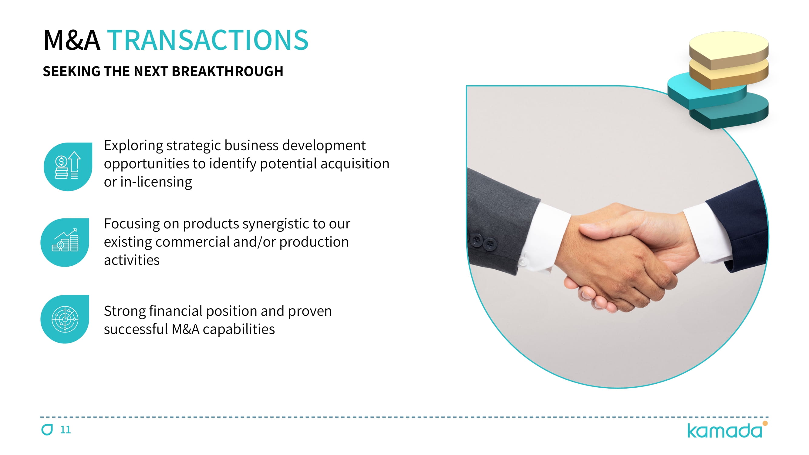 11 M&A TRANSACTIONS SEEKING THE NEXT BREAKTHROUGH Exploring strategic business development opportunities to identify potential acquisition or in - licensing Focusing on products synergistic to our existing commercial and/or production activities Strong financial position and proven successful M&A capabilities
