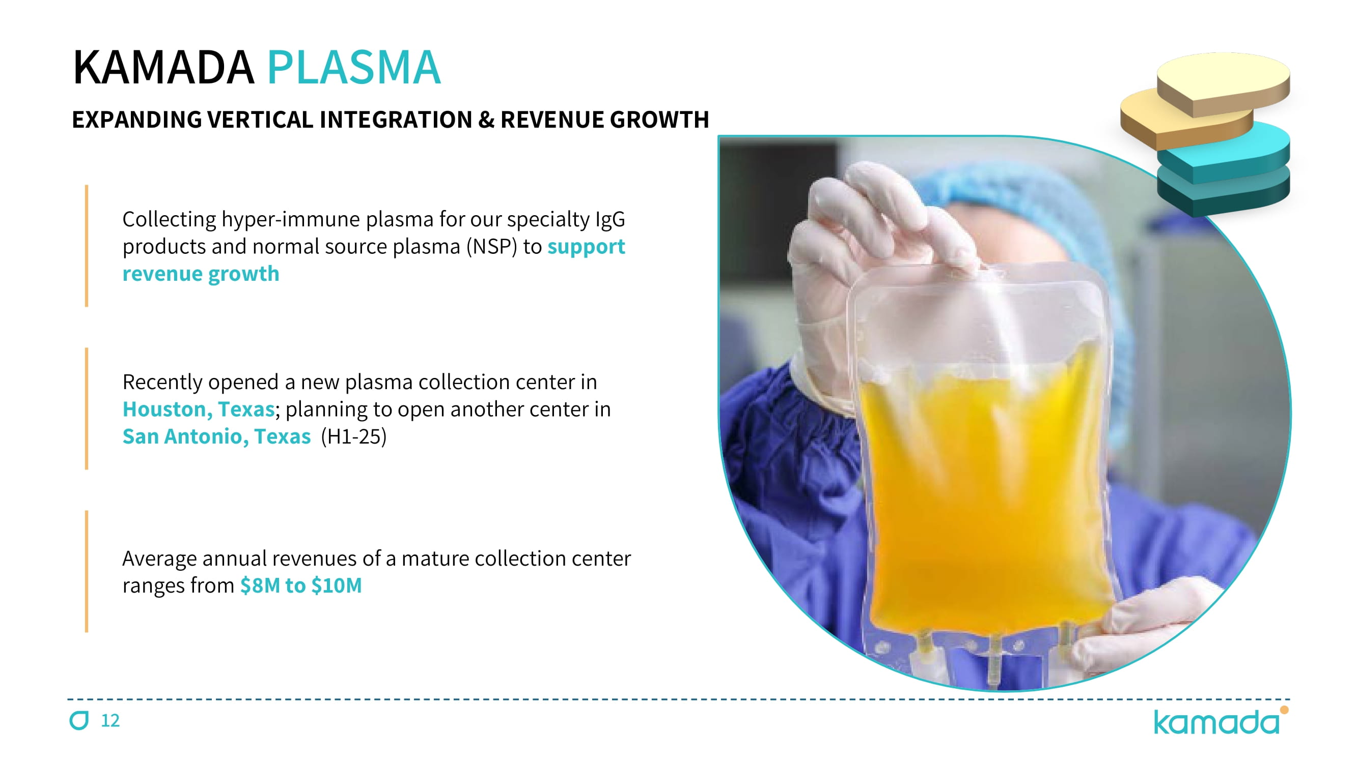 12 KAMADA PLASMA EXPANDING VERTICAL INTEGRATION & REVENUE GROWTH Collecting hyper - immune plasma for our specialty IgG products and normal source plasma (NSP) to support revenue growth Recently opened a new plasma collection center in Houston, Texas ; planning to open another center in San Antonio, Texas (H 1 - 25 ) Average annual revenues of a mature collection center ranges from $ 8 M to $ 10 M