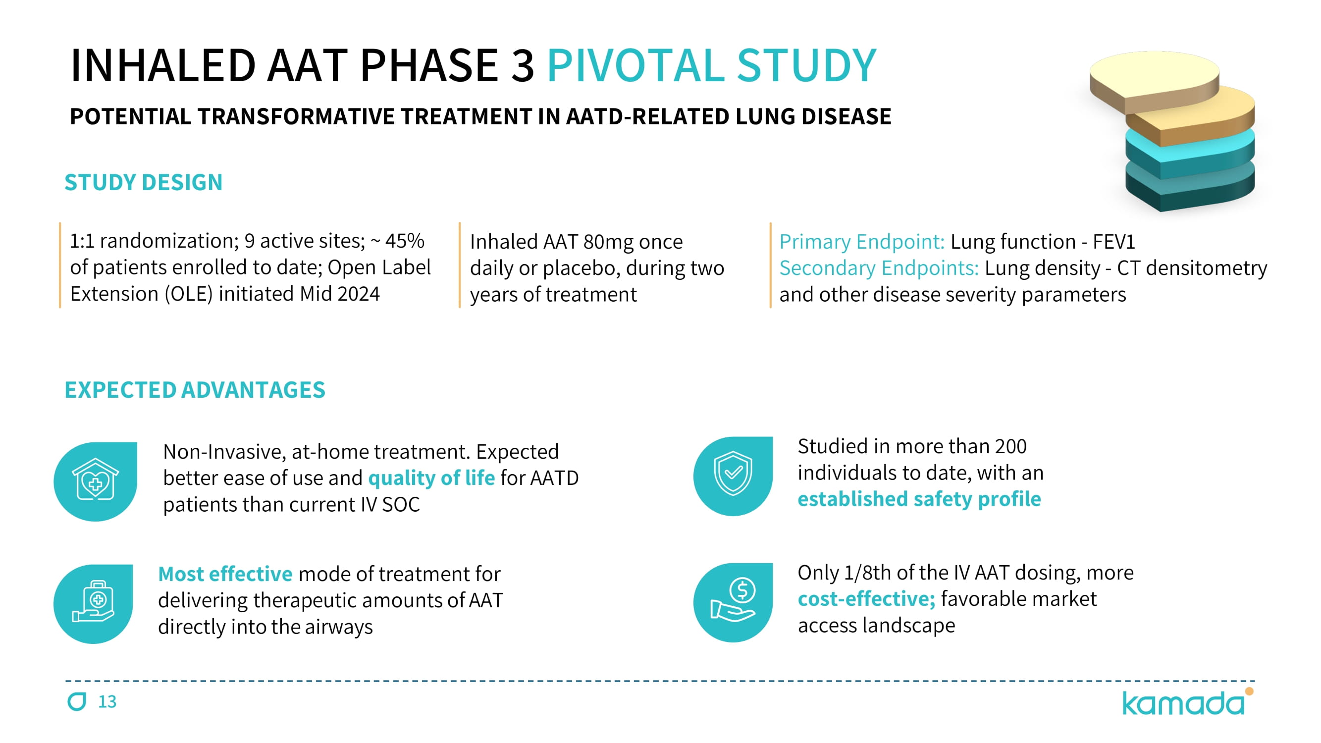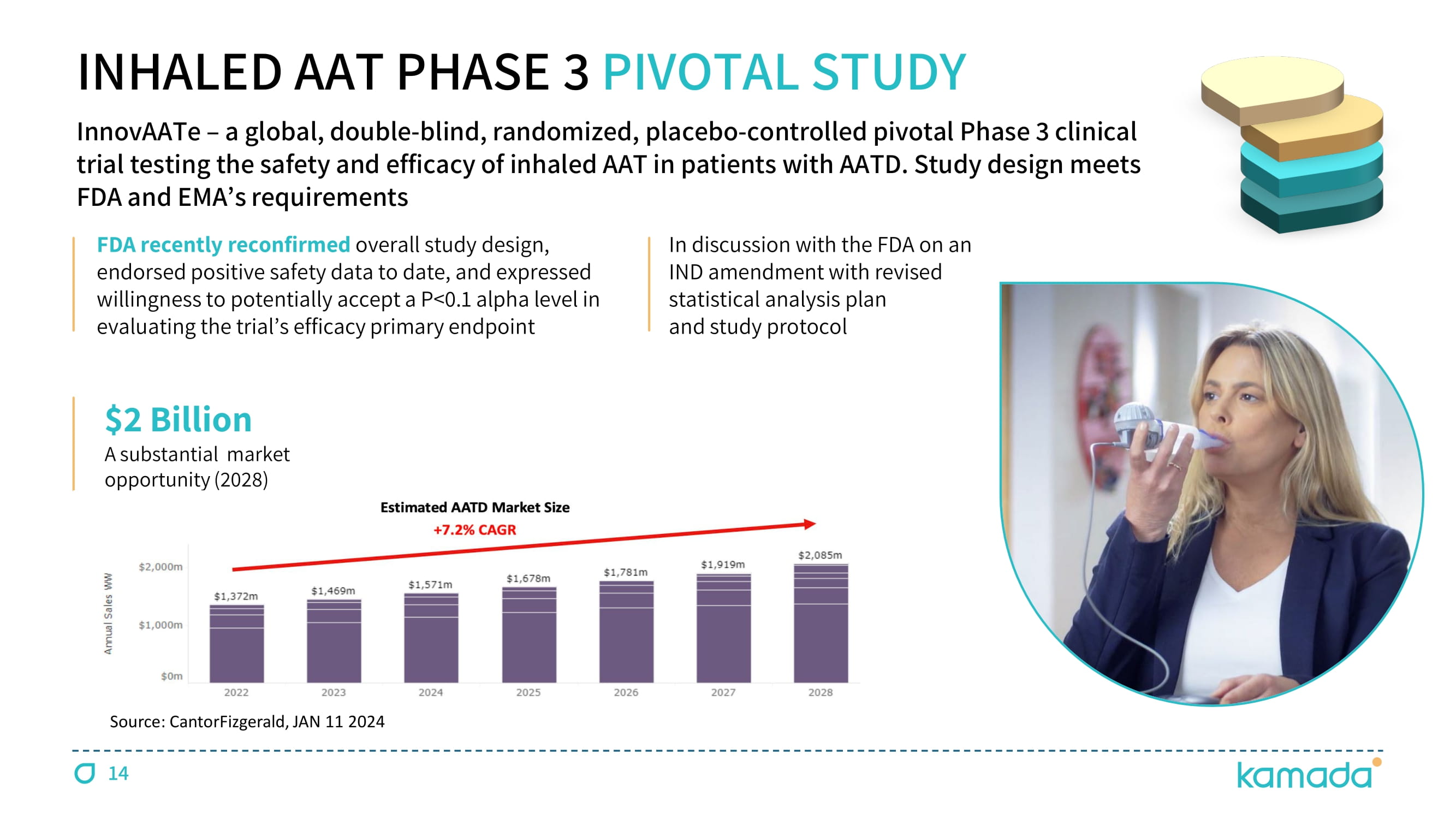 INHALED AAT PHASE 3 PIVOTAL STUDY Non - Invasive, at - home treatment. Expected better ease of use and quality of life for AATD patients than current IV SOC Most effective mode of treatment for delivering therapeutic amounts of AAT directly into the airways Studied in more than 200 individuals to date, with an established safety profile Only 1 / 8 th of the IV AAT dosing, more cost - effective; favorable market access landscape STUDY D ESIGN EXPECTED ADVANTAGES Ɗ čŃč randomization; 9 active sites; ~ 45 % of patients enrolled to date; Open Label Extension (OLE) initiated Mid 2024 Inhaled AAT ĔČ mg Ɗ once Ɗ daily o r Ɗ placebo, Ɗ during Ɗ two Ɗ years of Ɗ treatment Primary Ɗ Endpoint: Lung Ɗ function - FEV č Secondary Ɗ Endpoints Ń Lung Ɗ density - CT Ɗ densitometry Ɗ and Ɗ other Ɗ disease Ɗ severity Ɗ parameters 13 POTENTIAL TRANSFORMATIVE TREATMENT IN AATD - RELATED LUNG DISEASE