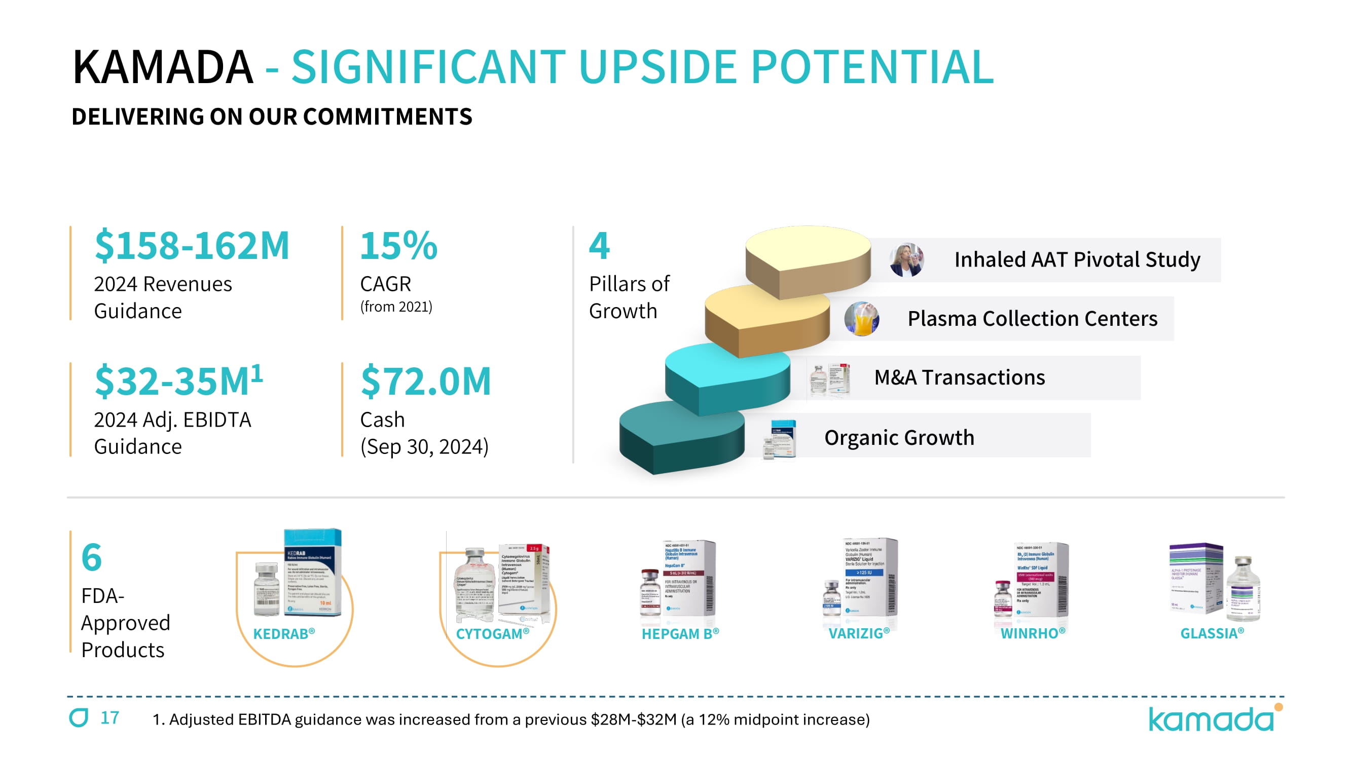 KEDRAB® CYTOGAM® HEPGAM B® VARIZIG® WINRHO® GLASSIA® KAMADA - SIGNIFICANT UPSIDE POTENTIAL 6 FDA - Approved Products 15 % CAGR (from 2021 ) $ 158 - 162 M 2024 Revenues Guidance $ 32 - 35M 1 2024 Adj. EBIDTA Guidance 4 Pillars of Growth DELIVERING ON OUR COMMITMENTS $ 72.0 M Cash (Sep 30, 2024) 17 Organic Growth M&A Transactions Inhaled AAT Pivotal Study Plasma Collection Centers 1 . Adjusted EBITDA guidance was increased from a previous $ 28 M - $ 32 M (a 12 % midpoint increase)