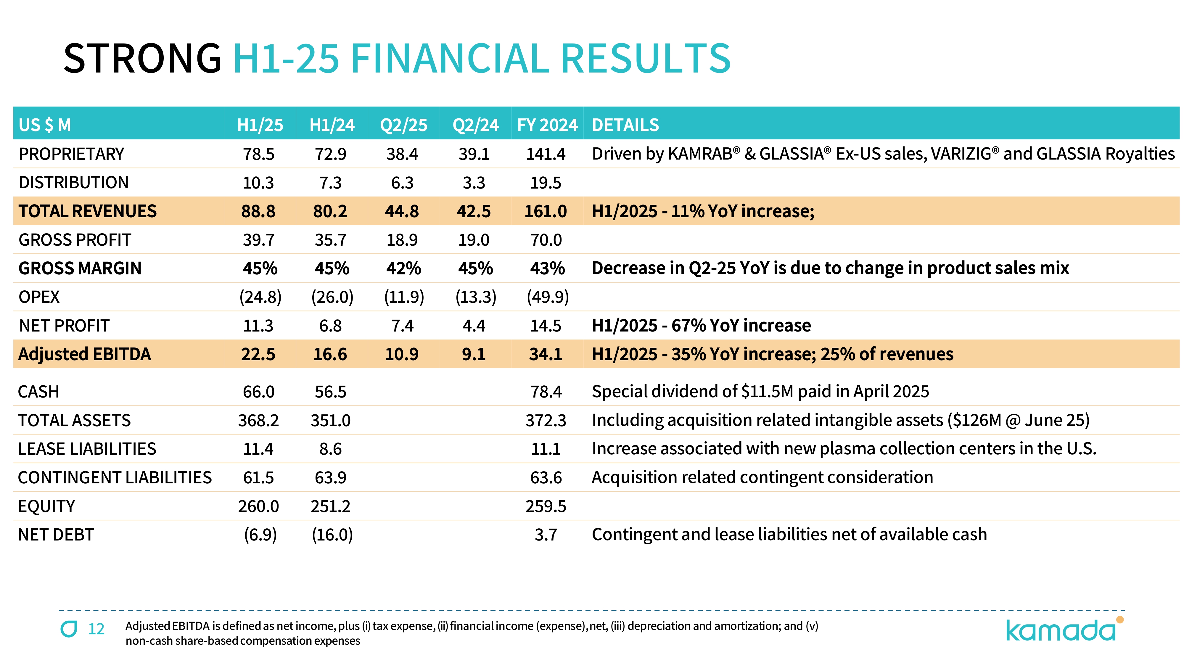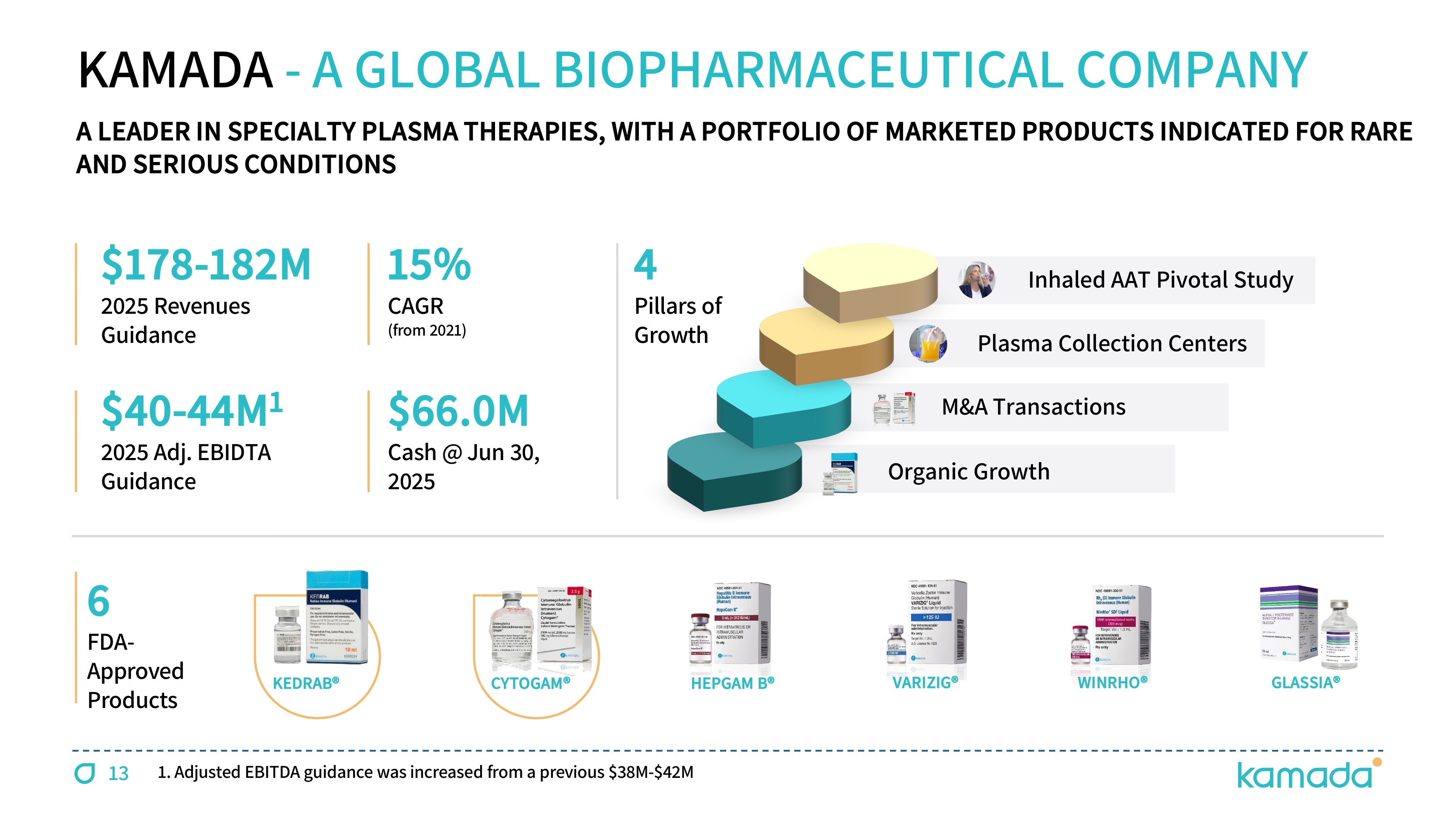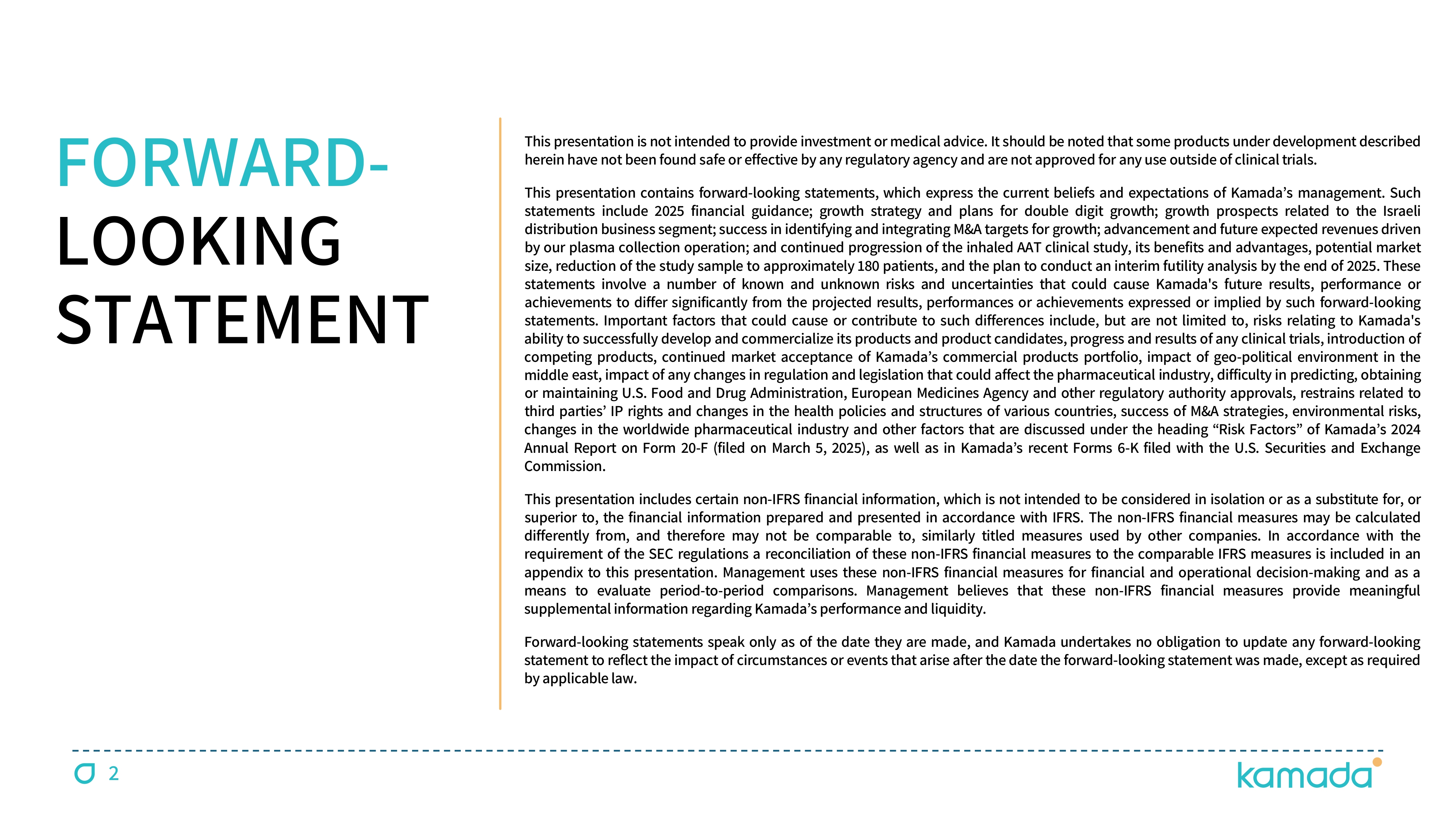 FORWARD - LOOKING STATEMENT This presentation is not intended to provide investment or medical advice . It should be noted that some products under development described herein have not been found safe or effective by any regulatory agency and are not approved for any use outside of clinical trials . This presentation contains forward - looking statements, which express the current beliefs and expectations of Kamada’s management . Such statements include 2025 financial guidance ; growth strategy and plans for double digit growth ; growth prospects related to the Israeli distribution business segment ; success in identifying and integrating M&A targets for growth ; advancement and future expected revenues driven by our plasma collection operation ; and continued progression of the inhaled AAT clinical study, its benefits and advantages, potential market size, reduction of the study sample to approximately 180 patients, and the plan to conduct an interim futility analysis by the end of 2025 . These statements involve a number of known and unknown risks and uncertainties that could cause Kamada's future results, performance or achievements to differ significantly from the projected results, performances or achievements expressed or implied by such forward - looking statements . Important factors that could cause or contribute to such differences include, but are not limited to, risks relating to Kamada's ability to successfully develop and commercialize its products and product candidates, progress and results of any clinical trials, introduction of competing products, continued market acceptance of Kamada’s commercial products portfolio, impact of geo - political environment in the middle east, impact of any changes in regulation and legislation that could affect the pharmaceutical industry, difficulty in predicting, obtaining or maintaining U . S . Food and Drug Administration, European Medicines Agency and other regulatory authority approvals, restrains related to third parties’ IP rights and changes in the health policies and structures of various countries, success of M&A strategies, environmental risks, changes in the worldwide pharmaceutical industry and other factors that are discussed under the heading “Risk Factors” of Kamada’s 2024 Annual Report on Form 20 - F (filed on March 5 , 2025 ), as well as in Kamada’s recent Forms 6 - K filed with the U . S . Securities and Exchange Commission . This presentation includes certain non - IFRS financial information, which is not intended to be considered in isolation or as a substitute for, or superior to, the financial information prepared and presented in accordance with IFRS . The non - IFRS financial measures may be calculated differently from, and therefore may not be comparable to, similarly titled measures used by other companies . In accordance with the requirement of the SEC regulations a reconciliation of these non - IFRS financial measures to the comparable IFRS measures is included in an appendix to this presentation . Management uses these non - IFRS financial measures for financial and operational decision - making and as a means to evaluate period - to - period comparisons . Management believes that these non - IFRS financial measures provide meaningful supplemental information regarding Kamada’s performance and liquidity . Forward - looking statements speak only as of the date they are made, and Kamada undertakes no obligation to update any forward - looking statement to reflect the impact of circumstances or events that arise after the date the forward - looking statement was made, except as required by applicable law . 2