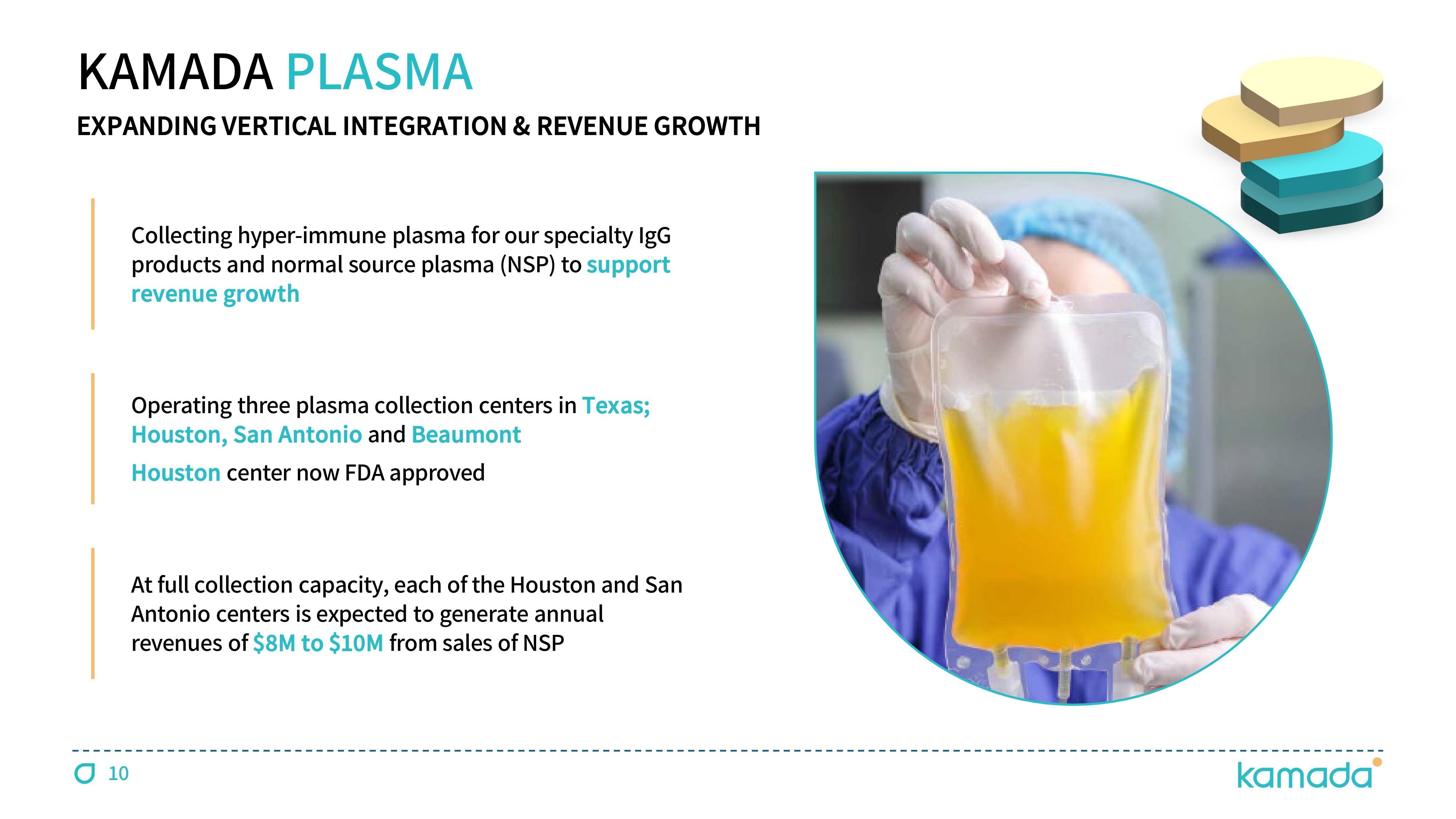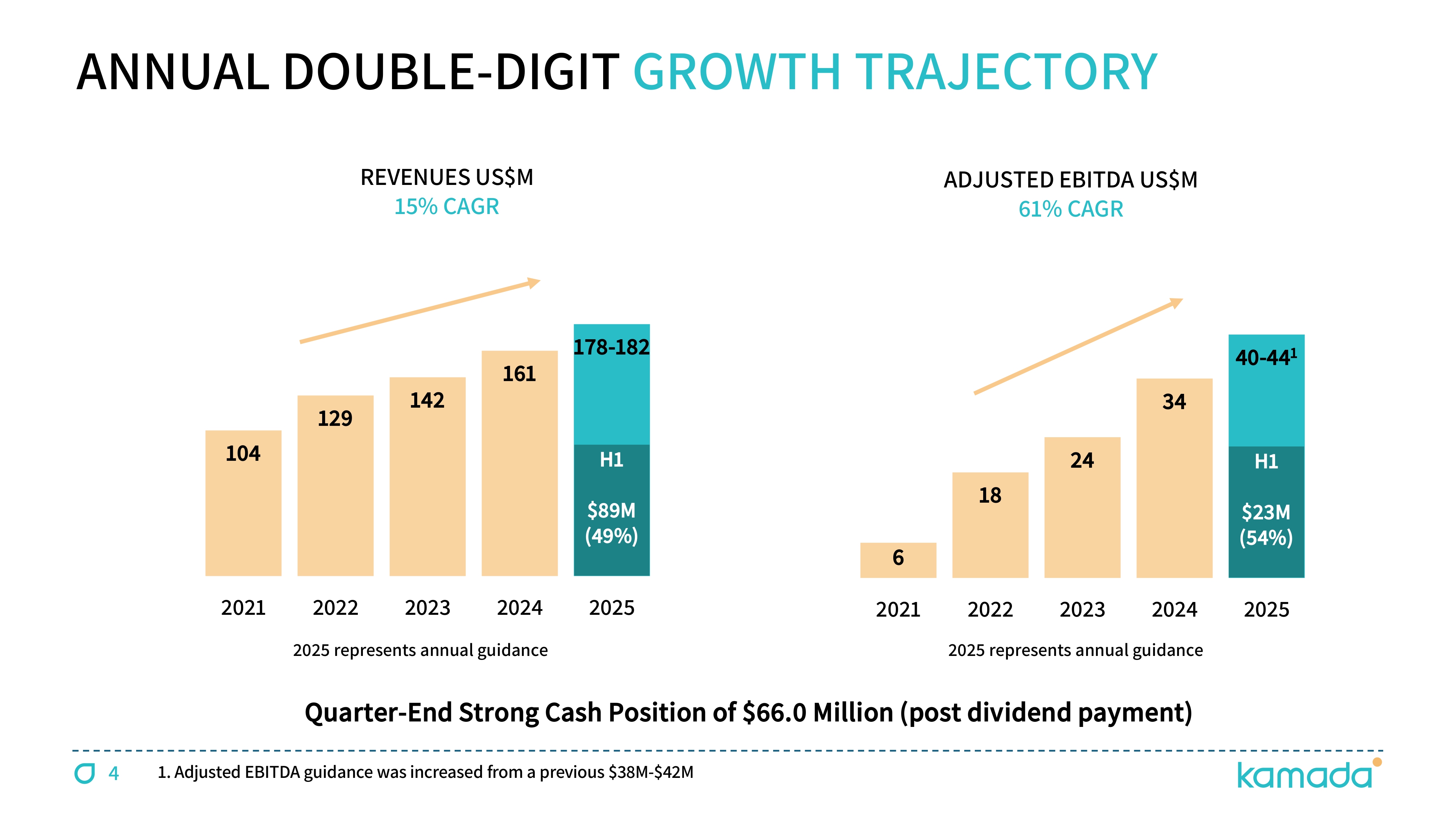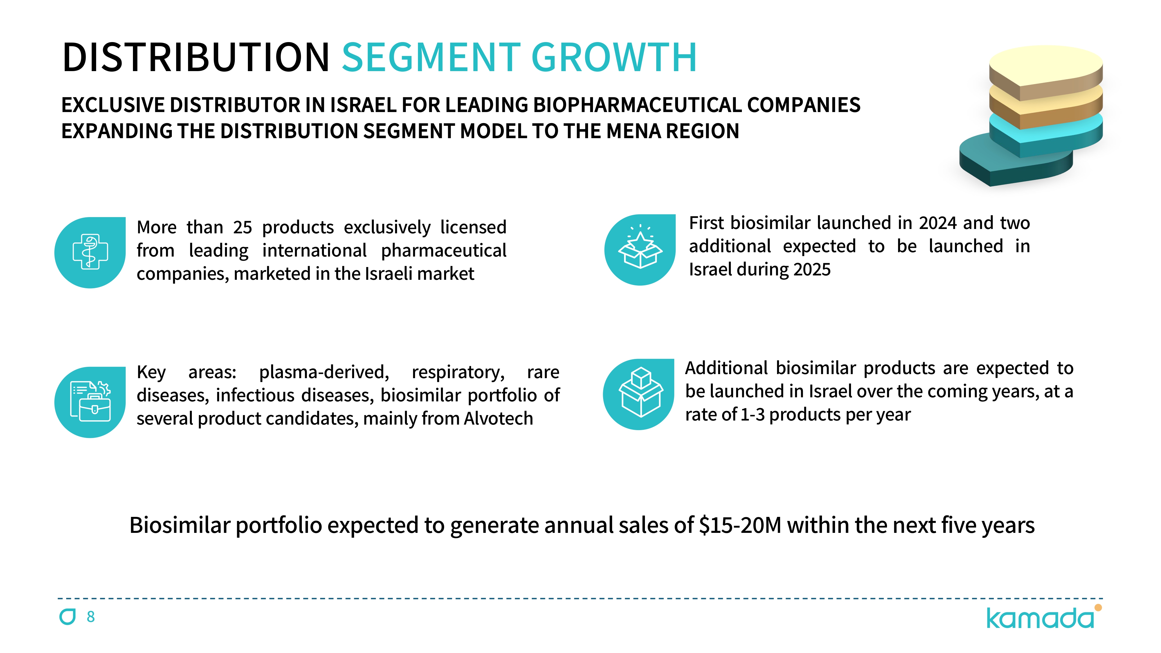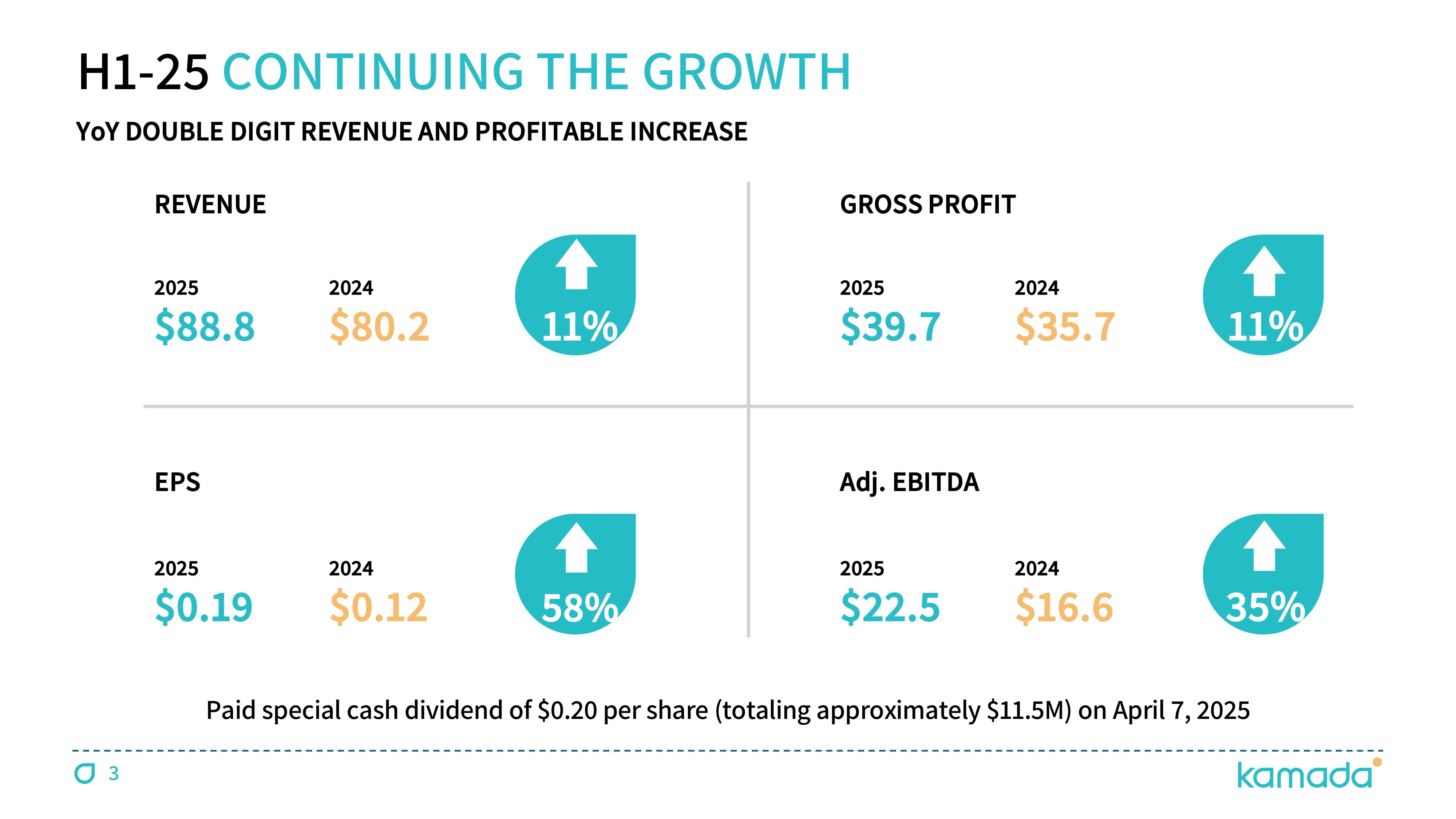 FORWARD - LOOKING STATEMENT This presentation is not intended to provide investment or medical advice . It should be noted that some products under development described herein have not been found safe or effective by any regulatory agency and are not approved for any use outside of clinical trials . This presentation contains forward - looking statements, which express the current beliefs and expectations of Kamada’s management . Such statements include 2025 financial guidance ; growth strategy and plans for double digit growth ; growth prospects related to the Israeli distribution business segment ; success in identifying and integrating M&A targets for growth ; advancement and future expected revenues driven by our plasma collection operation ; and continued progression of the inhaled AAT clinical study, its benefits and advantages, potential market size, reduction of the study sample to approximately 180 patients, and the plan to conduct an interim futility analysis by the end of 2025 . These statements involve a number of known and unknown risks and uncertainties that could cause Kamada's future results, performance or achievements to differ significantly from the projected results, performances or achievements expressed or implied by such forward - looking statements . Important factors that could cause or contribute to such differences include, but are not limited to, risks relating to Kamada's ability to successfully develop and commercialize its products and product candidates, progress and results of any clinical trials, introduction of competing products, continued market acceptance of Kamada’s commercial products portfolio, impact of geo - political environment in the middle east, impact of any changes in regulation and legislation that could affect the pharmaceutical industry, difficulty in predicting, obtaining or maintaining U . S . Food and Drug Administration, European Medicines Agency and other regulatory authority approvals, restrains related to third parties’ IP rights and changes in the health policies and structures of various countries, success of M&A strategies, environmental risks, changes in the worldwide pharmaceutical industry and other factors that are discussed under the heading “Risk Factors” of Kamada’s 2024 Annual Report on Form 20 - F (filed on March 5 , 2025 ), as well as in Kamada’s recent Forms 6 - K filed with the U . S . Securities and Exchange Commission . This presentation includes certain non - IFRS financial information, which is not intended to be considered in isolation or as a substitute for, or superior to, the financial information prepared and presented in accordance with IFRS . The non - IFRS financial measures may be calculated differently from, and therefore may not be comparable to, similarly titled measures used by other companies . In accordance with the requirement of the SEC regulations a reconciliation of these non - IFRS financial measures to the comparable IFRS measures is included in an appendix to this presentation . Management uses these non - IFRS financial measures for financial and operational decision - making and as a means to evaluate period - to - period comparisons . Management believes that these non - IFRS financial measures provide meaningful supplemental information regarding Kamada’s performance and liquidity . Forward - looking statements speak only as of the date they are made, and Kamada undertakes no obligation to update any forward - looking statement to reflect the impact of circumstances or events that arise after the date the forward - looking statement was made, except as required by applicable law . 2