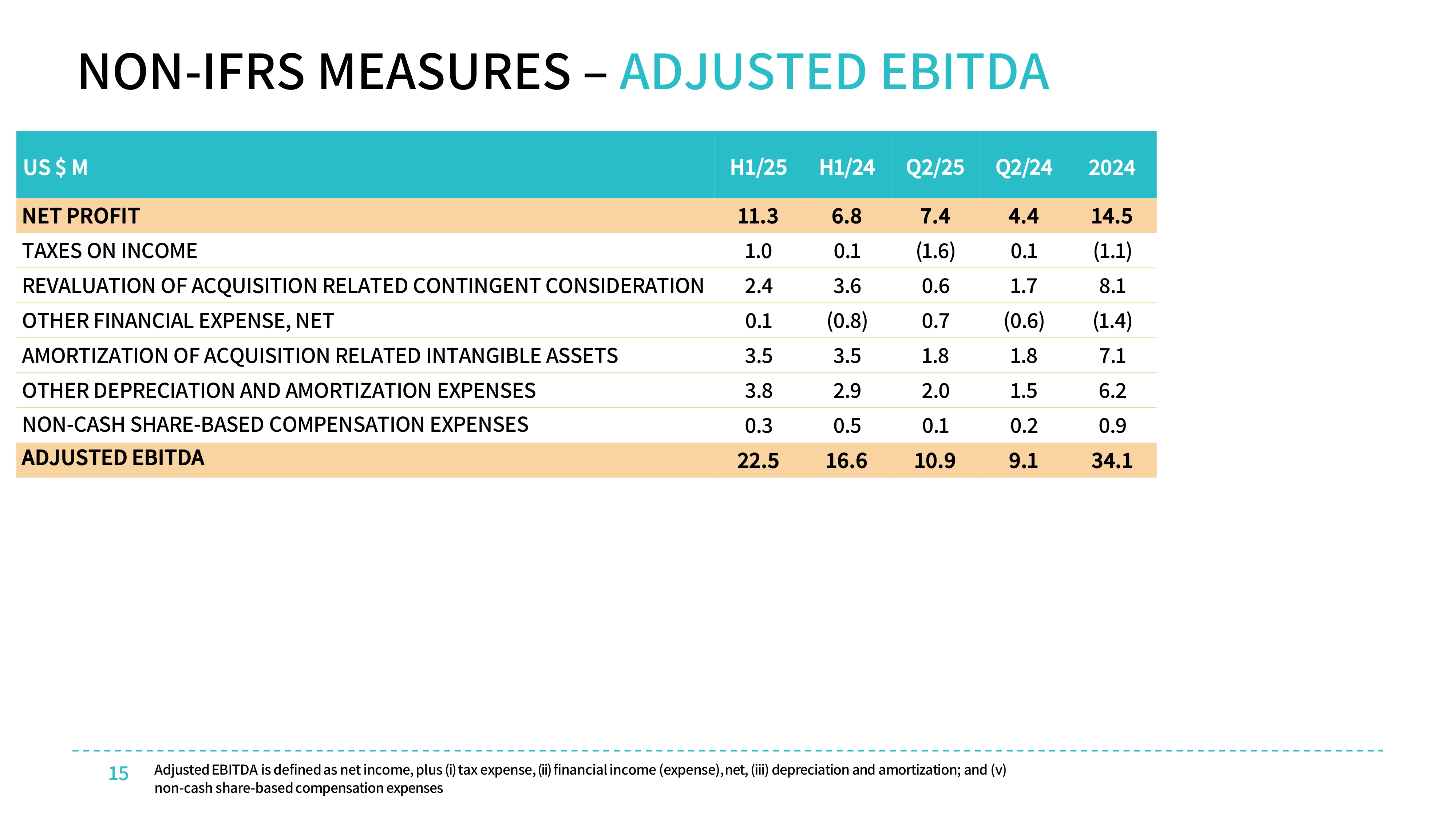 15 NON - IFRS MEASURES – ADJUSTED EBITDA Adjusted EBITDA is defined as net income, plus (i) tax expense, (ii) financial income (expense),net, (iii) depreciation and amortization; and (v) non - cash share - based compensation expenses 2024 Q2/24 Q2/25 H1/24 H1/25 US $ M 14.5 4.4 7.4 6.8 11.3 NET PROFIT (1.1) 0.1 (1.6) 0.1 1.0 TAXES ON INCOME 8.1 1.7 0.6 3.6 2.4 REVALUATION OF ACQUISITION RELATED CONTINGENT CONSIDERATION (1.4) (0.6) 0.7 (0.8) 0.1 OTHER FINANCIAL EXPENSE, NET 7.1 1.8 1.8 3.5 3.5 AMORTIZATION OF ACQUISITION RELATED INTANGIBLE ASSETS 6.2 1.5 2.0 2.9 3.8 OTHER DEPRECIATION AND AMORTIZATION EXPENSES 0.9 0.2 0.1 0.5 0.3 NON - CASH SHARE - BASED COMPENSATION EXPENSES 34.1 9.1 10.9 16.6 22.5 ADJUSTED EBITDA