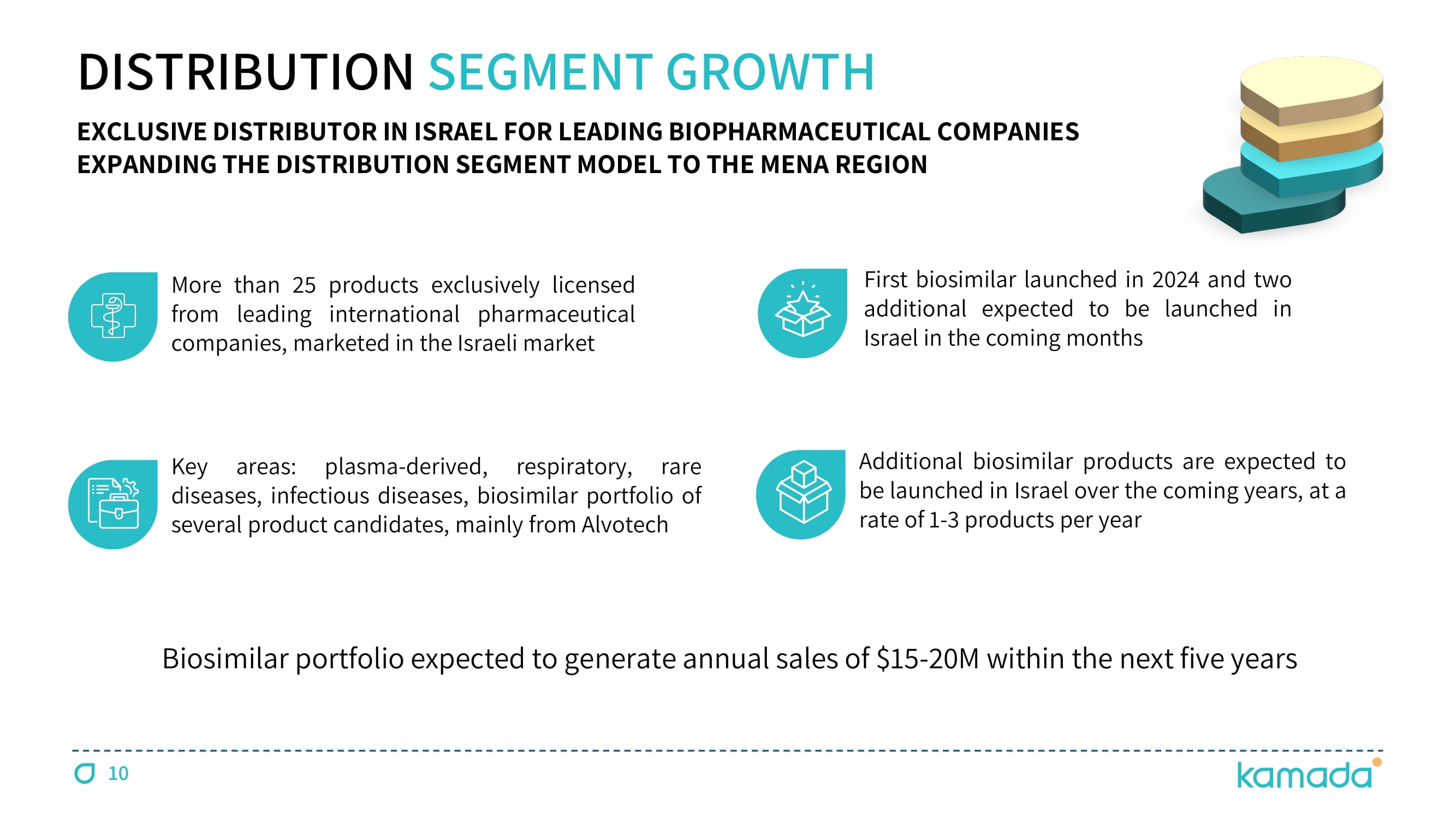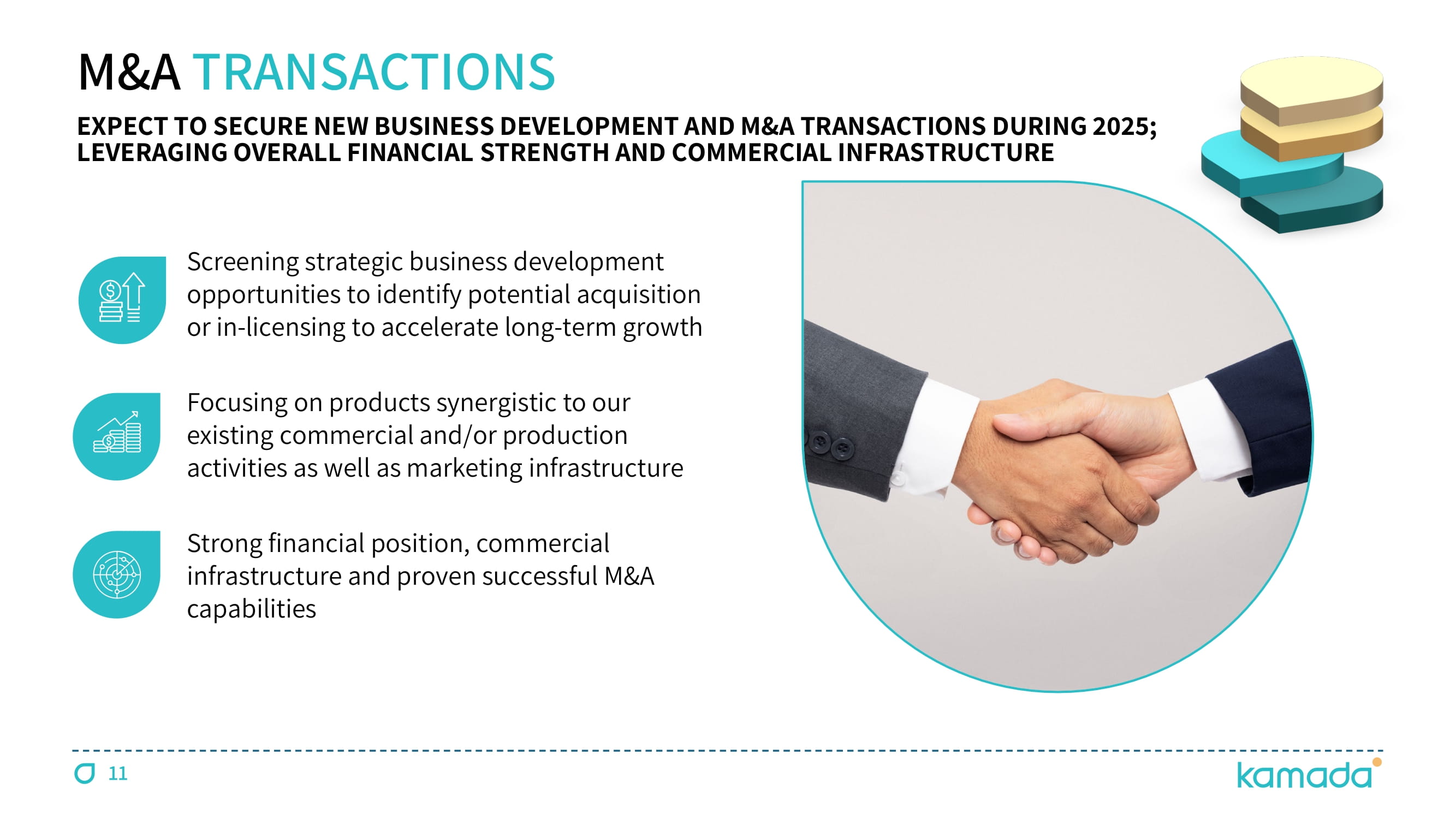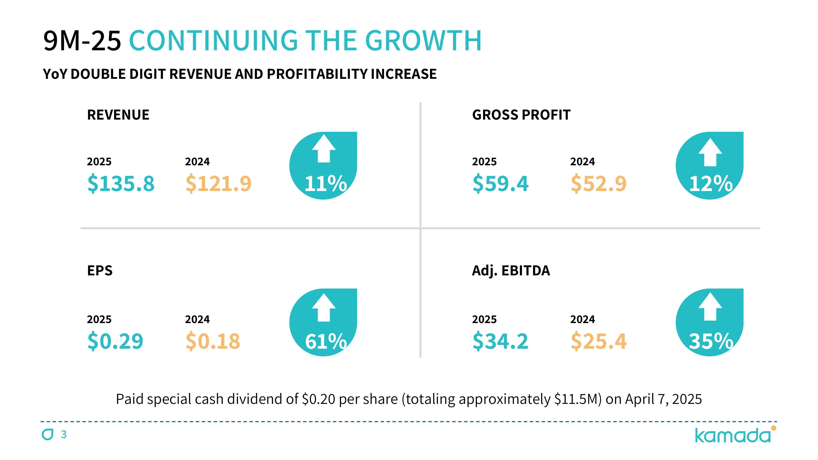 2 FORWARD - LOOKING STATEMENT This presentation is not intended to provide investment or medical advice . It should be noted that some products under development described herein have not been found safe or effective by any regulatory agency and are not approved for any use outside of clinical trials . This presentation contains forward - looking statements, which express the current beliefs and expectations of Kamada’s management . Such statements include 2025 financial guidance ; growth strategy and plans for double digit growth ; growth prospects related to CYTOGAM®, GLASSIA®, and the Israeli distribution business segment ; success in identifying and integrating M&A targets for growth ; advancement and future expected revenues driven by our plasma collection operation ; and continued progression of the inhaled AAT clinical study, its benefits and advantages, potential market size, reduction of the study sample to approximately 180 patients, and the plan to conduct an interim futility analysis by the end of 2025 . These statements involve a number of known and unknown risks and uncertainties that could cause Kamada's future results, performance or achievements to differ significantly from the projected results, performances or achievements expressed or implied by such forward - looking statements . Important factors that could cause or contribute to such differences include, but are not limited to, risks relating to Kamada's ability to successfully develop and commercialize its products and product candidates, progress and results of any clinical trials, introduction of competing products, continued market acceptance of Kamada’s commercial products portfolio, impact of geo - political environment in the middle east, impact of any changes in regulation and legislation that could affect the pharmaceutical industry, difficulty in predicting, obtaining or maintaining U . S . Food and Drug Administration, European Medicines Agency and other regulatory authority approvals, restrains related to third parties’ IP rights and changes in the health policies and structures of various countries, success of M&A strategies, environmental risks, changes in the worldwide pharmaceutical industry and other factors that are discussed under the heading “Risk Factors” of Kamada’s 2024 Annual Report on Form 20 - F (filed on March 5 , 2025 ), as well as in Kamada’s recent Forms 6 - K filed with the U . S . Securities and Exchange Commission . This presentation includes certain non - IFRS financial information, which is not intended to be considered in isolation or as a substitute for, or superior to, the financial information prepared and presented in accordance with IFRS . The non - IFRS financial measures may be calculated differently from, and therefore may not be comparable to, similarly titled measures used by other companies . In accordance with the requirement of the SEC regulations a reconciliation of these non - IFRS financial measures to the comparable IFRS measures is included in an appendix to this presentation . Management uses these non - IFRS financial measures for financial and operational decision - making and as a means to evaluate period - to - period comparisons . Management believes that these non - IFRS financial measures provide meaningful supplemental information regarding Kamada’s performance and liquidity . Forward - looking statements speak only as of the date they are made, and Kamada undertakes no obligation to update any forward - looking statement to reflect the impact of circumstances or events that arise after the date the forward - looking statement was made, except as required by applicable law .