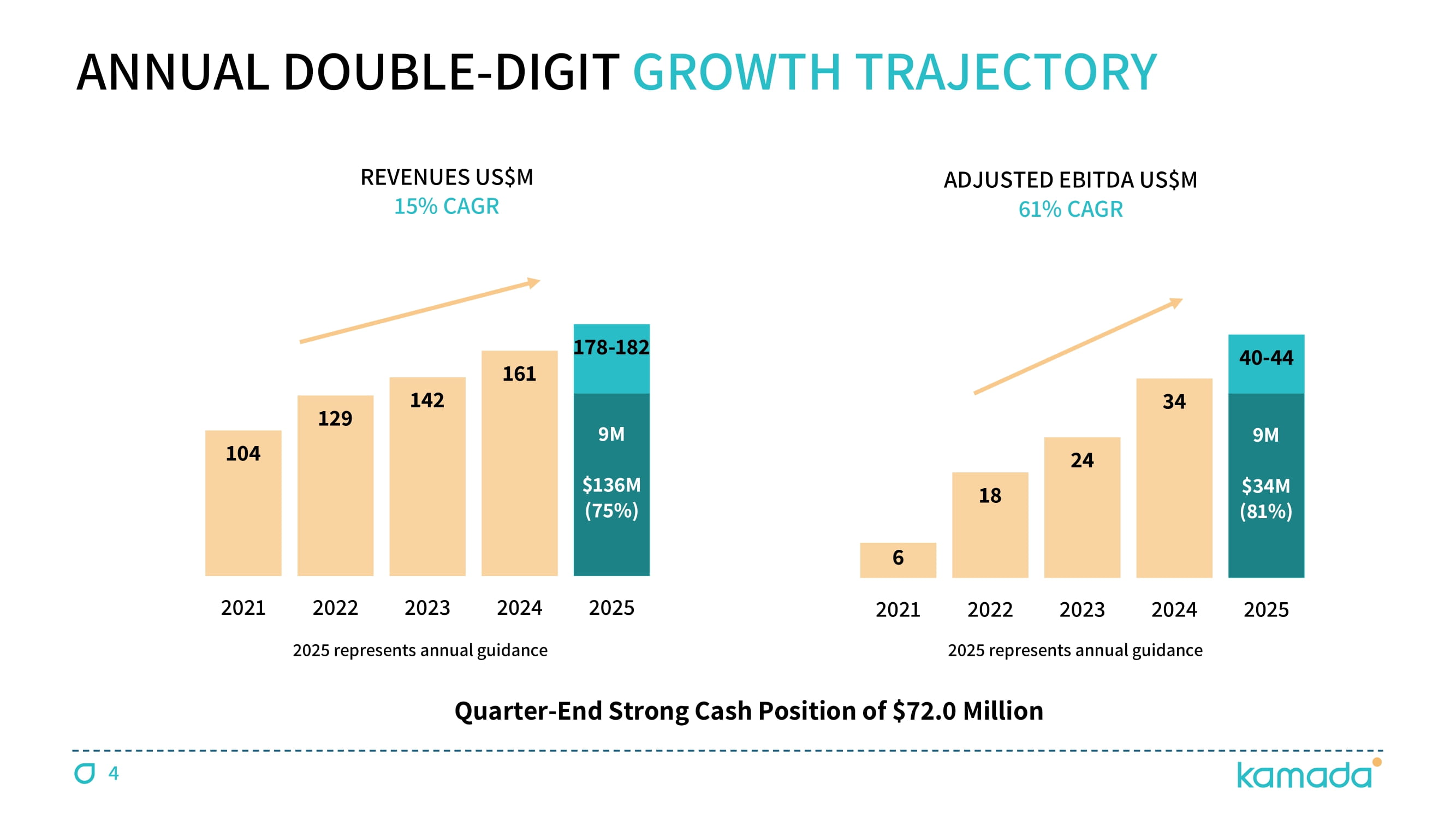 4 6 18 24 34 40 - 44 2021 2022 2023 2024 2025 104 129 142 161 178 - 182 2021 2022 2023 2024 2025 ADJUSTED EBITDA US$M 61% CAGR 2025 represents annual guidance 2025 represents annual guidance ANNUAL DOUBLE - DIGIT GROWTH TRAJECTORY REVENUES US$M 15% CAGR Quarter - End Strong Cash Position of $72.0 Million 9 M $ 136 M ( 75 %) 9 M $ 34 M ( 81 %)
