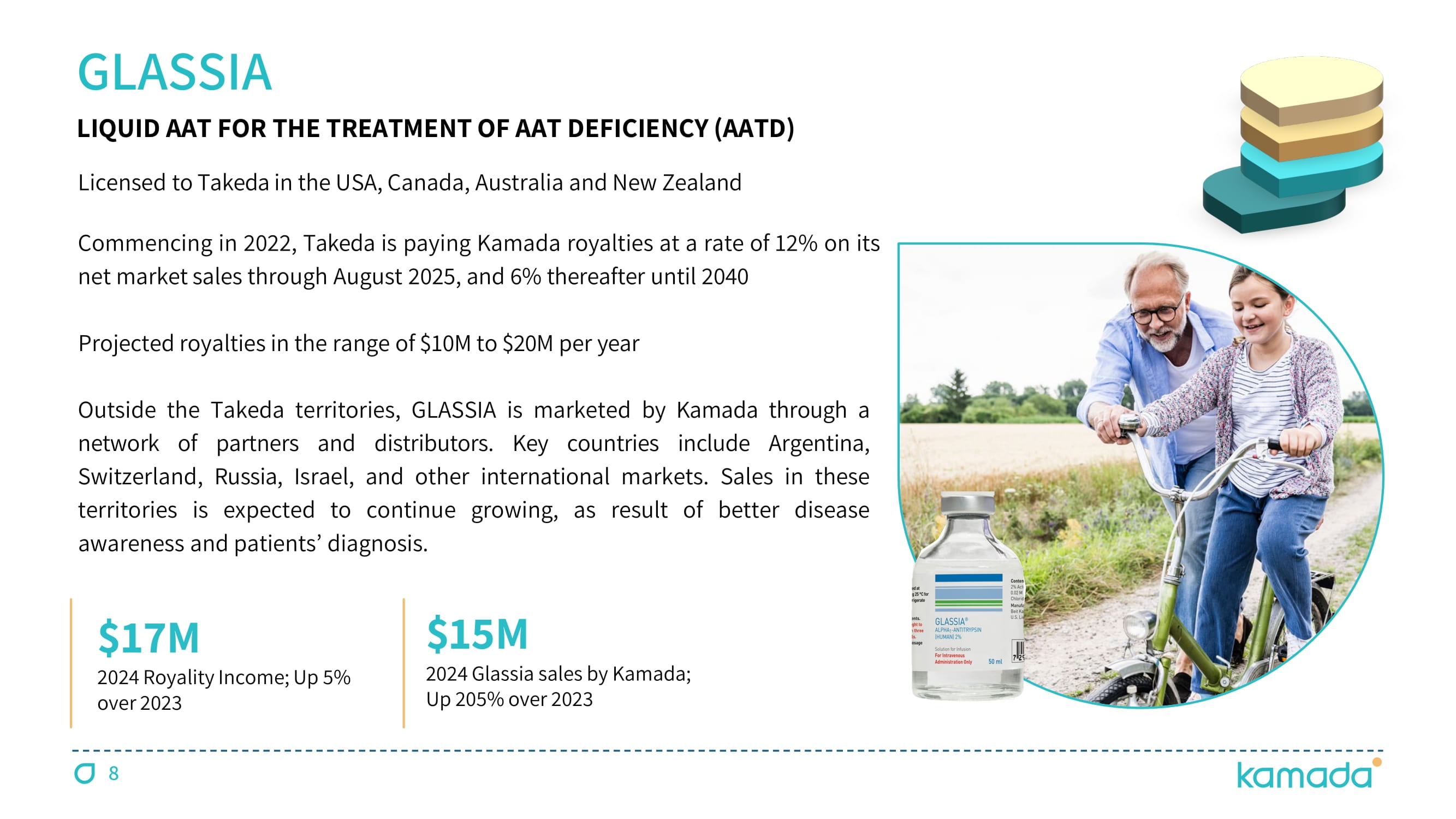 8 Licensed to Takeda in the USA, Canada, Australia and New Zealand Commencing in 2022 , Takeda is paying Kamada royalties at a rate of 12 % on its net market sales through August 2025 , and 6 % thereafter until 2040 Projected royalties in the range of $ 10 M to $ 20 M per year Outside the Takeda territories, GLASSIA is marketed by Kamada through a network of partners and distributors . Key countries include Argentina, Switzerland, Russia, Israel, and other international markets . Sales in these territories is expected to continue growing, as result of better disease awareness and patients’ diagnosis . GLASSIA $ 17 M 2024 Royality Income; Up 5 % over 2023 LIQUID AAT FOR THE TREATMENT OF AAT DEFICIENCY (AATD) $ 15 M 2024 Glassia sales by Kamada; Up 205 % over 2023
