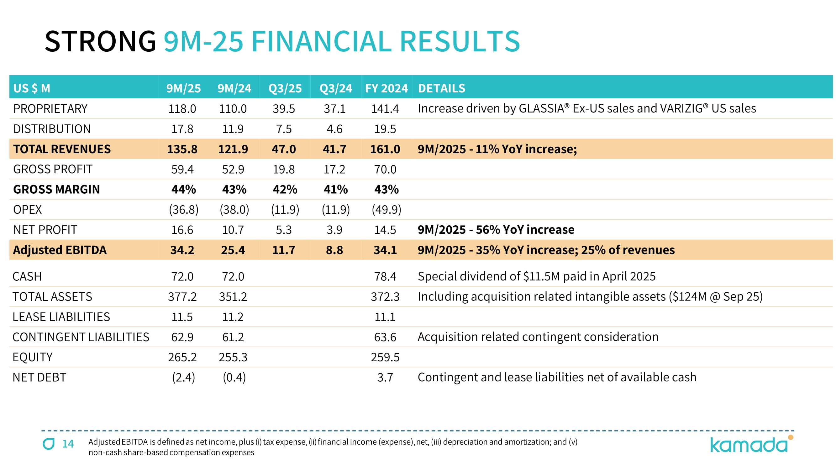 14 Adjusted EBITDA is defined as net income, plus ( i ) tax expense, (ii) financial income (expense), net, (iii) depreciation and amortization ; and (v) non - cash share - based compensation expenses STRONG 9 M - 25 FINANCIAL RESULTS DETAILS FY 2024 Q3/24 Q3/25 9M/24 9M/25 US $ M Increase driven by GLASSIA® Ex - US sales and VARIZIG® US sales 141.4 37.1 39.5 110.0 118.0 PROPRIETARY 19.5 4.6 7.5 11.9 17.8 DISTRIBUTION 9M/2025 - 11% YoY increase; 161.0 41.7 47.0 121.9 135.8 TOTAL REVENUES 70.0 17.2 19.8 52.9 59.4 GROSS PROFIT 43 % 41 % 42 % 43 % 44 % GROSS MARGIN ( 49.9 ) ( 11.9 ) ( 11.9 ) ( 38.0 ) ( 36.8 ) OPEX 9M/2025 - 56% YoY increase 14.5 3.9 5.3 10.7 16.6 NET PROFIT 9M/2025 - 35% YoY increase; 25% of revenues 34.1 8.8 11.7 25.4 34.2 Adjusted EBITDA Special dividend of $11.5M paid in April 2025 78.4 72.0 72.0 CASH Including acquisition related intangible assets ($124M @ Sep 25) 372.3 351.2 377.2 TOTAL ASSETS 11.1 11.2 11.5 LEASE LIABILITIES Acquisition related contingent consideration 63.6 61.2 62.9 CONTINGENT LIABILITIES 259.5 255.3 265.2 EQUITY Contingent and lease liabilities net of available cash 3.7 ( 0.4 ) ( 2.4 ) NET DEBT