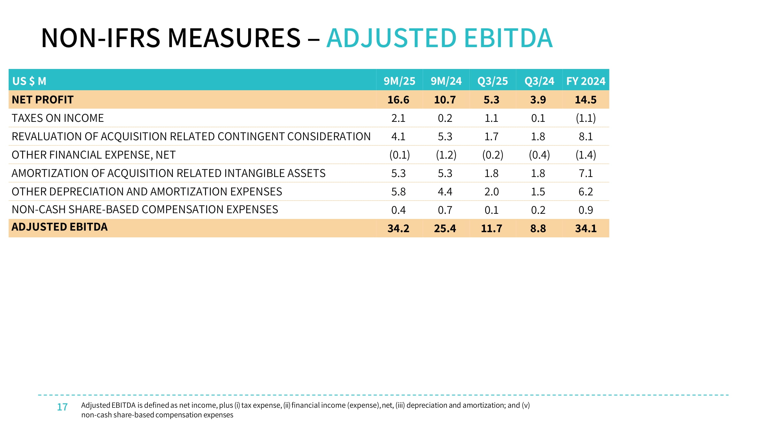 17 NON - IFRS MEASURES – ADJUSTED EBITDA Adjusted EBITDA is defined as net income, plus ( i ) tax expense, (ii) financial income (expense), net, (iii) depreciation and amortization ; and (v) non - cash share - based compensation expenses FY 2024 Q3/24 Q3/25 9M/24 9 M/ 25 US $ M 14.5 3.9 5.3 10.7 16.6 NET PROFIT (1.1) 0.1 1.1 0.2 2.1 TAXES ON INCOME 8.1 1.8 1.7 5.3 4.1 REVALUATION OF ACQUISITION RELATED CONTINGENT CONSIDERATION (1.4) ( 0.4 ) ( 0.2 ) ( 1.2 ) ( 0.1 ) OTHER FINANCIAL EXPENSE, NET 7.1 1.8 1.8 5.3 5.3 AMORTIZATION OF ACQUISITION RELATED INTANGIBLE ASSETS 6.2 1.5 2.0 4.4 5.8 OTHER DEPRECIATION AND AMORTIZATION EXPENSES 0.9 0.2 0.1 0.7 0.4 NON - CASH SHARE - BASED COMPENSATION EXPENSES 34.1 8.8 11.7 25.4 34.2 ADJUSTED EBITDA