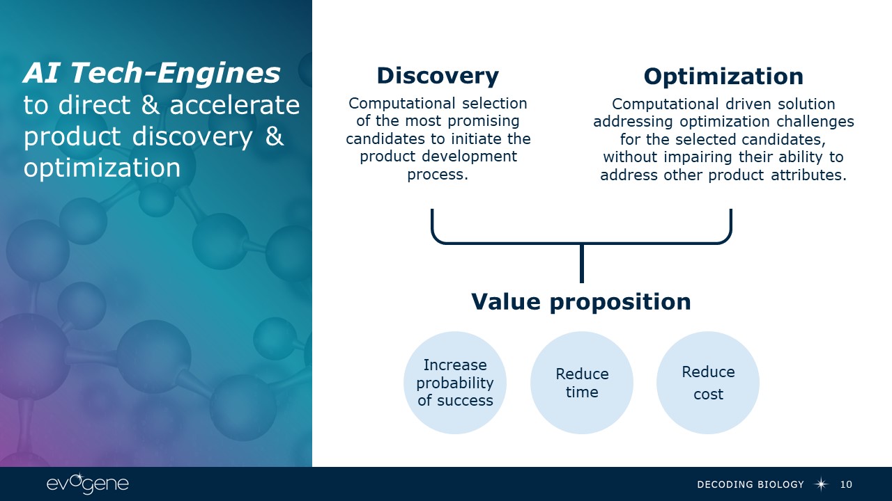 AI Tech-Engines to direct & accelerate product discovery & optimization   10  Discovery  Computational selection of the most promising candidates to initiate the product development process.  Optimization  Computational driven solution addressing optimization challenges for the selected candidates, without impairing their ability to address other product attributes.  Value proposition  Increase probability of success   Reducetime   Reduce  cost