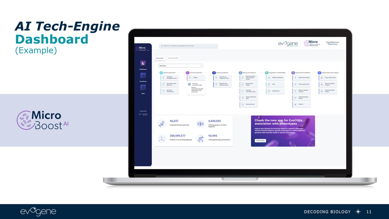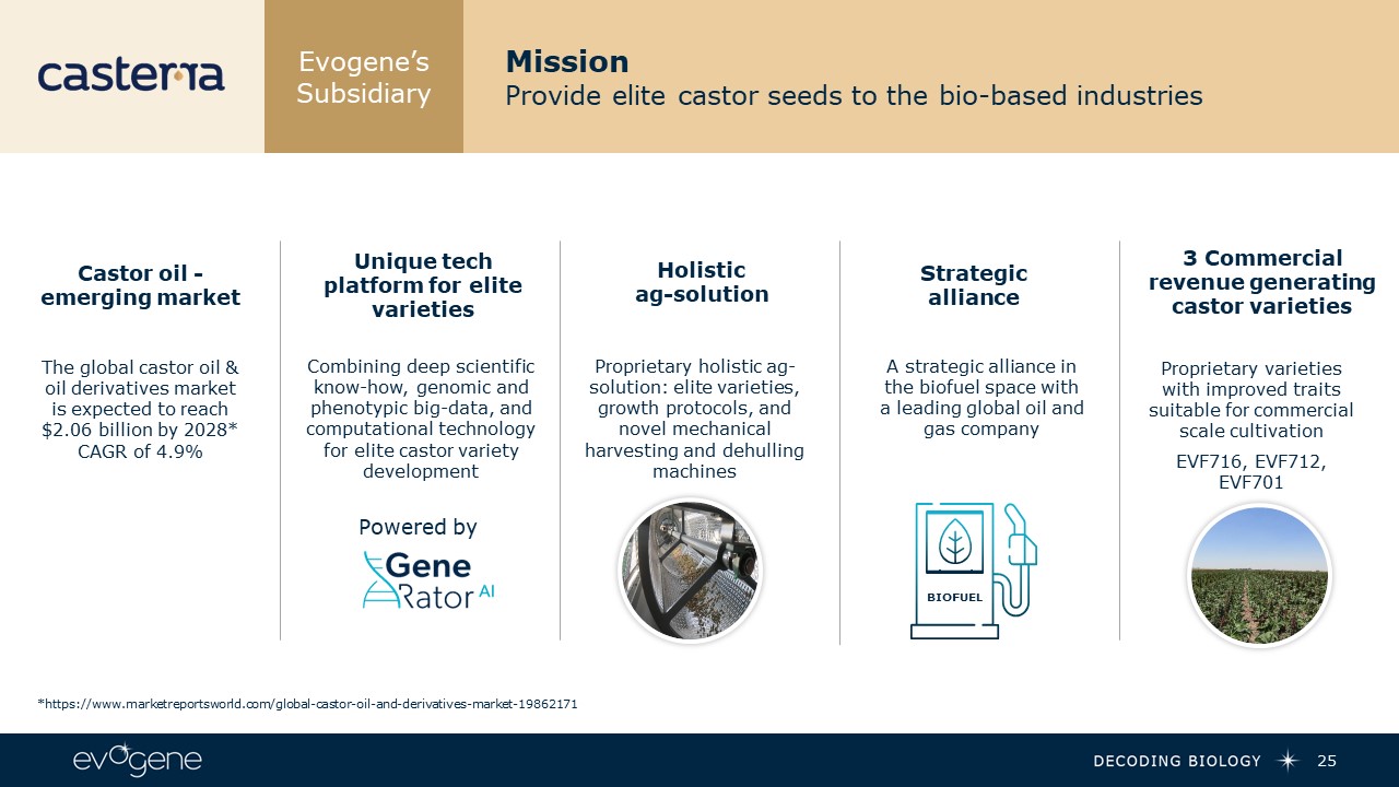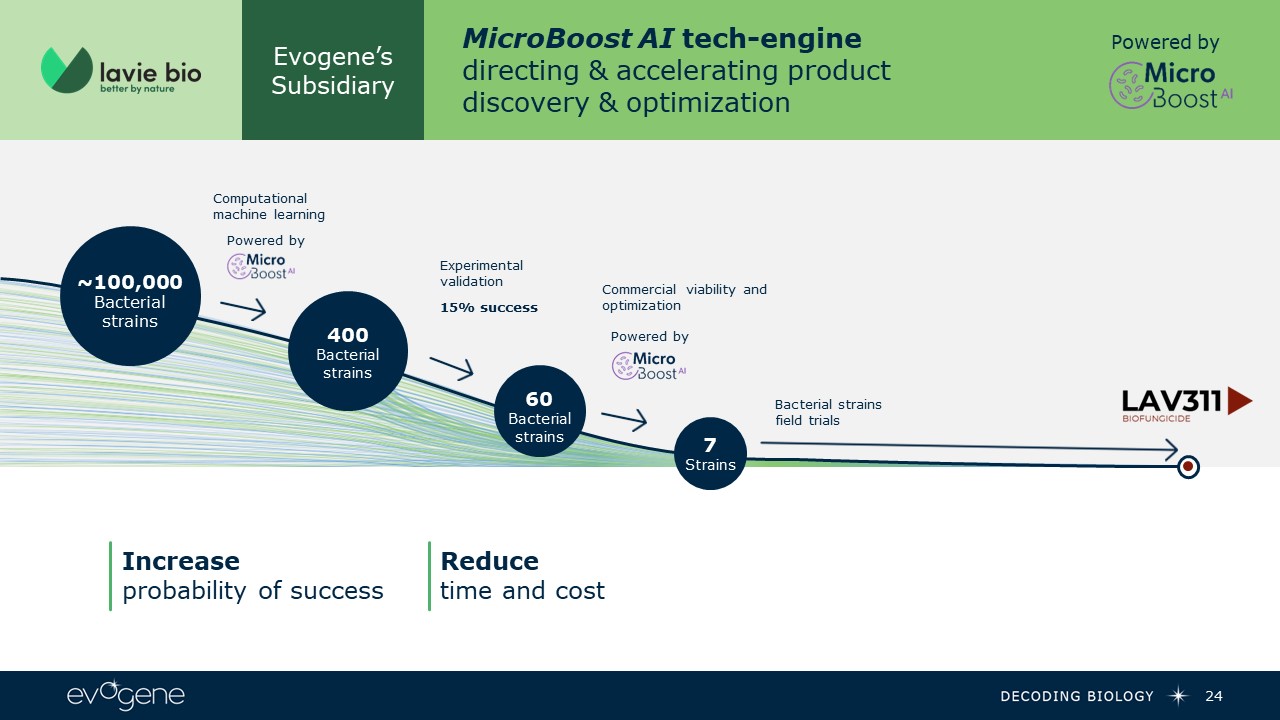 Evogene’s Subsidiary  MicroBoost AI tech-engine directing & accelerating product discovery & optimization  Powered by  Increaseprobability of success  Reducetime and cost  24  400  Bacterial strains  60 Bacterial strains  7   Strains  Computational  machine learning  Powered by  Experimental validation  15% success  Powered by  Commercial viability and optimization  Bacterial strains field trials  ~100,000  Bacterialstrains
