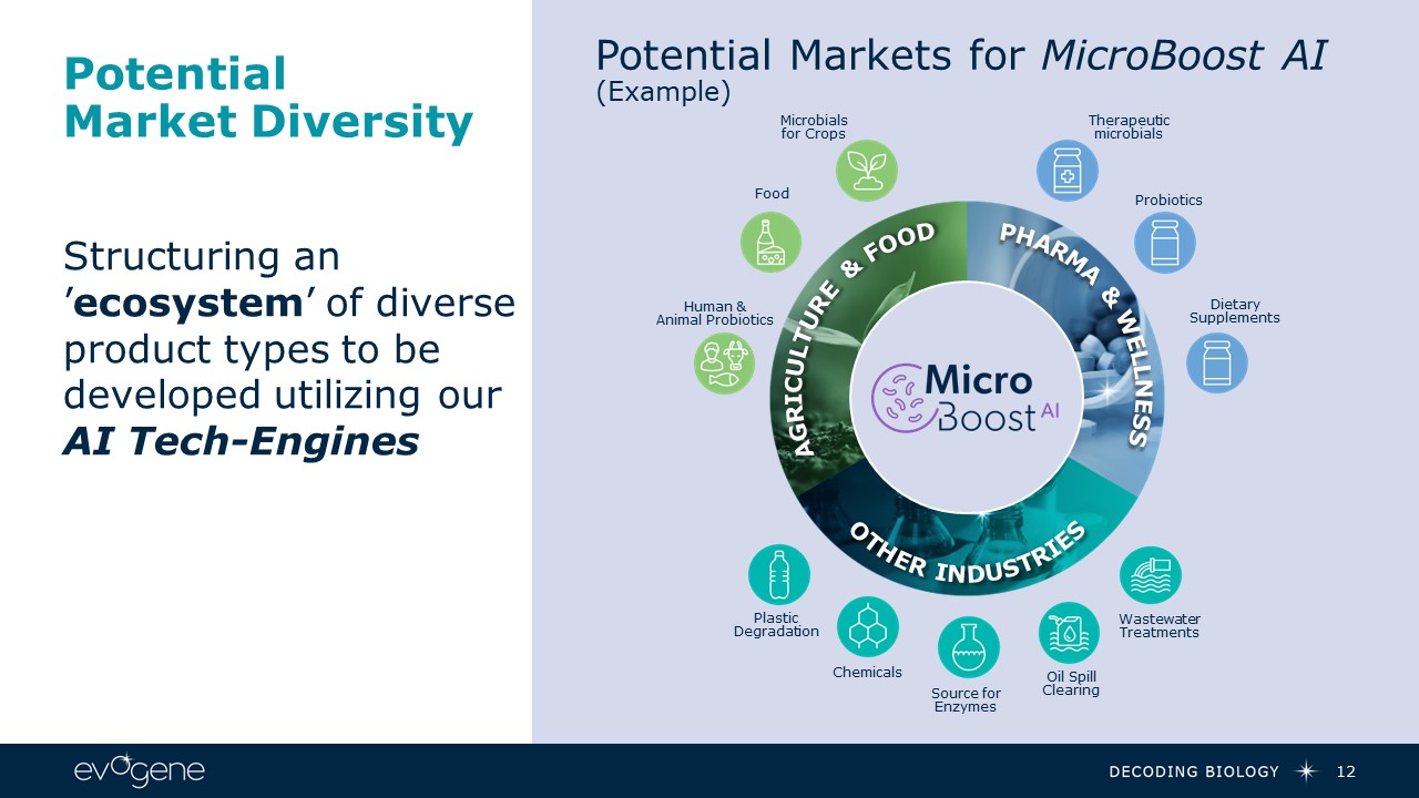 Potential Market Diversity  12  AGRICULTURE & FOOD  PHARMA & WELLNESS  OTHER INDUSTRIES  PlasticDegradation  Chemicals  Source forEnzymes  Oil SpillClearing  WastewaterTreatments  Microbialsfor Crops  Food  Human &Animal Probiotics  Therapeuticmicrobials  Probiotics  DietarySupplements  Structuring an ’ecosystem’ of diverse product types to be developed utilizing our AI Tech-Engines  Potential Markets for MicroBoost AI(Example)