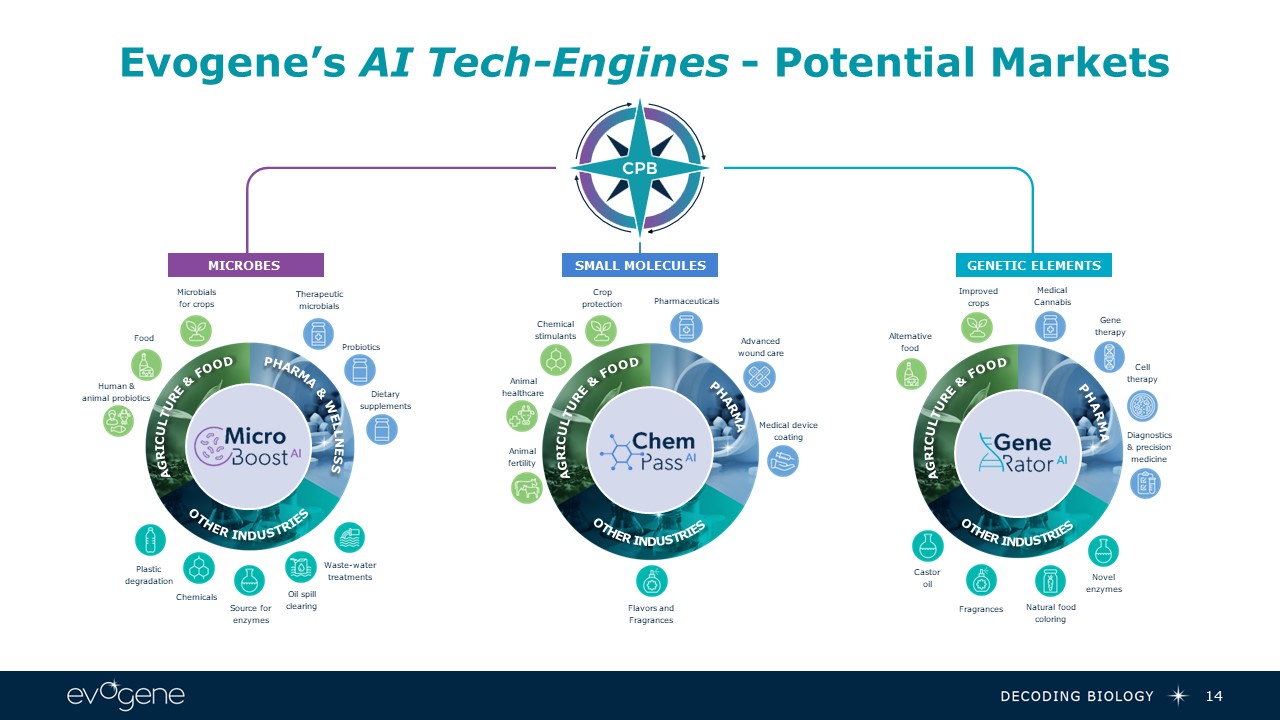 Evogene’s AI Tech-Engines - Potential Markets  14  AGRICULTURE & FOOD  PHARMA & WELLNESS  OTHER INDUSTRIES  Plasticdegradation  Chemicals  Source forenzymes  Oil spillclearing  Waste-watertreatments  Microbialsfor crops  Food  Human &animal probiotics  Therapeuticmicrobials  Probiotics  Dietarysupplements  Cropprotection  Chemicalstimulants  Animalhealthcare  Animalfertility  Advancedwound care  Pharmaceuticals  Medical devicecoating  Flavors and Fragrances  AGRICULTURE & FOOD  OTHER INDUSTRIES  PHARMA  AGRICULTURE & FOOD  PHARMA  OTHER INDUSTRIES  Fragrances  Natural foodcoloring  Novelenzymes  Improvedcrops  Alternativefood  Genetherapy  Celltherapy  Diagnostics  & precisionmedicine  Medical Cannabis  Castor oil   MICROBES   GENETIC ELEMENTS  SMALL MOLECULES