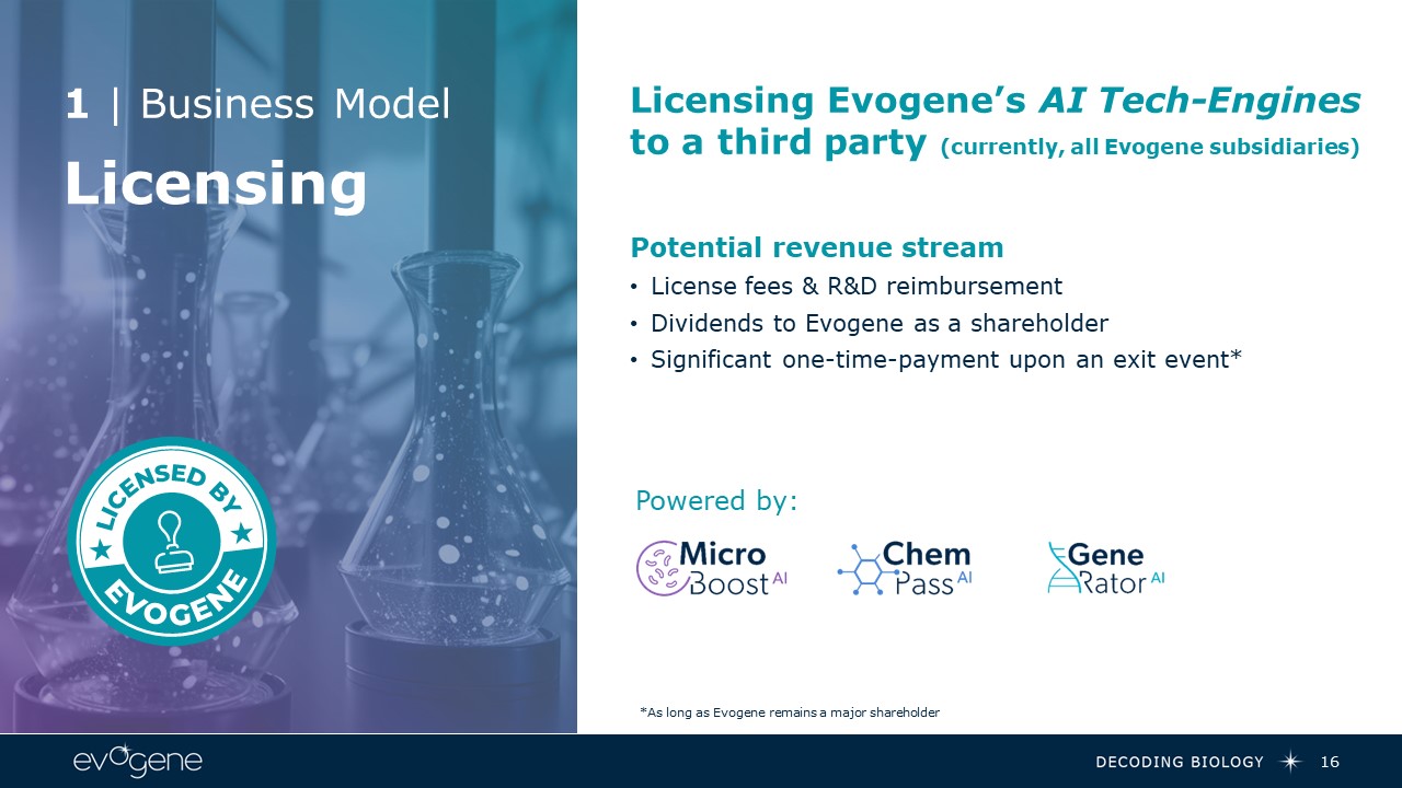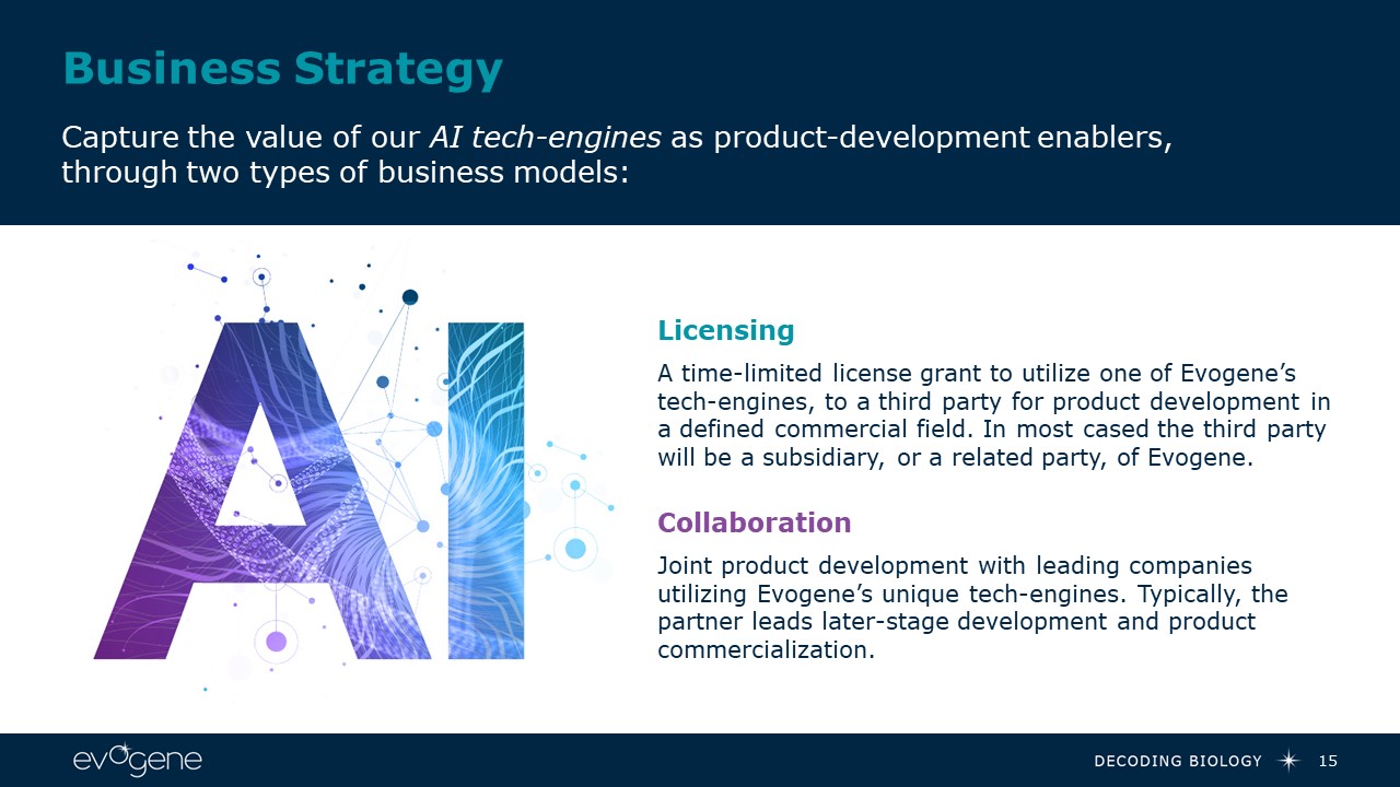 Business Strategy  15  Capture the value of our AI tech-engines as product-development enablers, through two types of business models:  Joint product development with leading companies utilizing Evogene’s unique tech-engines. Typically, the partner leads later-stage development and product commercialization.  Collaboration  A time-limited license grant to utilize one of Evogene’s tech-engines, to a third party for product development in a defined commercial field. In most cased the third party will be a subsidiary, or a related party, of Evogene.   Licensing