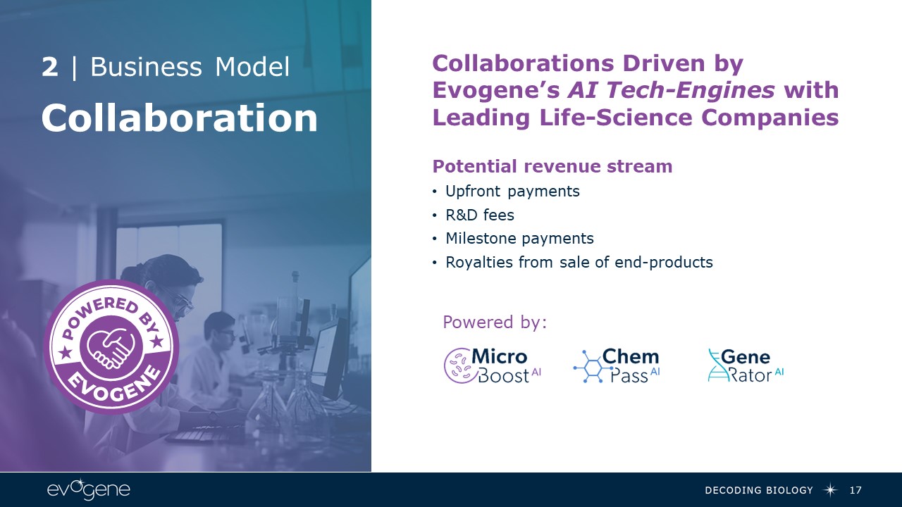 16  Licensing  1 | Business Model   Licensing Evogene’s AI Tech-Engines to a third party (currently, all Evogene subsidiaries)   Potential revenue stream   License fees & R&D reimbursement   Dividends to Evogene as a shareholder   Significant one-time-payment upon an exit event*      Powered by:  *As long as Evogene remains a major shareholder