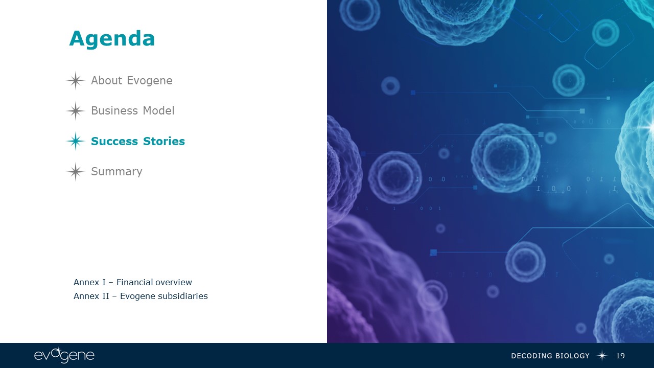 Agenda  19  Annex I – Financial overview  Annex II – Evogene subsidiaries  Success Stories  Business Model  Summary  About Evogene