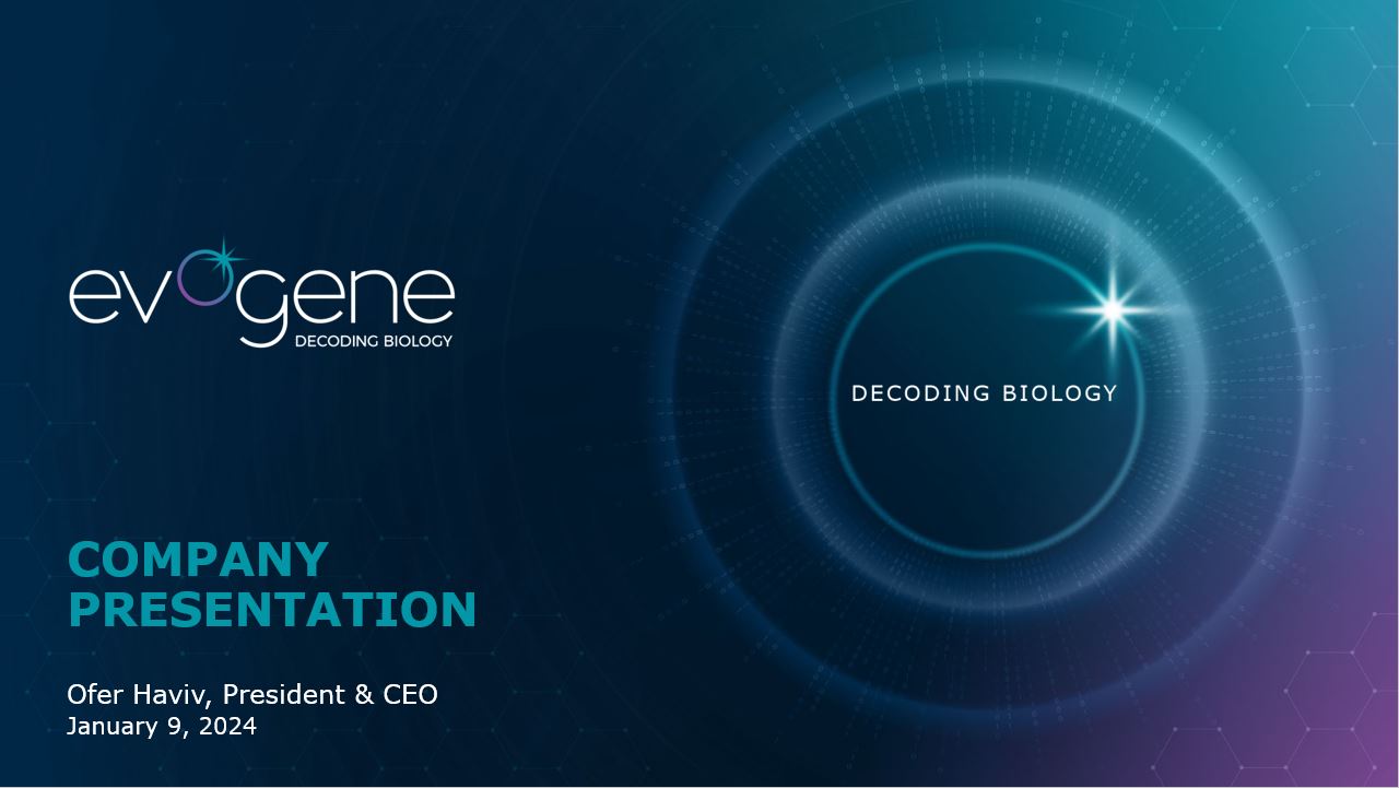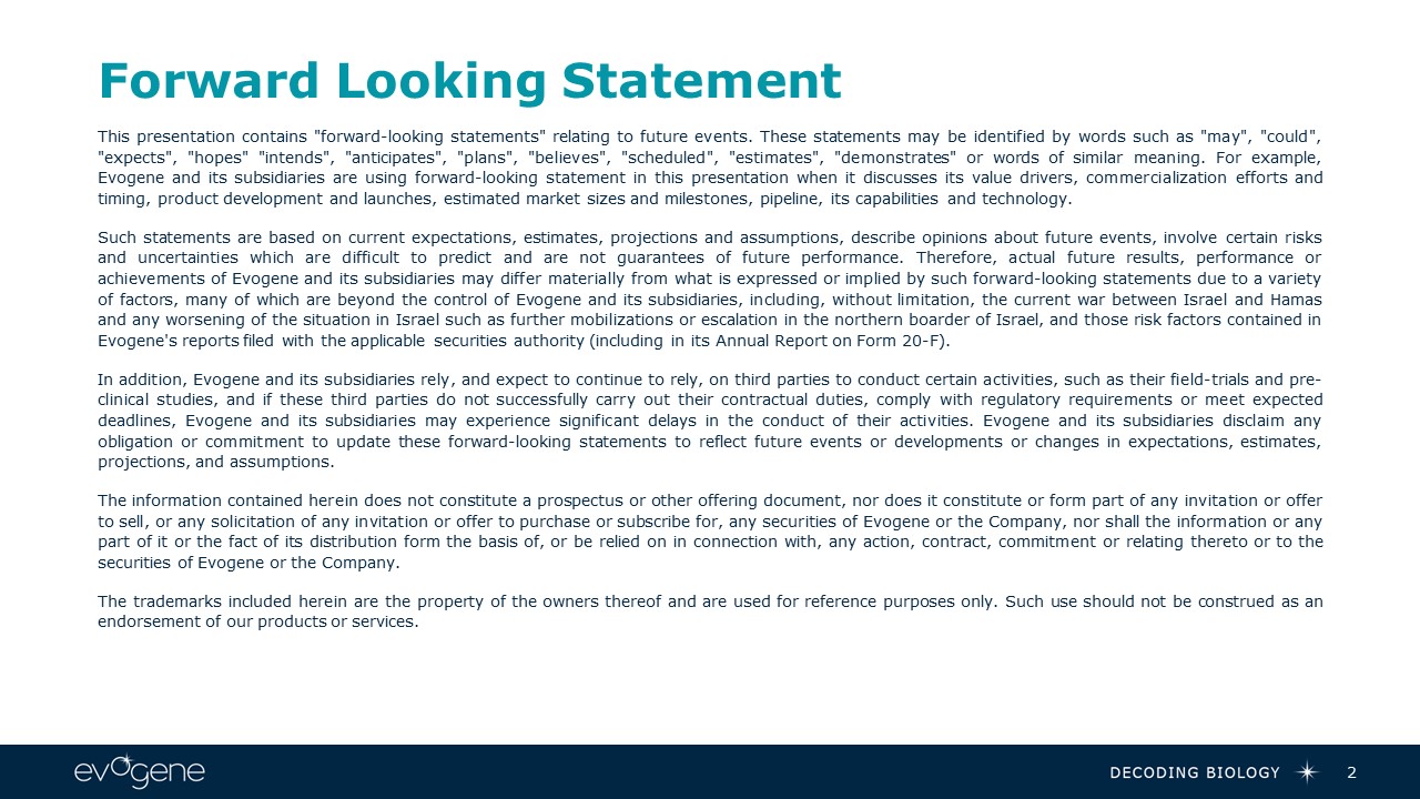 Forward Looking Statement  This presentation contains "forward-looking statements" relating to future events. These statements may be identified by words such as "may", "could", "expects", "hopes" "intends", "anticipates", "plans", "believes", "scheduled", "estimates", "demonstrates" or words of similar meaning. For example, Evogene and its subsidiaries are using forward-looking statement in this presentation when it discusses its value drivers, commercialization efforts and timing, product development and launches, estimated market sizes and milestones, pipeline, its capabilities and technology.   Such statements are based on current expectations, estimates, projections and assumptions, describe opinions about future events, involve certain risks and uncertainties which are difficult to predict and are not guarantees of future performance. Therefore, actual future results, performance or achievements of Evogene and its subsidiaries may differ materially from what is expressed or implied by such forward-looking statements due to a variety of factors, many of which are beyond the control of Evogene and its subsidiaries, including, without limitation, the current war between Israel and Hamas and any worsening of the situation in Israel such as further mobilizations or escalation in the northern boarder of Israel, and those risk factors contained in Evogene's reports filed with the applicable securities authority (including in its Annual Report on Form 20-F).   In addition, Evogene and its subsidiaries rely, and expect to continue to rely, on third parties to conduct certain activities, such as their field-trials and pre-clinical studies, and if these third parties do not successfully carry out their contractual duties, comply with regulatory requirements or meet expected deadlines, Evogene and its subsidiaries may experience significant delays in the conduct of their activities. Evogene and its subsidiaries disclaim any obligation or commitment to update these forward-looking statements to reflect future events or developments or changes in expectations, estimates, projections, and assumptions.  The information contained herein does not constitute a prospectus or other offering document, nor does it constitute or form part of any invitation or offer to sell, or any solicitation of any invitation or offer to purchase or subscribe for, any securities of Evogene or the Company, nor shall the information or any part of it or the fact of its distribution form the basis of, or be relied on in connection with, any action, contract, commitment or relating thereto or to the securities of Evogene or the Company.  The trademarks included herein are the property of the owners thereof and are used for reference purposes only. Such use should not be construed as an endorsement of our products or services.  2