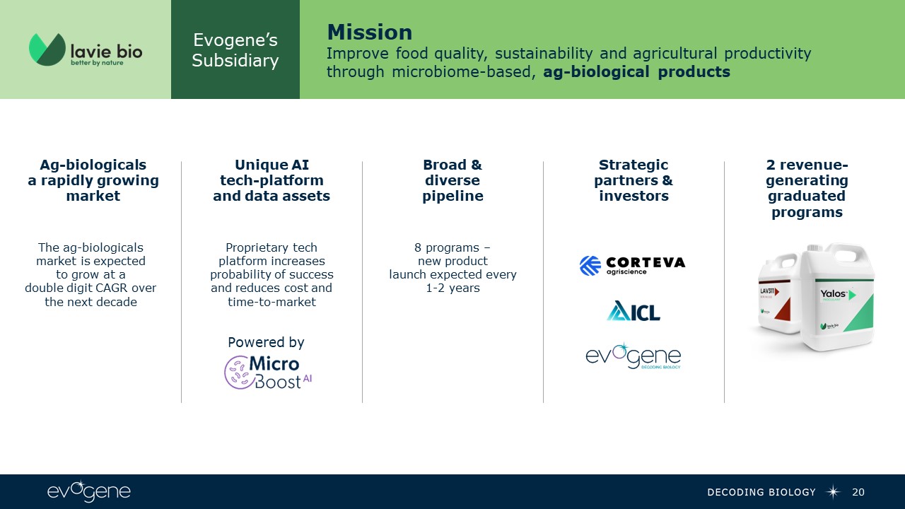 Evogene’s Subsidiary  Mission  Improve food quality, sustainability and agricultural productivitythrough microbiome-based, ag-biological products  20  Ag-biologicals   a rapidly growingmarket  Unique AI tech-platform and data assets  Broad &diversepipeline  8 programs –new product launch expected every 1-2 years  Proprietary tech platform increases probability of success and reduces cost and time-to-market   The ag-biologicals market is expected to grow at a double digit CAGR over the next decade  Strategic partners & investors  2 revenue-generating graduated programs  Powered by