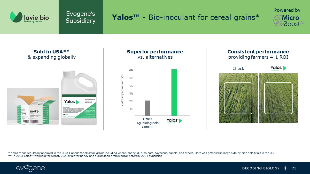 Evogene’s Subsidiary  Yalos™ - Bio-inoculant for cereal grains*  Sold in USA**& expanding globally  Superior performancevs. alternatives  Consistent performance providing farmers 4:1 ROI   Check  2%  1%  3%  4%  6%  Other Ag-biologicals Control  Yield improvement (%)   5%  * Yalos™ has regulatory approval in the US & Canada for all small grains including wheat, barley, durum, oats, soybeans, canola, and others. Data was gathered in large side-by-side field trials in the US  ** In 2023 Yalos™ was sold for wheat. 2023 trials for barley and durum look promising for potential 2024 expansion  Powered by  21