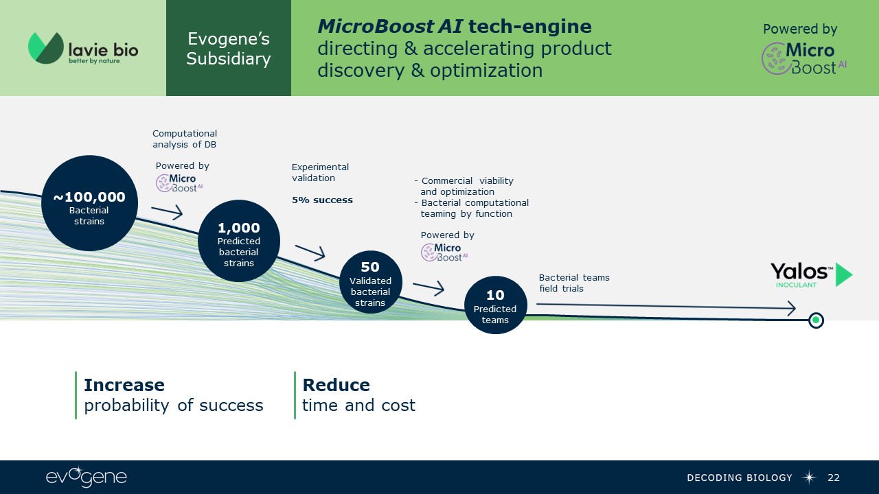 Evogene’s Subsidiary  MicroBoost AI tech-engine directing & accelerating product discovery & optimization  Powered by  Computational analysis of DB  ~100,000  Bacterialstrains  1,000 Predicted  bacterial strains  50 Validated  bacterialstrains  10 Predicted  teams  Powered by  Experimental validation  5% success  - Commercial viability and optimization  - Bacterial computational teaming by function  Powered by  Bacterial teams field trials  Increaseprobability of success  Reducetime and cost  22