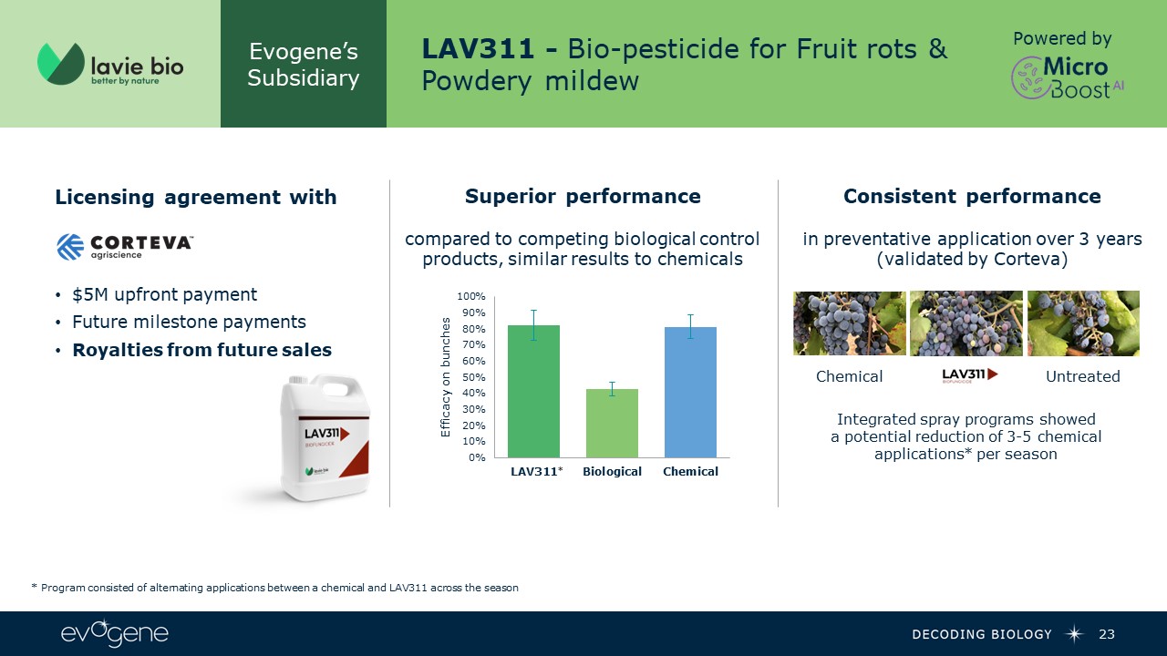*  Evogene’s Subsidiary  LAV311 - Bio-pesticide for Fruit rots & Powdery mildew  Licensing agreement with  $5M upfront payment  Future milestone payments  Royalties from future sales  Superior performance compared to competing biological control products, similar results to chemicals  Consistent performance in preventative application over 3 years (validated by Corteva)  * Program consisted of alternating applications between a chemical and LAV311 across the season  Powered by  Untreated   Chemical   Integrated spray programs showed a potential reduction of 3-5 chemical applications* per season  23