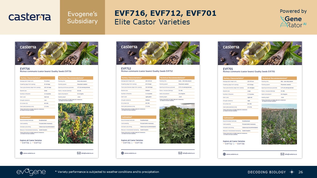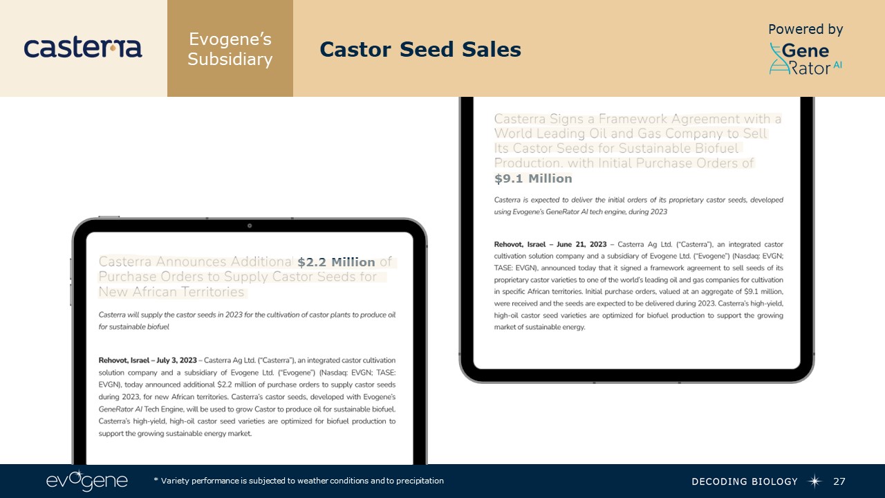Evogene’s Subsidiary  EVF716, EVF712, EVF701   Elite Castor Varieties   26  Powered by  * Variety performance is subjected to weather conditions and to precipitation