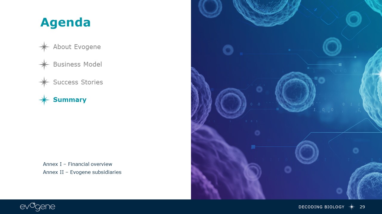 Agenda  29  Annex I – Financial overview  Annex II – Evogene subsidiaries  Business Model  Summary  About Evogene  Success Stories