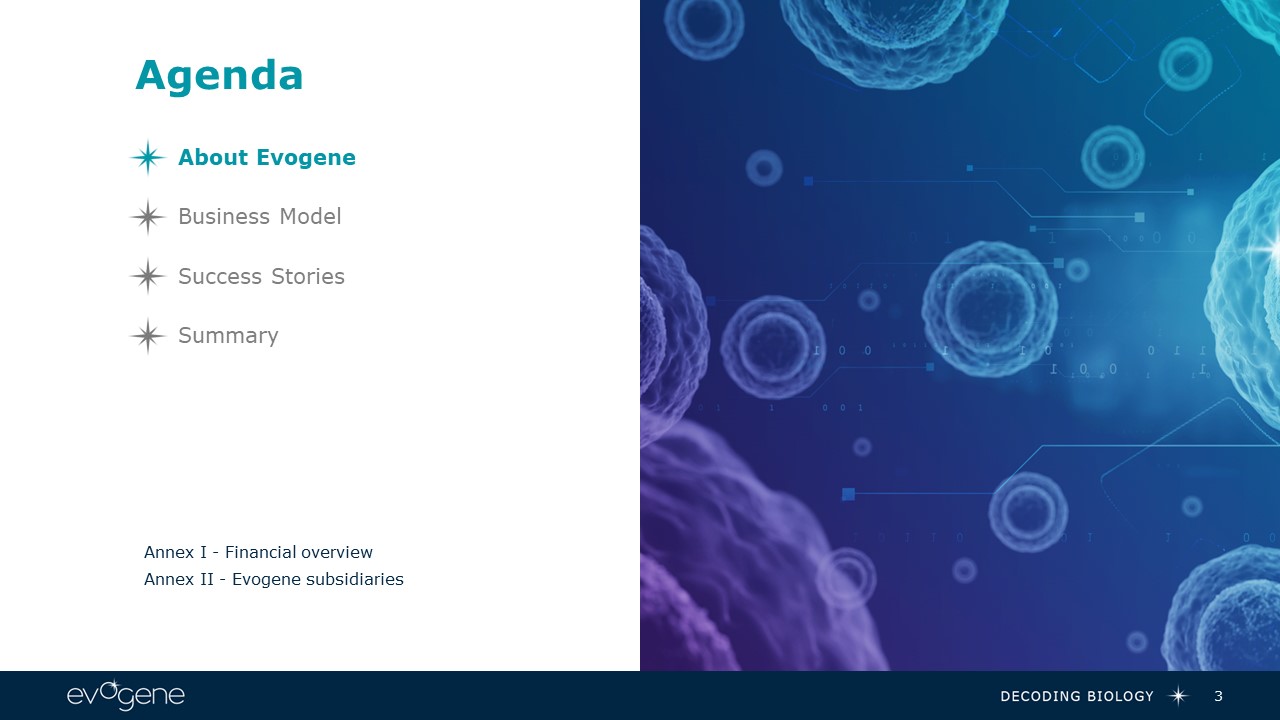 Agenda  3  About Evogene  Annex I - Financial overview  Annex II - Evogene subsidiaries  Success Stories  Business Model  Summary