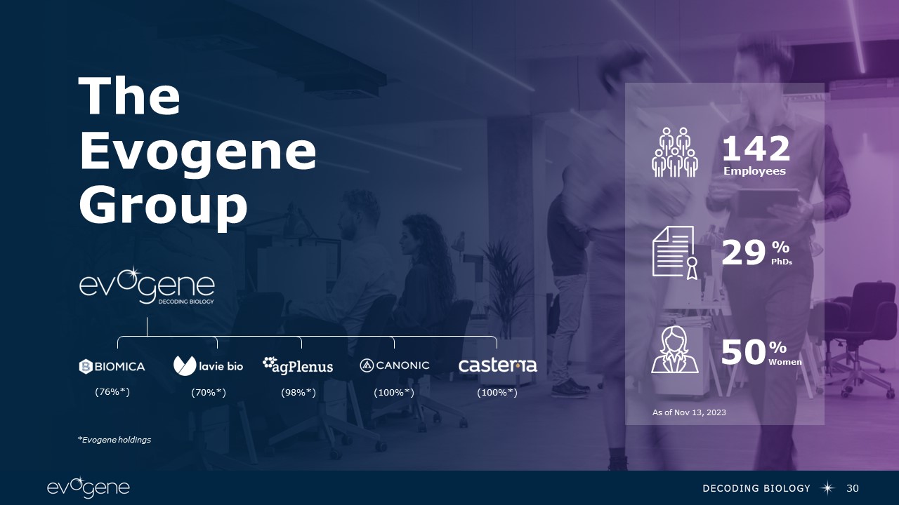 30  As of Nov 13, 2023  142  Employees  29  %  PhDs  50  %  Women  TheEvogene  Group  (98%*)  (100%*)  (100%*)  (70%*)  (76%*)  *Evogene holdings