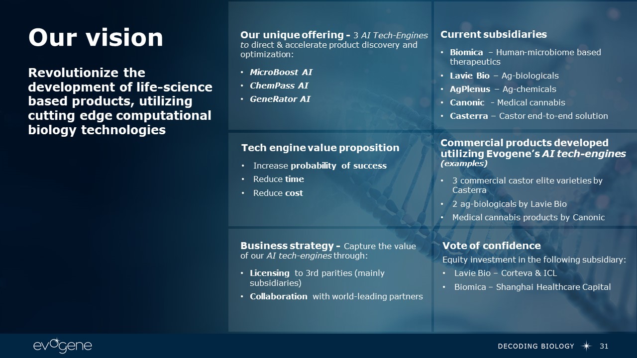 Our vision  31  Revolutionize the development of life-science based products, utilizing cutting edge computational biology technologies  Our unique offering - 3 AI Tech-Engines to direct & accelerate product discovery and optimization:  MicroBoost AI  ChemPass AI  GeneRator AI  Current subsidiaries  Biomica – Human-microbiome based therapeutics  Lavie Bio – Ag-biologicals  AgPlenus – Ag-chemicals  Canonic - Medical cannabis  Casterra – Castor end-to-end solution  Vote of confidence   Equity investment in the following subsidiary:  Lavie Bio – Corteva & ICL  Biomica – Shanghai Healthcare Capital  Business strategy - Capture the value of our AI tech-engines through:  Licensing to 3rd parities (mainly subsidiaries)  Collaboration with world-leading partners  Tech engine value proposition   Increase probability of success   Reduce time  Reduce cost  Commercial products developed utilizing Evogene’s AI tech-engines (examples)  3 commercial castor elite varieties by Casterra  2 ag-biologicals by Lavie Bio   Medical cannabis products by Canonic