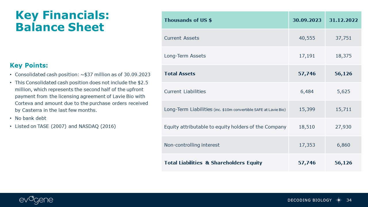 Key Financials:Balance Sheet  Key Points:  Consolidated cash position: ~$37 million as of 30.09.2023  This Consolidated cash position does not include the $2.5 million, which represents the second half of the upfront payment from the licensing agreement of Lavie Bio with Corteva and amount due to the purchase orders received by Casterra in the last few months.   No bank debt  Listed on TASE (2007) and NASDAQ (2016)  34  Thousands of US $  30.09.2023  31.12.2022  Current Assets  40,555  37,751  Long-Term Assets  17,191  18,375  Total Assets  57,746  56,126  Current Liabilities  6,484  5,625  Long-Term Liabilities (inc. $10m convertible SAFE at Lavie Bio)  15,399  15,711  Equity attributable to equity holders of the Company  18,510  27,930  Non-controlling interest   17,353  6,860  Total Liabilities & Shareholders Equity  57,746  56,126  34