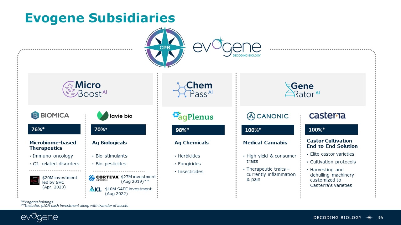 *Evogene holdings  **Includes $10M cash investment along with transfer of assets  Microbiome-basedTherapeutics  Immuno-oncology  GI- related disorders  Ag Biologicals  Bio-stimulants  Bio-pesticides  76%*  70%*  Ag Chemicals  Herbicides  Fungicides  Insecticides  Medical Cannabis  High yield & consumer traits  Therapeutic traits – currently inflammation & pain  98%*  100%*  100%*  Evogene Subsidiaries  $10M SAFE investment (Aug 2022)  $27M investment (Aug 2019)**  $20M investmentled by SHC (Apr. 2023)   Castor Cultivation End-to-End Solution  Elite castor varieties  Cultivation protocols  Harvesting and dehulling machinery customized to Casterra’s varieties  36