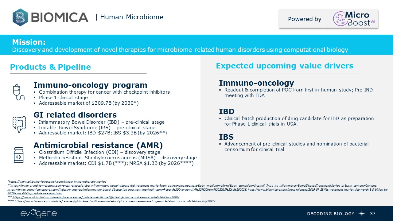37  Immuno-oncology program  Combination therapy for cancer with checkpoint inhibitors  Phase 1 clinical stage  Addressable market of $309.7B (by 2030*)  GI related disorders  Inflammatory Bowel Disorder (IBD) – pre-clinical stage  Irritable Bowel Syndrome (IBS) – pre-clinical stage  Addressable market: IBD $27B; IBS $3.3B (by 2026**)  Antimicrobial resistance (AMR)  Clostridium Difficile Infection (CDI) – discovery stage  Methicillin-resistant Staphylococcus aureus (MRSA) – discovery stage  Addressable market: CDI $1.7B (***); MRSA $1.3B (by 2026****)  Mission:Discovery and development of novel therapies for microbiome-related human disorders using computational biology  Products & Pipeline  | Human Microbiome  *https://www.alliedmarketresearch.com/cancer-immunotherapy-market  **https://www.grandviewresearch.com/press-release/global-inflammatory-bowel-disease-ibd-treatment-market?utm_source=blog.goo.ne.jp&utm_medium=referral&utm_campaign=Vrushali_7Aug_hc_InflammatoryBowelDiseaseTreatmentMarket_pr&utm_content=Content; https://www.grandviewresearch.com/industry-analysis/inflammatory-bowel-disease-ibd-treatment-market#:~:text=Report%20Overview,4.4%25%20from%202018%20to%202026, https://www.bloomberg.com/press-releases/2019-07-23/ibs-treatment-market-size-worth-3-3-billion-by-2026-cagr-10-1-grand-view-research-inc  *** https://www.globaldata.com/media/press-release/global-clostridium-difficile-infections-market-approach-1-7-billion-2026/  **** https://www.biospace.com/article/releases/global-methicillin-resistant-staphylococcus-aureus-mrsa-drugs-market-to-surpass-us-1-3-billion-by-2026/  Expected upcoming value drivers  Powered by  Immuno-oncology  Readout & completion of POC from first in-human study; Pre-IND meeting with FDA  IBD  Clinical batch production of drug candidate for IBD as preparation for Phase 1 clinical trials in USA.  IBS  Advancement of pre-clinical studies and nomination of bacterial consortium for clinical trial