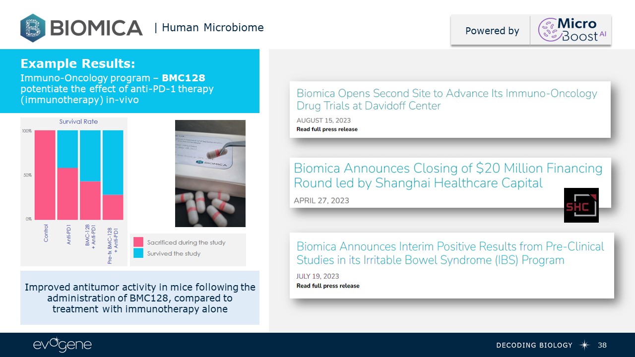 38  Example Results:   Improved antitumor activity in mice following the administration of BMC128, compared to treatment with immunotherapy alone  Immuno-Oncology program – BMC128 potentiate the effect of anti-PD-1 therapy (immunotherapy) in-vivo  | Human Microbiome  Powered by
