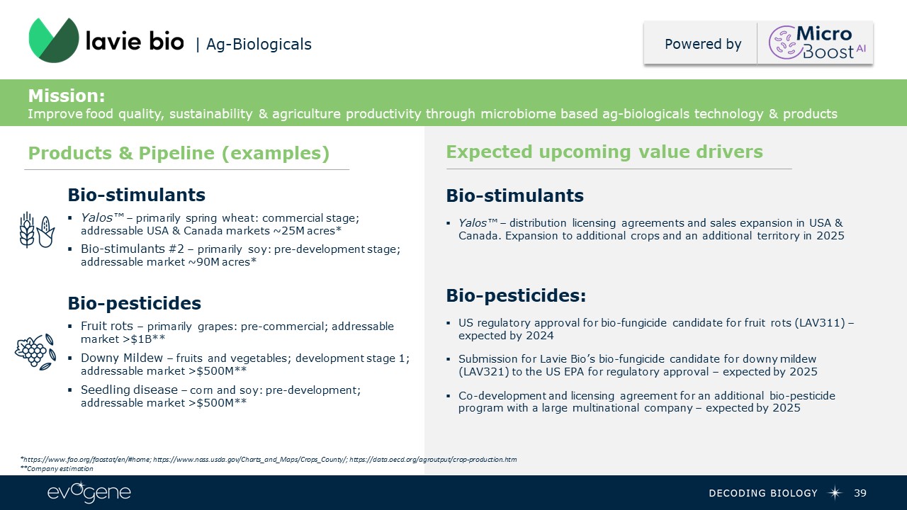 39  | Ag-Biologicals  Bio-stimulants  Yalos™ – primarily spring wheat: commercial stage; addressable USA & Canada markets ~25M acres*  Bio-stimulants #2 – primarily soy: pre-development stage; addressable market ~90M acres*  Bio-pesticides  Fruit rots – primarily grapes: pre-commercial; addressable market >$1B**  Downy Mildew – fruits and vegetables; development stage 1; addressable market >$500M**  Seedling disease – corn and soy: pre-development; addressable market >$500M**  Products & Pipeline (examples)  *https://www.fao.org/faostat/en/#home; https://www.nass.usda.gov/Charts_and_Maps/Crops_County/; https://data.oecd.org/agroutput/crop-production.htm  **Company estimation  Powered by  Mission:   Improve food quality, sustainability & agriculture productivity through microbiome based ag-biologicals technology & products  Expected upcoming value drivers  Bio-stimulants  Yalos™ – distribution licensing agreements and sales expansion in USA & Canada. Expansion to additional crops and an additional territory in 2025  Bio-pesticides:  US regulatory approval for bio-fungicide candidate for fruit rots (LAV311) – expected by 2024  Submission for Lavie Bio’s bio-fungicide candidate for downy mildew (LAV321) to the US EPA for regulatory approval – expected by 2025  Co-development and licensing agreement for an additional bio-pesticide program with a large multinational company – expected by 2025