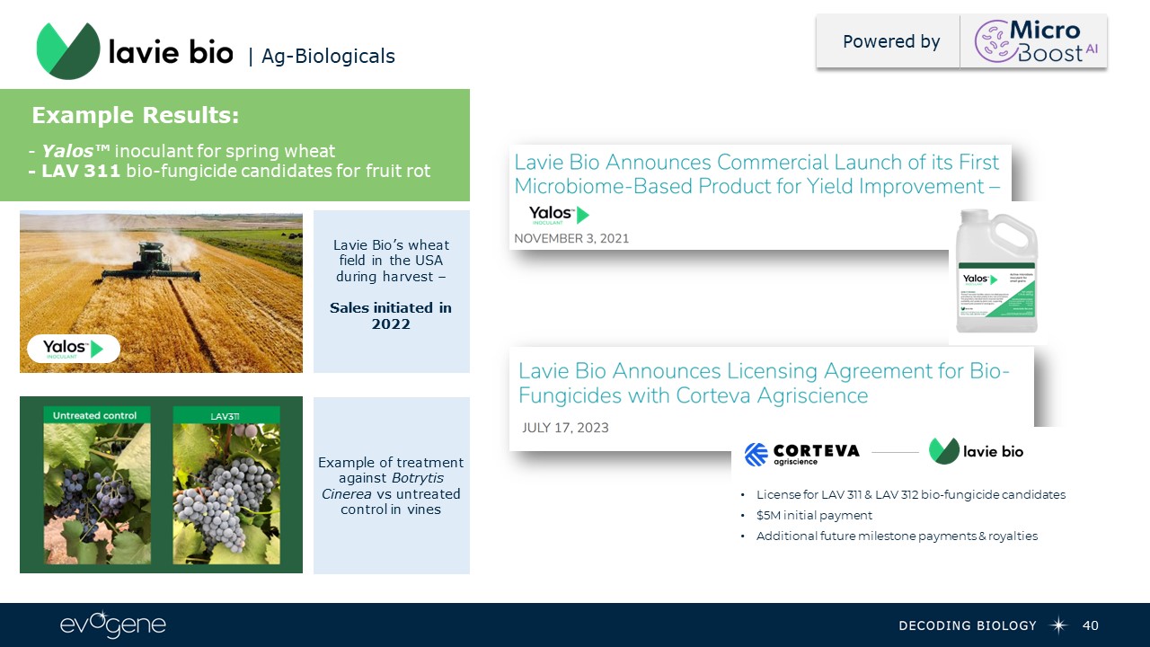 40  | Ag-Biologicals  Example of treatment against Botrytis Cinerea vs untreated control in vines  Lavie Bio’s wheat field in the USA during harvest – Sales initiated in 2022  Example Results:   - Yalos™ inoculant for spring wheat  - LAV 311 bio-fungicide candidates for fruit rot  LAV311  Powered by  License for LAV 311 & LAV 312 bio-fungicide candidates  $5M initial payment  Additional future milestone payments & royalties