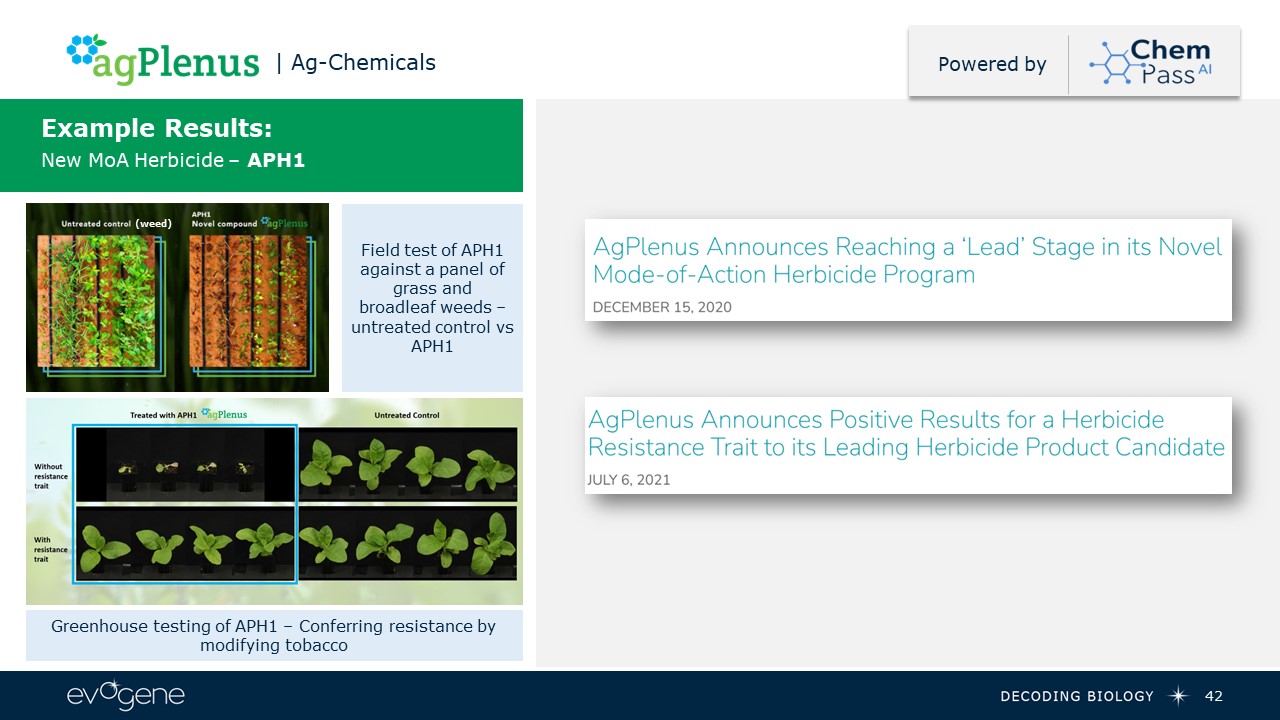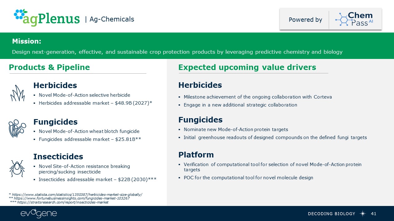 41  Products & Pipeline  | Ag-Chemicals  Expected upcoming value drivers  Powered by  Mission:Design next-generation, effective, and sustainable crop protection products by leveraging predictive chemistry and biology  Herbicides  Novel Mode-of-Action selective herbicide  Herbicides addressable market – $48.9B (2027)*   Fungicides  Novel Mode-of-Action wheat blotch fungicide  Fungicides addressable market – $25.81B**  Insecticides  Novel Site-of-Action resistance breaking piercing/sucking insecticide  Insecticides addressable market – $22B (2030)***  Herbicides  Milestone achievement of the ongoing collaboration with Corteva  Engage in a new additional strategic collaboration  Fungicides  Nominate new Mode-of-Action protein targets   Initial greenhouse readouts of designed compounds on the defined fungi targets  Platform  Verification of computational tool for selection of novel Mode-of-Action protein targets   POC for the computational tool for novel molecule design  * https://www.statista.com/statistics/1350387/herbicides-market-size-globally/  ** https://www.fortunebusinessinsights.com/fungicides-market-103267   *** https://straitsresearch.com/report/insecticides-market