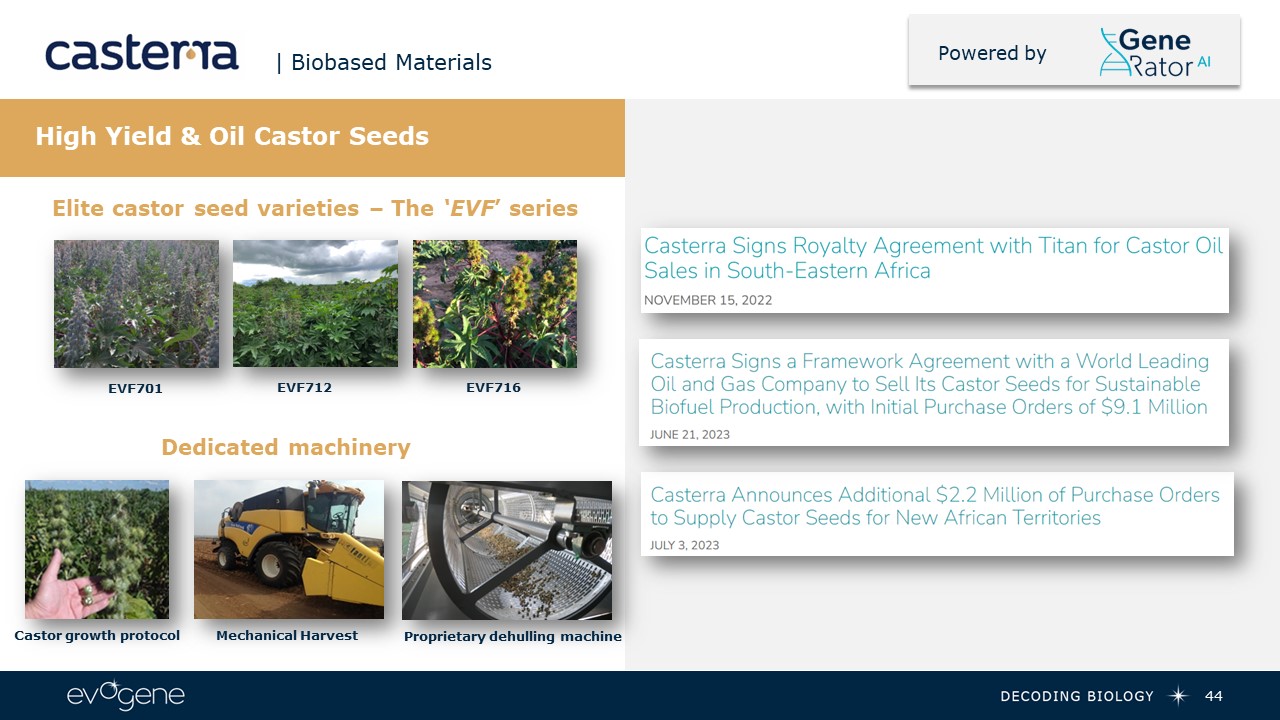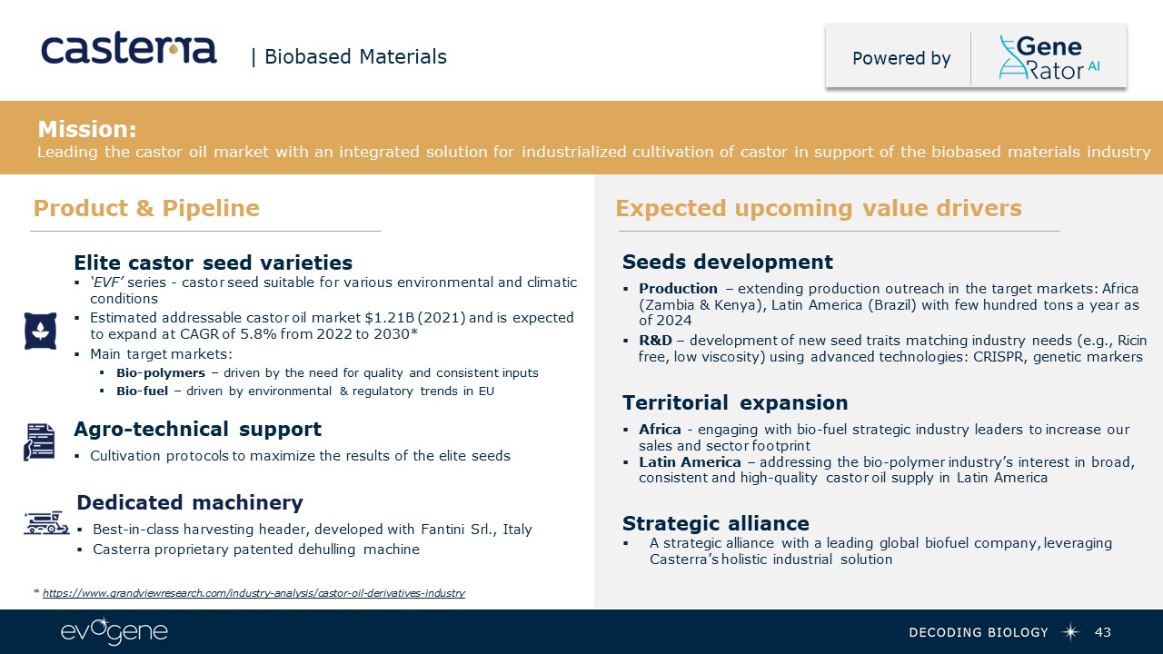 43  | Biobased Materials  Powered by  Product & Pipeline  Expected upcoming value drivers  Mission:Leading the castor oil market with an integrated solution for industrialized cultivation of castor in support of the biobased materials industry  Elite castor seed varieties   ‘EVF’ series - castor seed suitable for various environmental and climatic conditions  Estimated addressable castor oil market $1.21B (2021) and is expected to expand at CAGR of 5.8% from 2022 to 2030*  Main target markets:  Bio-polymers – driven by the need for quality and consistent inputs  Bio-fuel – driven by environmental & regulatory trends in EU  * https://www.grandviewresearch.com/industry-analysis/castor-oil-derivatives-industry   Dedicated machinery  Best-in-class harvesting header, developed with Fantini Srl., Italy  Casterra proprietary patented dehulling machine   Seeds development  Production – extending production outreach in the target markets: Africa (Zambia & Kenya), Latin America (Brazil) with few hundred tons a year as of 2024  R&D – development of new seed traits matching industry needs (e.g., Ricin free, low viscosity) using advanced technologies: CRISPR, genetic markers   Territorial expansion  Africa - engaging with bio-fuel strategic industry leaders to increase our sales and sector footprint  Latin America – addressing the bio-polymer industry’s interest in broad, consistent and high-quality castor oil supply in Latin America  Strategic alliance  A strategic alliance with a leading global biofuel company, leveraging Casterra’s holistic industrial solution  Agro-technical support  Cultivation protocols to maximize the results of the elite seeds