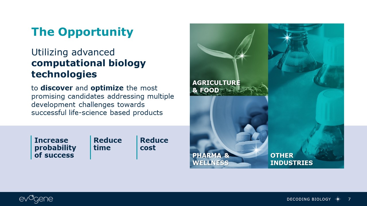 Utilizing advanced computational biology technologies  to discover and optimize the most promising candidates addressing multiple development challenges towards successful life-science based products  The Opportunity  PHARMA & WELLNESS  AGRICULTURE & FOOD  Other Industries  Increase probability of success   Reduce time   Reduce cost   7