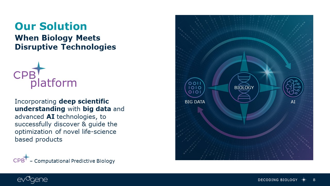 Our Solution   8  platform  Incorporating deep scientific understanding with big data and advanced AI technologies, to successfully discover & guide the optimization of novel life-science based products  – Computational Predictive Biology  BIG DATA  BIOLOGY  AI  When Biology MeetsDisruptive Technologies