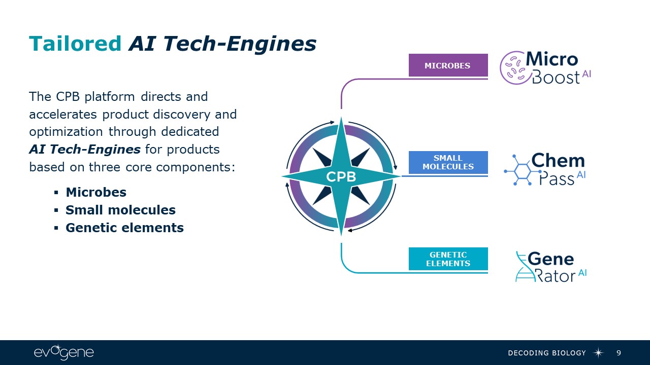 Tailored AI Tech-Engines  9  The CPB platform directs and accelerates product discovery and optimization through dedicated AI Tech-Engines for products based on three core components:  Microbes  Small molecules   Genetic elements   MICROBES   GENETIC ELEMENTS  SMALL MOLECULES