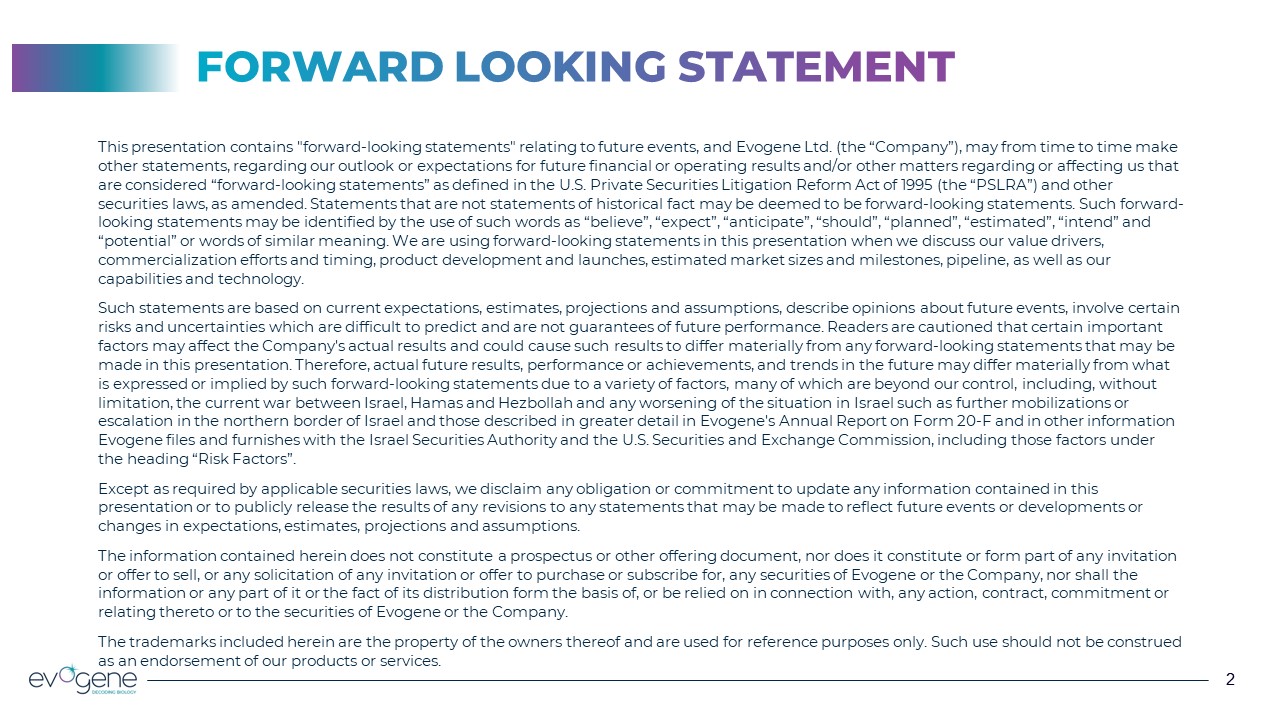 2  FORWARD LOOKING STATEMENT  This presentation contains "forward-looking statements" relating to future events, and Evogene Ltd. (the “Company”), may from time to time make other statements, regarding our outlook or expectations for future financial or operating results and/or other matters regarding or affecting us that are considered “forward-looking statements” as defined in the U.S. Private Securities Litigation Reform Act of 1995 (the “PSLRA”) and other securities laws, as amended. Statements that are not statements of historical fact may be deemed to be forward-looking statements. Such forward-looking statements may be identified by the use of such words as “believe”, “expect”, “anticipate”, “should”, “planned”, “estimated”, “intend” and “potential” or words of similar meaning. We are using forward-looking statements in this presentation when we discuss our value drivers, commercialization efforts and timing, product development and launches, estimated market sizes and milestones, pipeline, as well as our capabilities and technology.   Such statements are based on current expectations, estimates, projections and assumptions, describe opinions about future events, involve certain risks and uncertainties which are difficult to predict and are not guarantees of future performance. Readers are cautioned that certain important factors may affect the Company's actual results and could cause such results to differ materially from any forward-looking statements that may be made in this presentation. Therefore, actual future results, performance or achievements, and trends in the future may differ materially from what is expressed or implied by such forward-looking statements due to a variety of factors, many of which are beyond our control, including, without limitation, the current war between Israel, Hamas and Hezbollah and any worsening of the situation in Israel such as further mobilizations or escalation in the northern border of Israel and those described in greater detail in Evogene's Annual Report on Form 20-F and in other information Evogene files and furnishes with the Israel Securities Authority and the U.S. Securities and Exchange Commission, including those factors under the heading “Risk Factors”.   Except as required by applicable securities laws, we disclaim any obligation or commitment to update any information contained in this presentation or to publicly release the results of any revisions to any statements that may be made to reflect future events or developments or changes in expectations, estimates, projections and assumptions.  The information contained herein does not constitute a prospectus or other offering document, nor does it constitute or form part of any invitation or offer to sell, or any solicitation of any invitation or offer to purchase or subscribe for, any securities of Evogene or the Company, nor shall the information or any part of it or the fact of its distribution form the basis of, or be relied on in connection with, any action, contract, commitment or relating thereto or to the securities of Evogene or the Company.  The trademarks included herein are the property of the owners thereof and are used for reference purposes only. Such use should not be construed as an endorsement of our products or services.  2