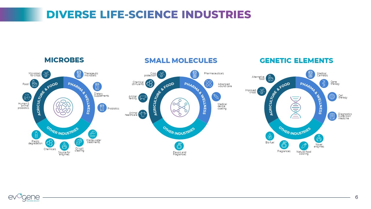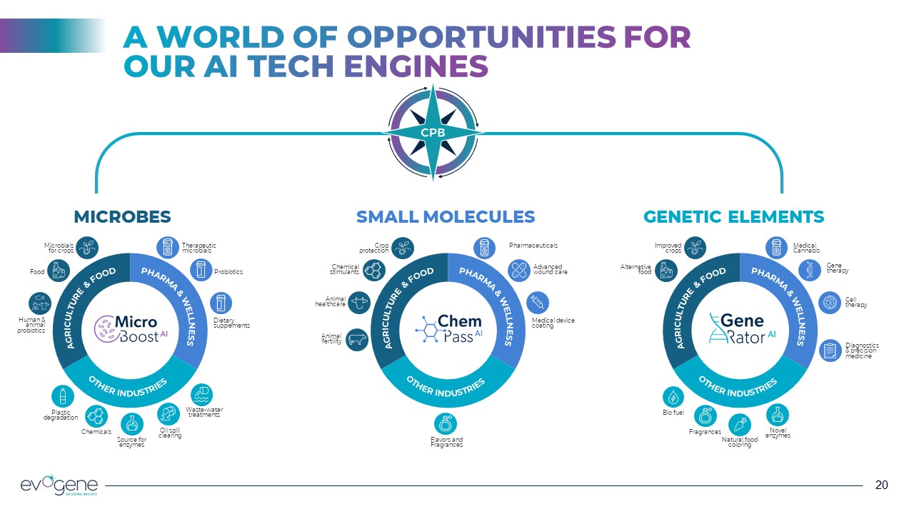 20  SMALL MOLECULES  GENETIC ELEMENTS  MICROBES  A WORLD OF OPPORTUNITIES FOR OUR AI TECH ENGINES  AGRICULTURE & FOOD  PHARMA & WELLNESS  OTHER INDUSTRIES  Improvedcrops  Alternativefood  Medical Cannabis  Genetherapy  Diagnostics  & precisionmedicine  Celltherapy  Bio fuel  Fragrances  Natural foodcoloring  Novelenzymes  AGRICULTURE & FOOD  PHARMA & WELLNESS  OTHER INDUSTRIES  Cropprotection  Chemicalstimulants  Animalfertility  Animalhealthcare  Pharmaceuticals  Advancedwound care  Medical devicecoating  Flavors and Fragrances  AGRICULTURE & FOOD  PHARMA & WELLNESS  OTHER INDUSTRIES  Plasticdegradation  Chemicals  Source forenzymes  Oil spillclearing  Waste-watertreatments  Microbialsfor crops  Food  Human &animal probiotics  Therapeuticmicrobials  Probiotics  Dietarysupplements